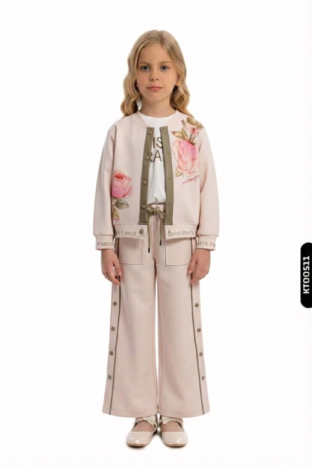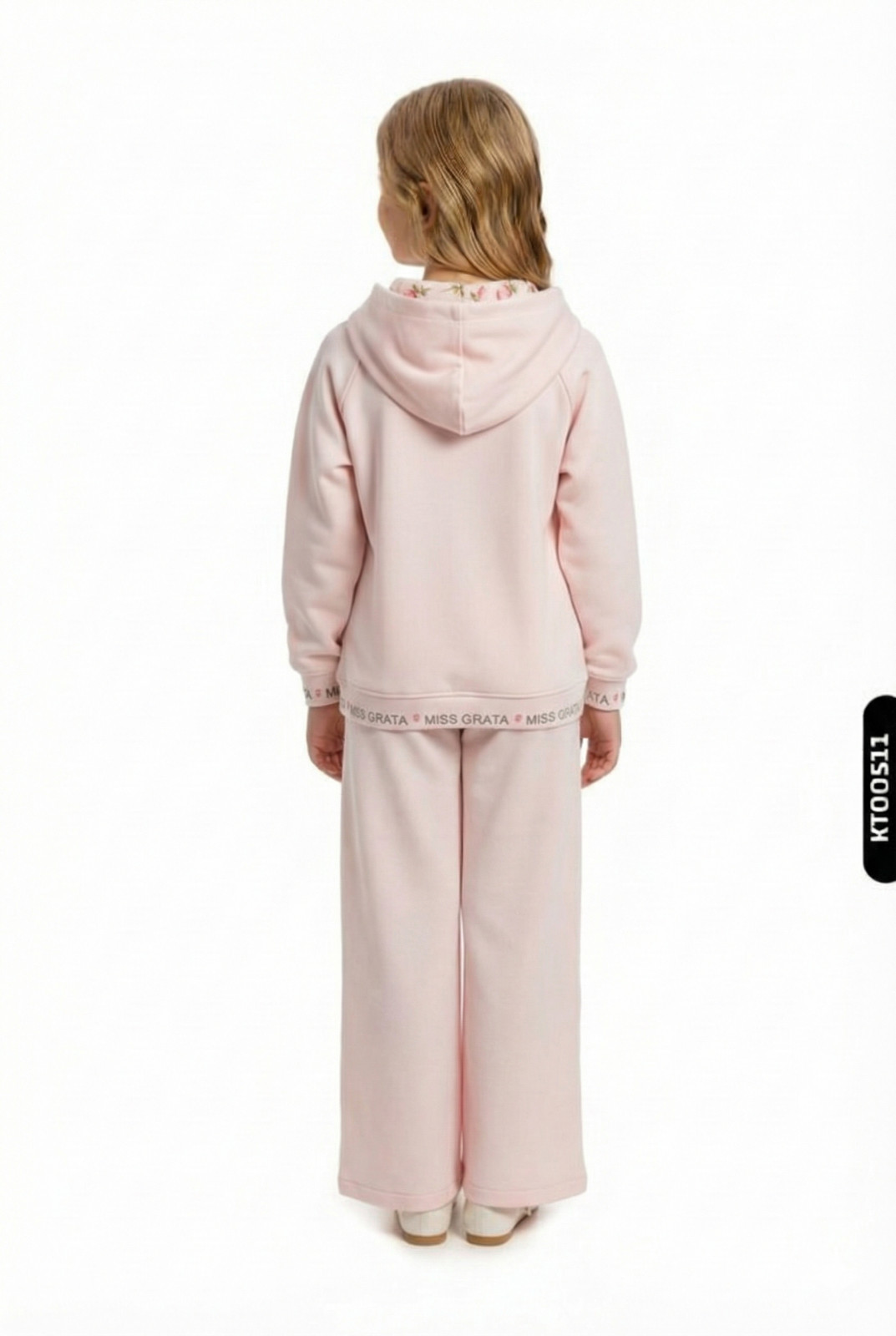 تقدم هذه الطقم الرياضي للبنات إطلالة أنيقة ومريحة لفصل الشتاء. الطقم بلون وردي ناعم، مصمم لراحة الأطفال. الجزء العلوي يحتوي على غطاء رأس، والجزء الخلفي بسيط وردي اللون، مع طبعات أزهار وأزرار ضغط في الأمام. تحتوي الأكمام والخصر على أشرطة مكتوب عليها "MISS GRATA". البنطلون واسع القصة وطوله متوسط، مزين بأزرار ضغط على الجانبين. مناسب للبنات من عمر 9 إلى 14 سنة.