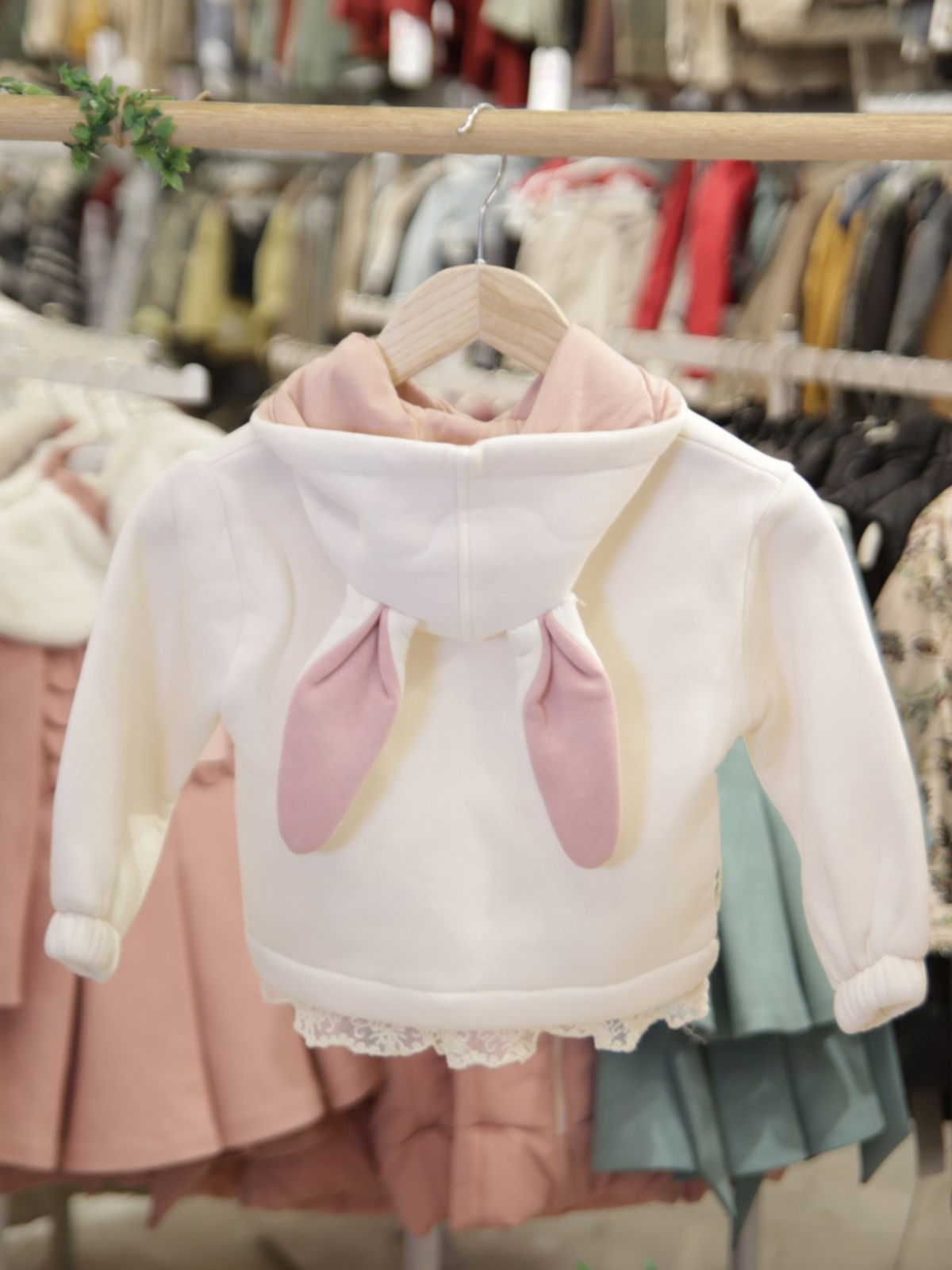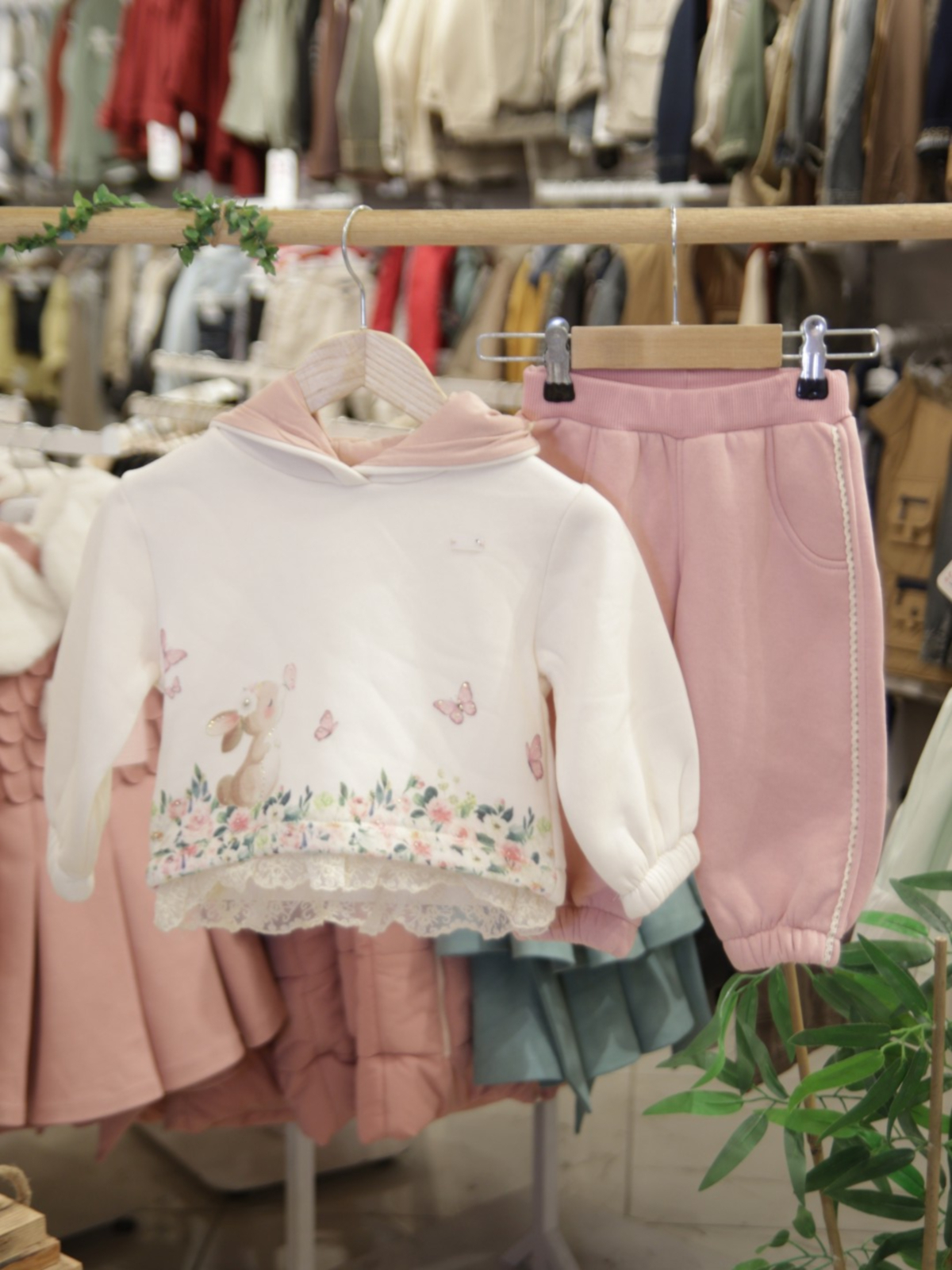 Bu kız çocuk eşofman takımı, kış aylarında rahat ve şık bir seçim sunuyor. Beyaz kapüşonlu üst kısmında sevimli bir tavşan ve kelebek baskısı yer alıyor. Kapüşonun arkasında pembe renkli, yumuşak kumaştan yapılmış tavşan kulakları bulunuyor. Üst, fermuarsız ve uzun kollu olup, alt kısmında dantel detaylarıyla süslenmiş. Alt pantolon ise pembe renkte, lastikli bilek yapısına sahip ve ceplidir.