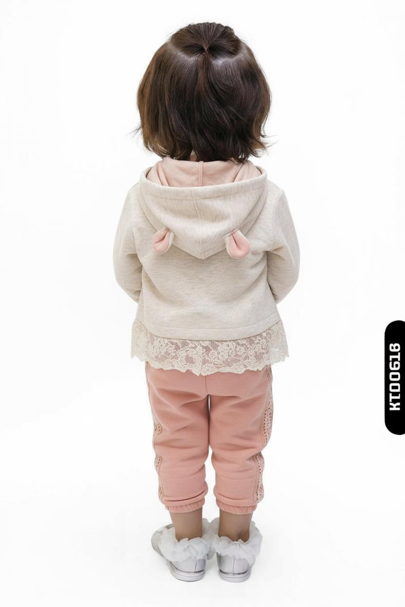 Bu kız çocuk eşofman takımı, rahatlığı ve şıklığı bir arada sunar. Kapüşonlu ve uzun kollu üst kısmı, yumuşak ve sıcak tutan kumaştan yapılmıştır. Ön yüzünde sevimli bir ayıcık figürü yer alırken, alt kısmında ince dantel detayları kıyafete zarif bir dokunuş katmaktadır. Pantolonlar ise lastikli bilek kısımları ve yanlarda simli şerit süslemeleriyle tamamlanmıştır. Takımın genelinde pastel tonlarda bej ve pudra renkleri kullanılmıştır. Kış sezonu için ideal olan bu takım, çocuklarınızın hem konforunu hem de tarzını ön planda tutar.