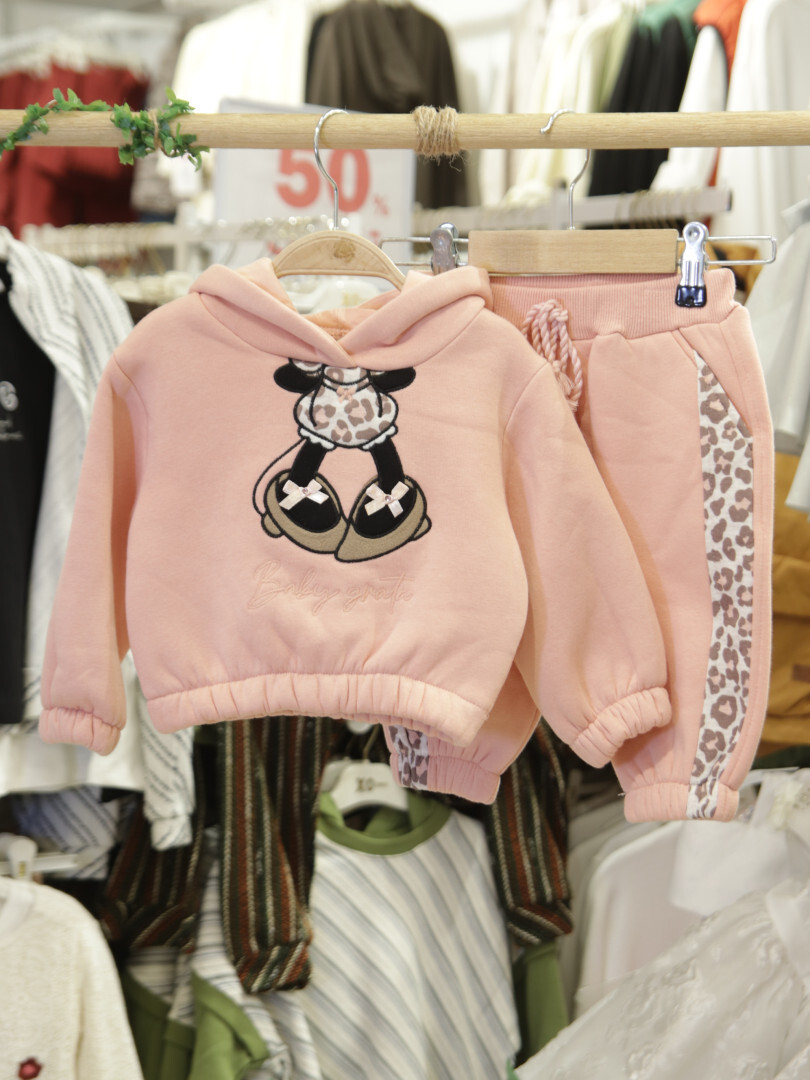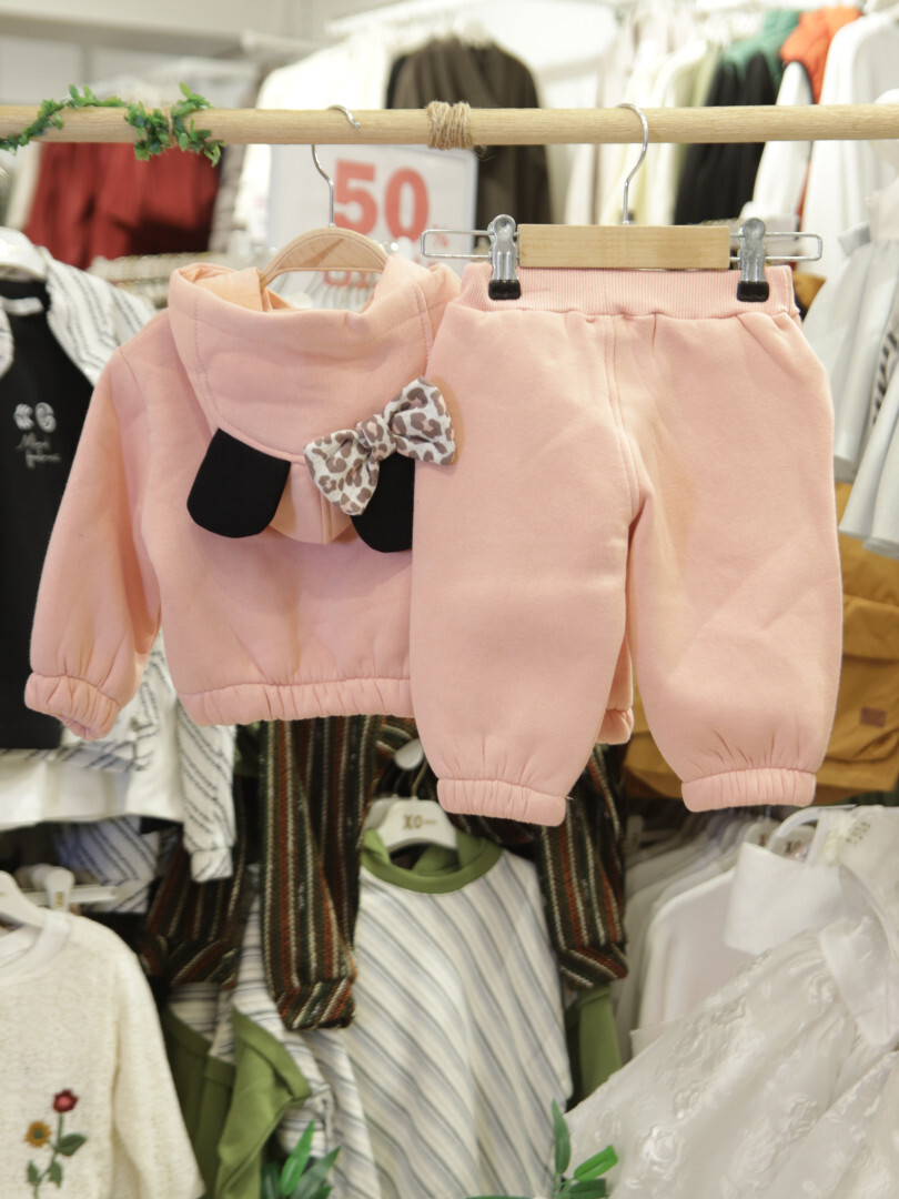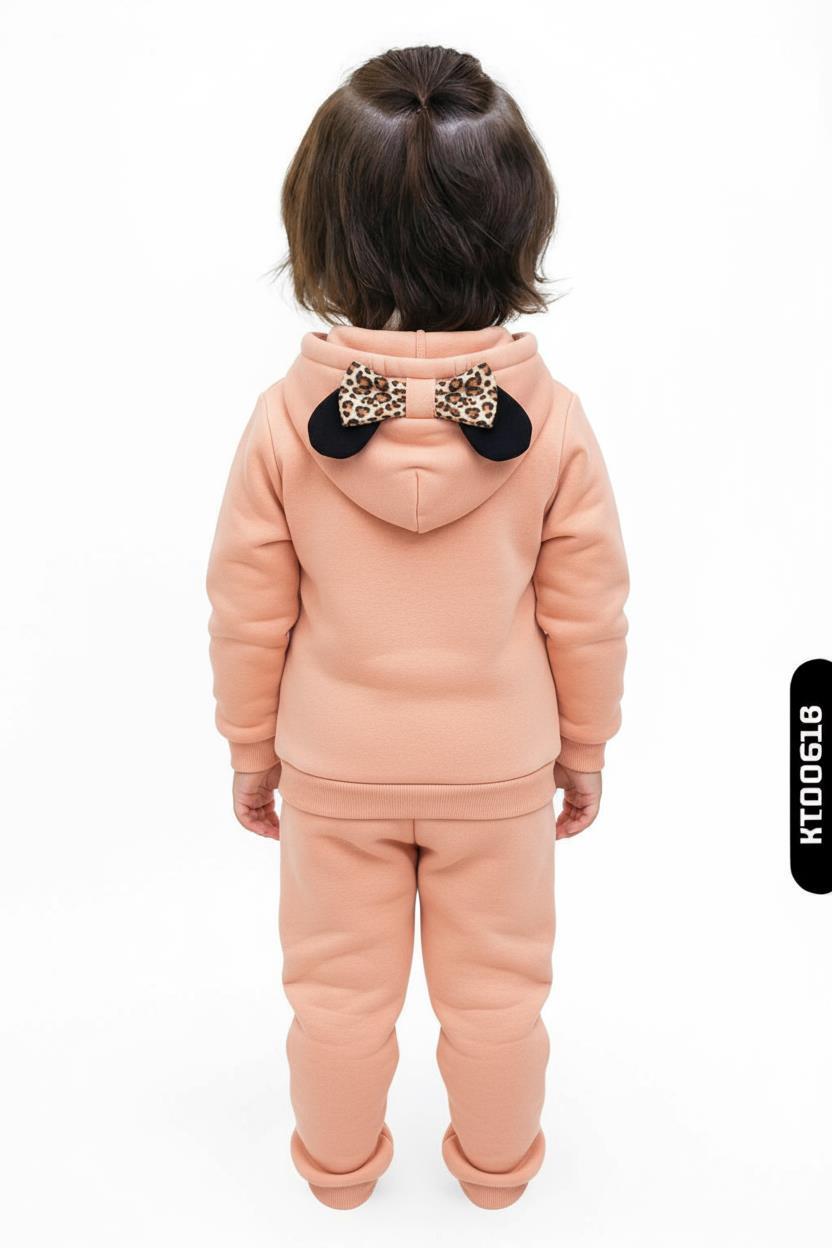 Bu kız çocuk eşofman takımı, yumuşak ve sıcak tutan kumaşı ile kış aylarında rahatlık sağlar. Kapüşonlu üst kısmı, ön yüzünde sevimli hayvan figürü baskısı ile dikkat çeker. Kapüşonun arka tarafında leopar desenli fiyonk ve siyah kulak detayları bulunmaktadır. Eşofman altı, yanları leopar desenli kumaşla süslenmiş olup, bel kısmında kordon detayı ile ayarlanabilir. Uzun kollu, kapüşonlu ve cepli tasarımı ile günlük kullanıma uygundur. Rahat kesimi ve modern detaylarıyla hem şık hem spor bir görünüm sunar.