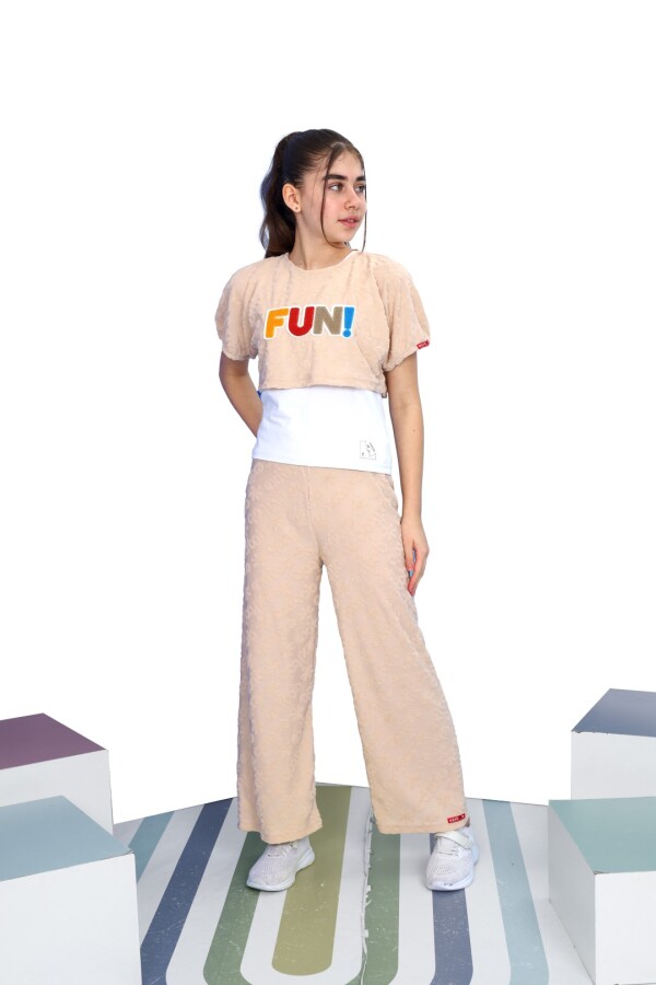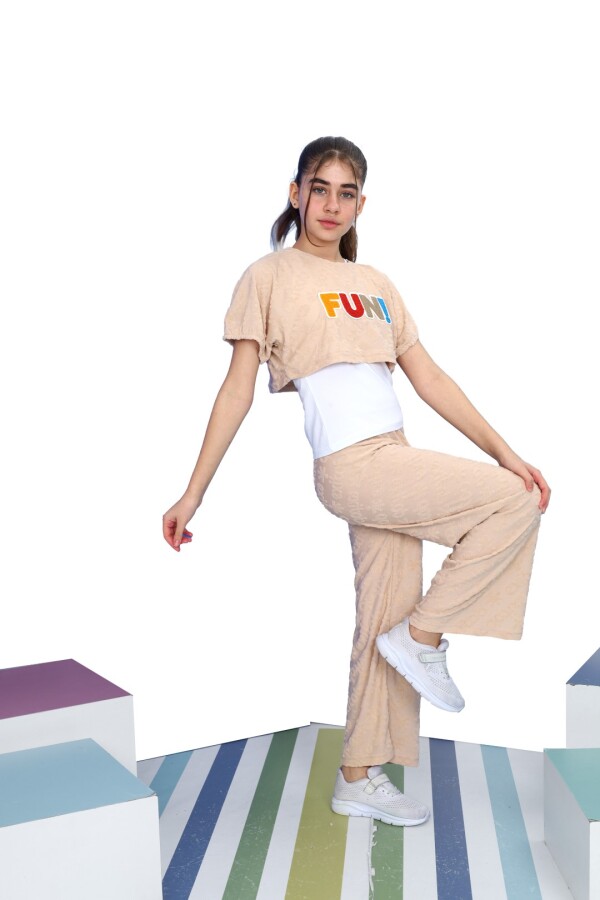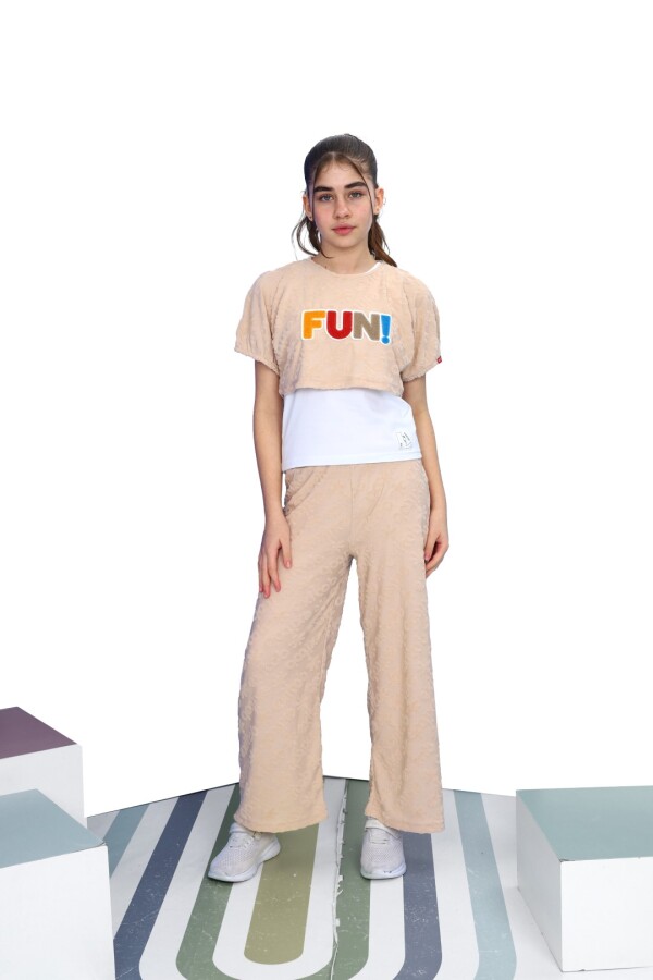 Bu kız çocuk eşofman takımı, rahatlığı ve şıklığı bir arada sunuyor. Kısa kollu ve crop kesim üstü, üzerinde renkli "FUN!" yazısı ile enerjik bir görünüm kazandırıyor. Alt kısmı bol kesim pantolon olarak tasarlanmış, esnek ve yumuşak dokusuyla hareket özgürlüğü sağlıyor. Bej tonundaki takım, hafif kabartmalı desenlere sahip olup, spor ve günlük kullanıma uygun tarzıyla dikkat çekiyor.