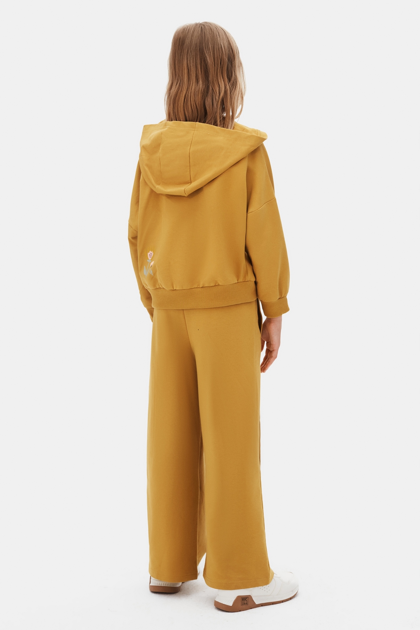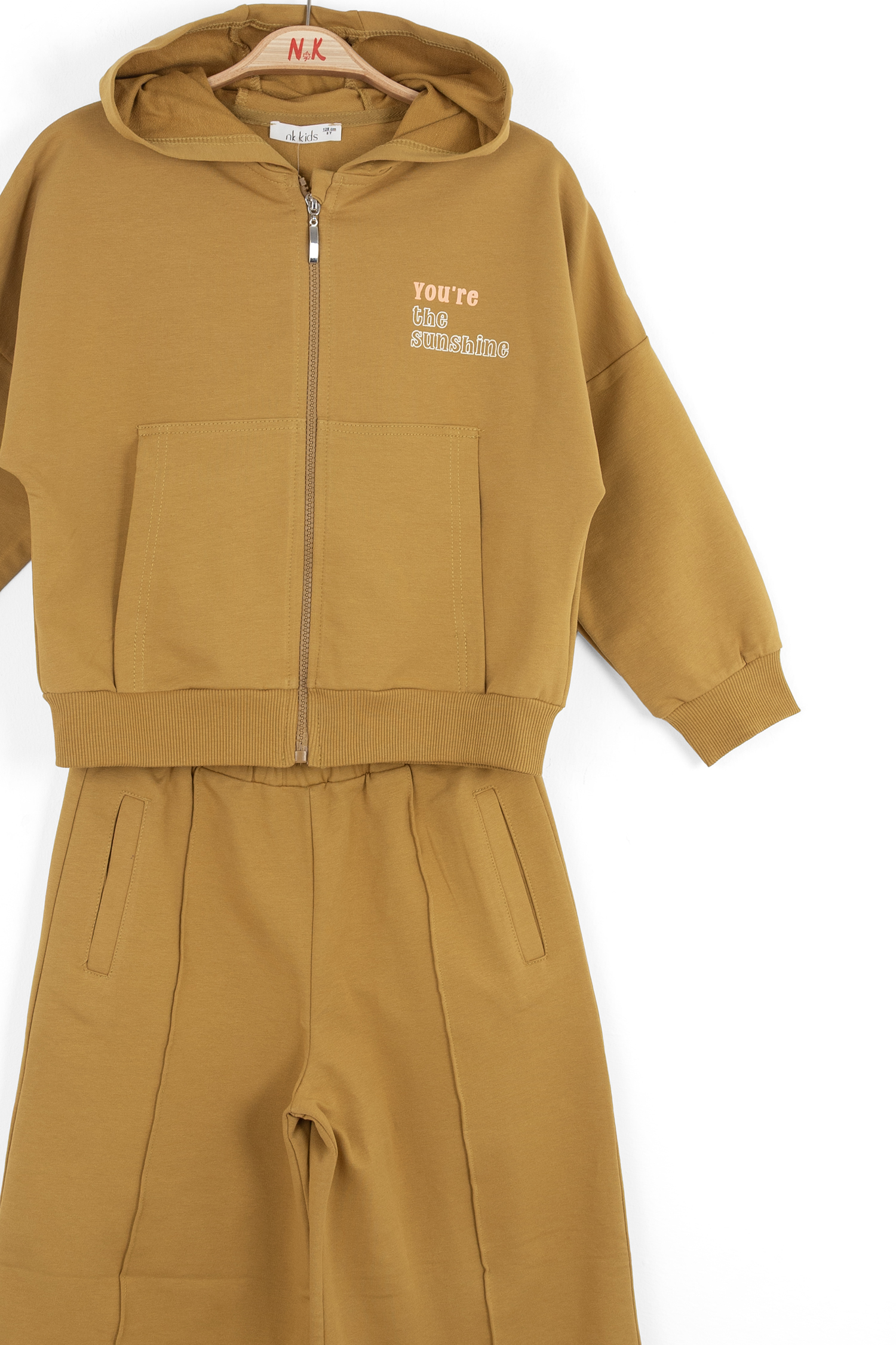 Bu kız çocuk eşofman takımı, rahatlığı ve şıklığı bir arada sunar. Kapüşonlu ve fermuarlı üstü, günlük kullanım için ideal bir seçenektir. Hardal rengi ile dikkat çeken takım, bol paça pantolonu ve beyaz, çiçekli uzun kollu tişörtü ile tamamlanmıştır. Üstteki cep detayları ve elastik bilek ile bel bantları, kullanım kolaylığı sağlar. Takım, 9-14 yaş aralığındaki çocuklar için uygundur ve spor şıklığı arayan aileler için mükemmel bir tercihtir.