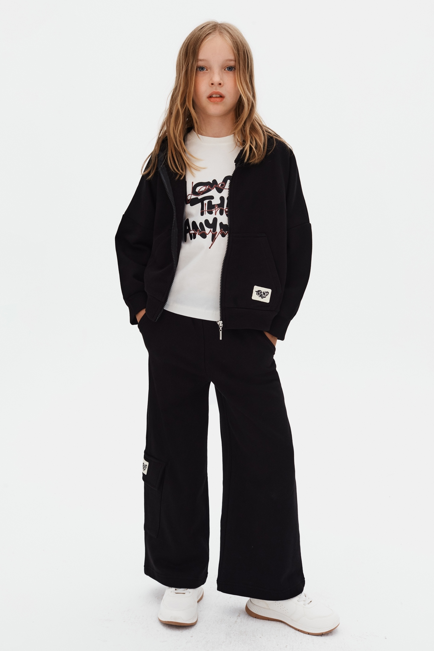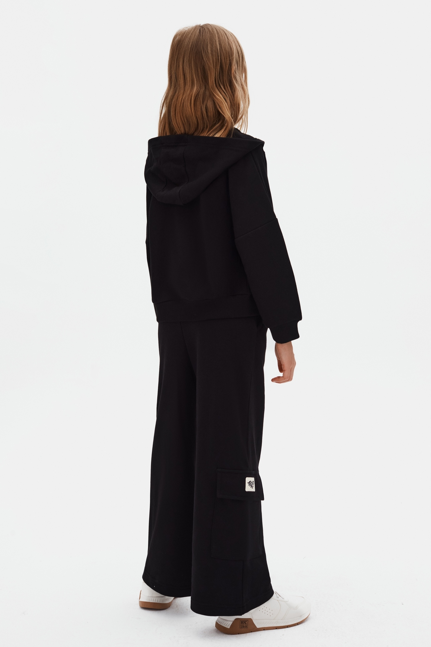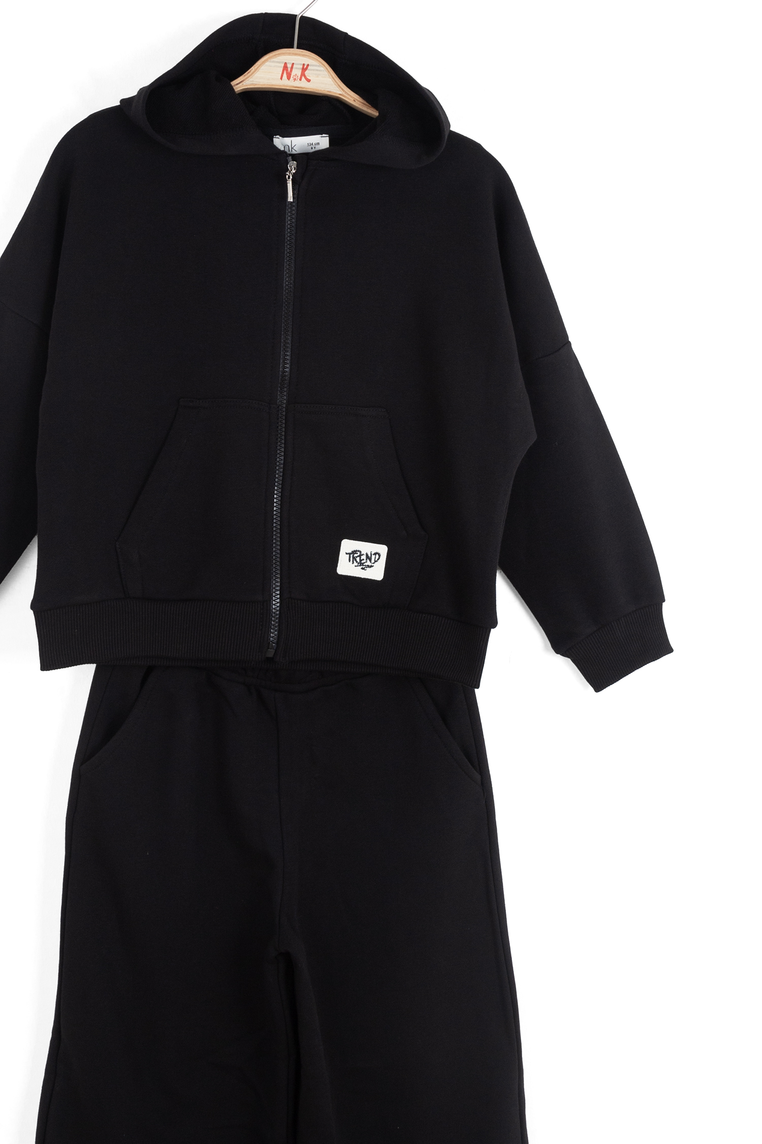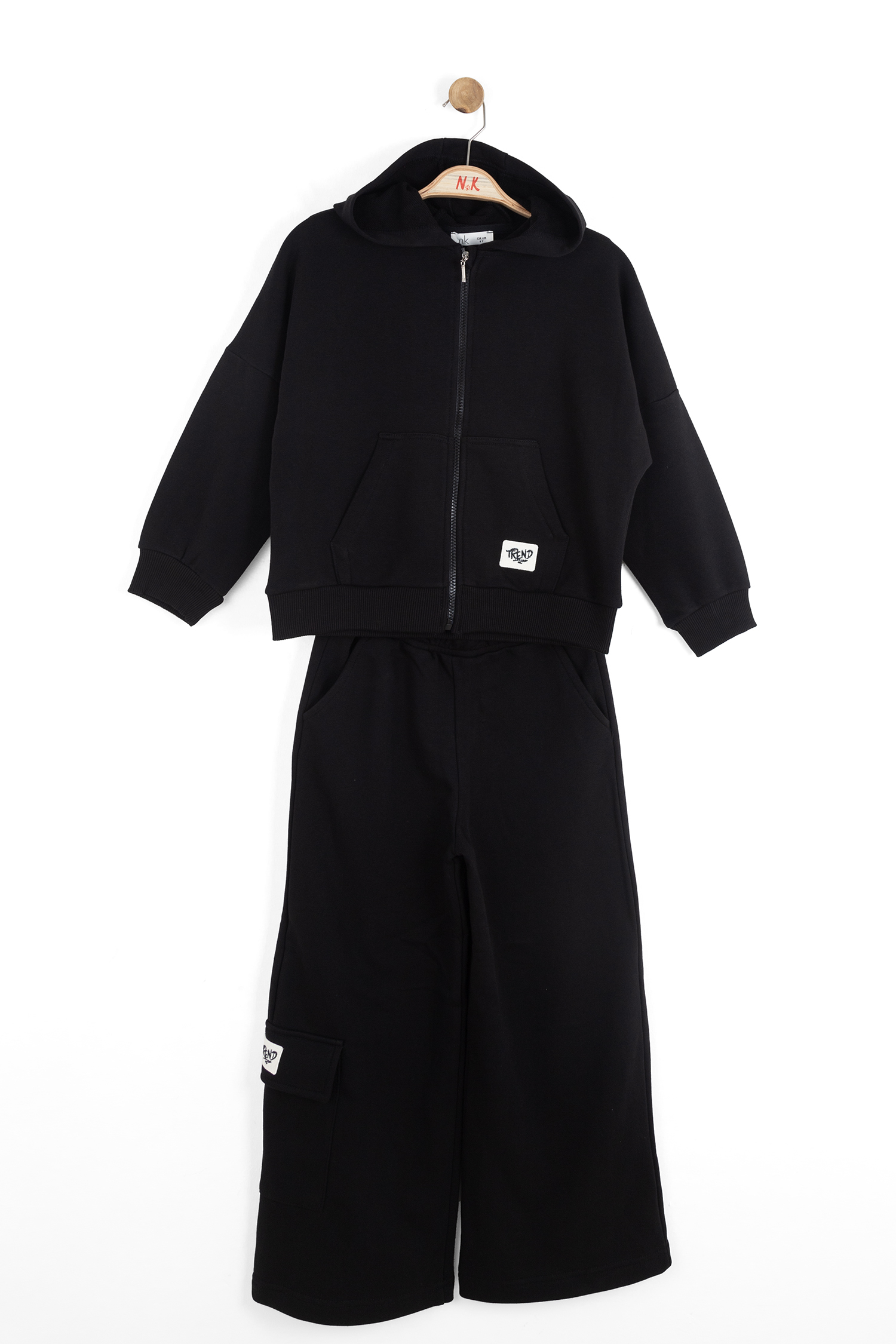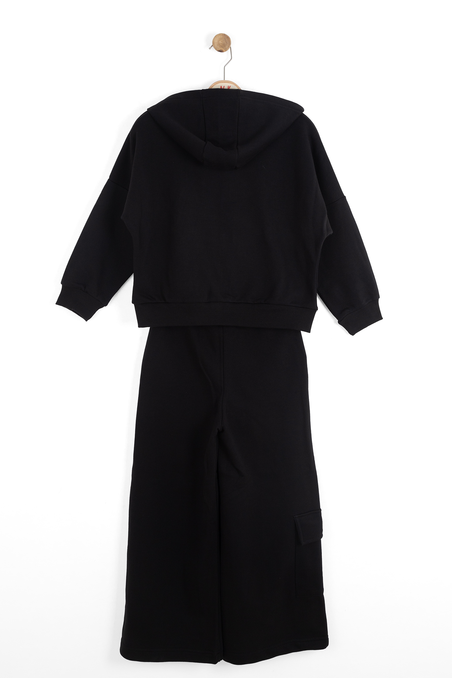 Bu kız çocuk eşofman takımı, rahatlığı ve şıklığı bir arada sunuyor. Siyah renkte tasarlanmış takım, kapüşonlu ve fermuarlı üstüyle kullanımı kolaydır. Üstte ve altta bulunan cepler, eşyaların pratik bir şekilde taşınmasına olanak sağlar. Bol paça pantolon, geniş kesimiyle hareket özgürlüğü sunarken, sweatshirt tarzındaki uzun kollu üst, günlük kullanıma uygundur. Takım, modern ve spor bir görünüm arayanlar için ideal bir seçimdir.