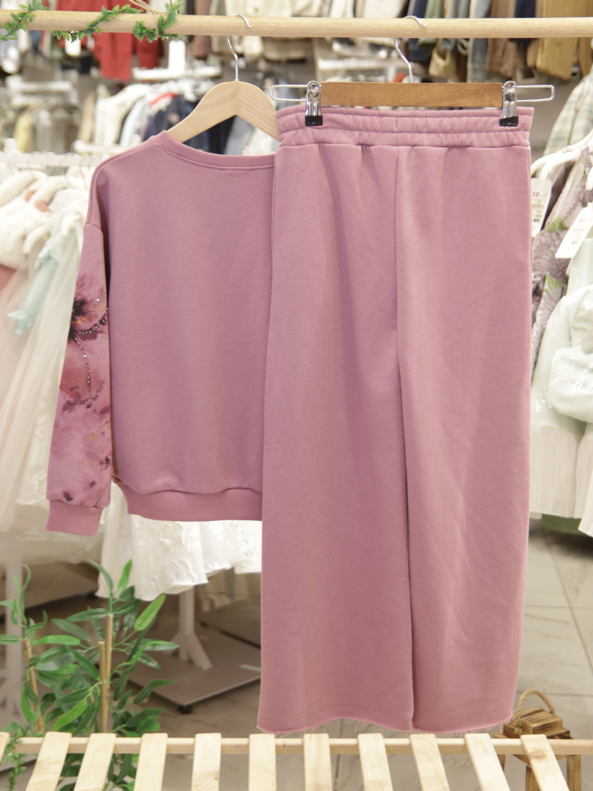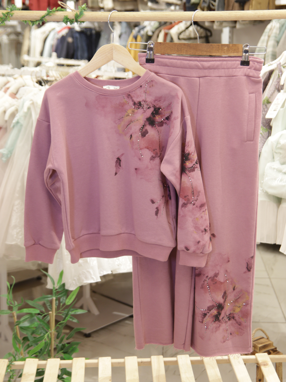 Bu kız çocuk eşofman takımı, rahat ve şık tasarımıyla günlük kullanıma uygundur. Bej renginde olan takım, sweatshirt ve bol paça pantolondan oluşmaktadır. Sweatshirt sıfır yakalı ve uzun kolludur. Kapüşon bulunmamaktadır. Eşofmanın sweatshirt ve pantolonunda pastel tonlarda, doğal görünümlü desenler yer almakta, bu detaylar ürüne estetik bir hava katmaktadır. Takım, konforlu ve geniş kesimi sayesinde çocukların hareket özgürlüğünü destekler.