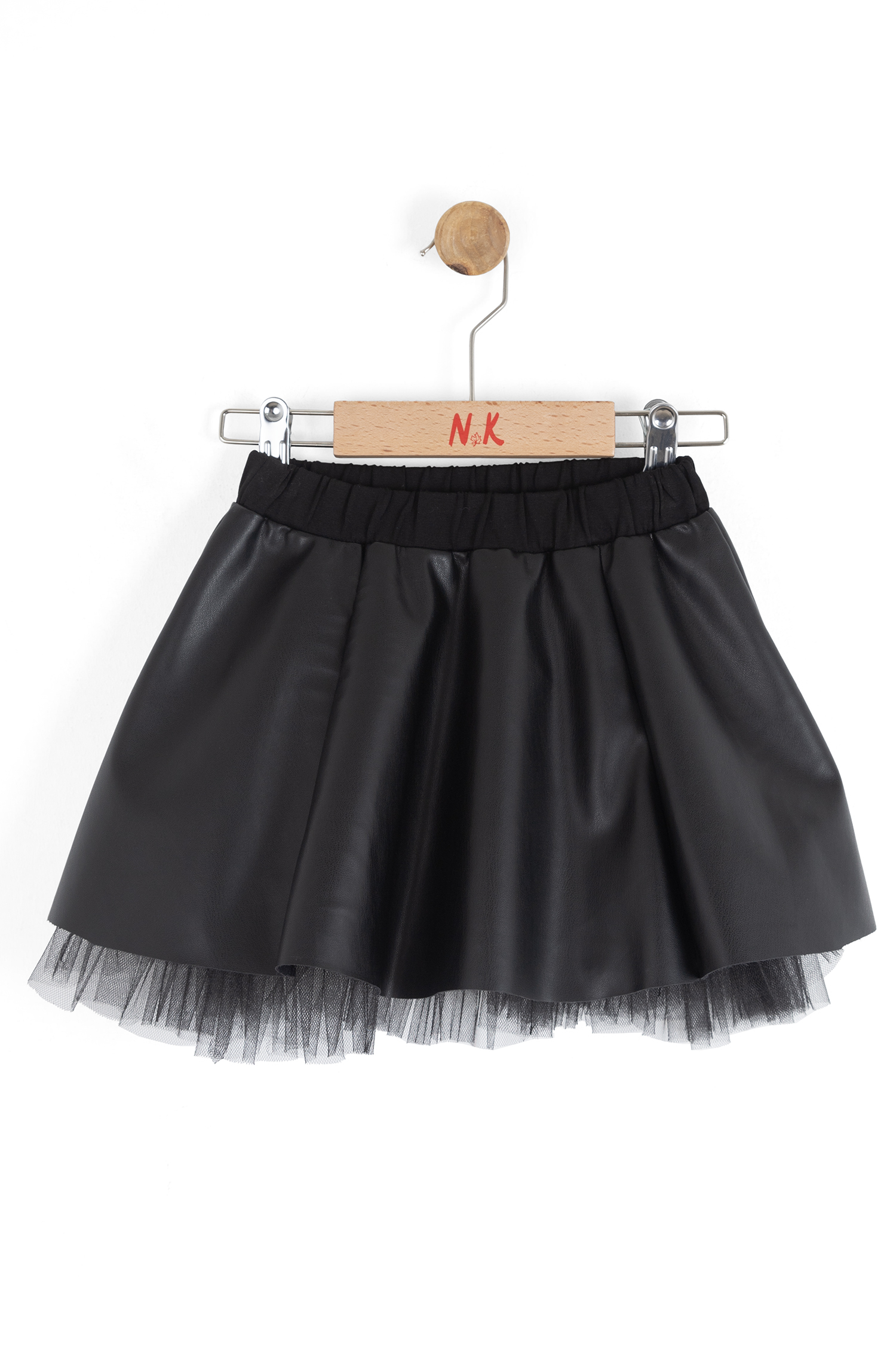 Bu şık kız çocuk eteği, modern ve zarif bir tasarımla dikkat çekiyor. Siyah renkte olan etek, suni deri görünümlü dış yüzeyiyle şıklık sunarken, alt kısmındaki tül detayları hareket ve hafiflik katıyor. Bel kısmında esnek bir lastik bulunmakta, bu sayede rahat bir kullanım sağlanıyor. Kısa ve hafif kabarık kesimi ile günlük ve özel gün kombinlerinde fark yaratacak bir parça.