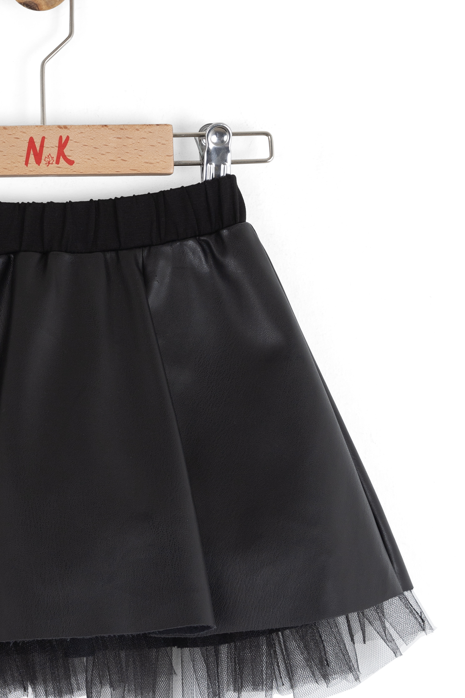 تتميز هذه التنورة الأنيقة للبنات بتصميم عصري وأنيق. التنورة باللون الأسود، مع سطح خارجي يشبه الجلد الصناعي، مما يمنحها مظهراً راقياً، بينما تضيف تفاصيل التول عند الحافة حركة وخفة. تحتوي على حزام خصر مطاطي لراحة الاستخدام. تصميمها القصير والمنفوش قليلاً يجعلها قطعة مميزة للمناسبات اليومية والخاصة.