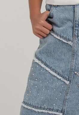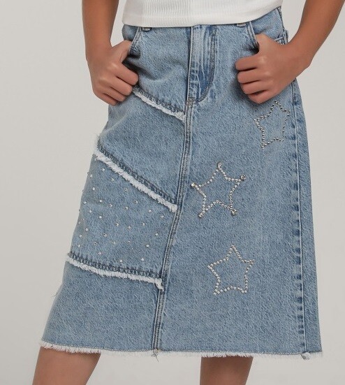 Bu şık kız çocuk eteği, hem rahat hem de göz alıcı bir görünüm sunuyor. Denim kumaşından üretilmiş olup, star desenleri ve inci detayları ile süslenmiştir. Eteğin uç kısmındaki hafif yırtık detayları, modern bir tarz katmaktadır.