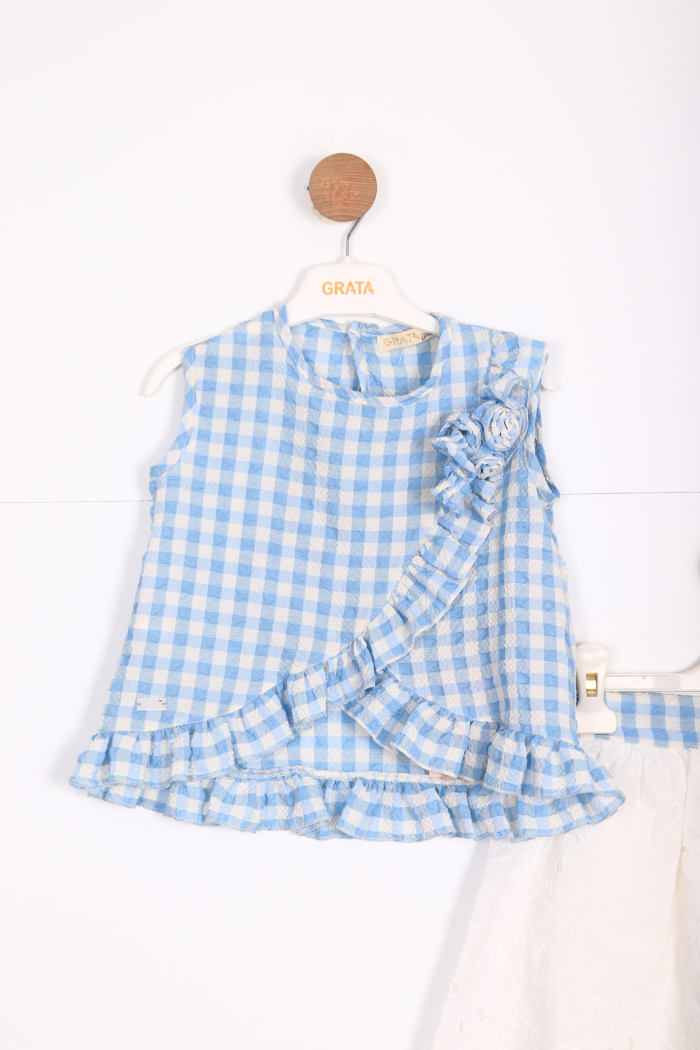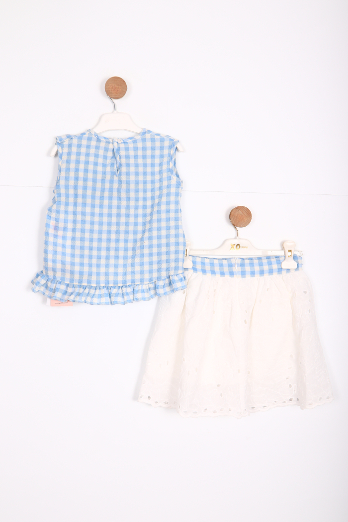 Bu kız çocuk etek takımı, yaz ayları için şık ve rahat bir seçenektir. Kolsuz üst, mavi-beyaz kareli deseni ve fırfır detaylarıyla sevimli bir görünüm sunar. Üstteki çiçek detayları ve çapraz fırfır çizgisi, tasarıma zarif bir dokunuş katar. Etek ise beyaz, nakışlı ve hafif kabarık yapısıyla kombin tamamlanır. Belinde mavi-beyaz kareli kumaştan yapılmış küçük bir fiyonk bulunmaktadır. Takım, sıcak havalarda serin tutacak hafif ve nefes alan kumaşlardan üretilmiştir.