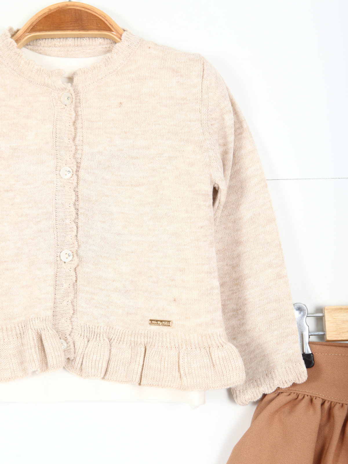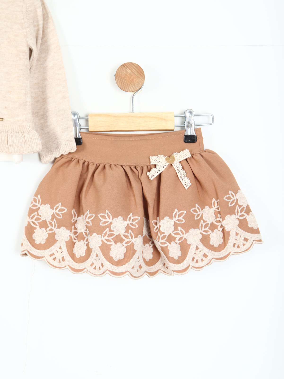 Kız çocukları için tasarlanmış bu şık etek takımı, rahat ve şık bir görünüm sunuyor. Bej rengi ile her türlü kombinle uyum sağlar. Üst kısmı, düğmeli ve uzun kollu bir hırka ile birlikte gelir. Etek ise güzel işçilikle hazırlanmış çiçek desenleri ve dantel detaylarıyla süslenmiştir.