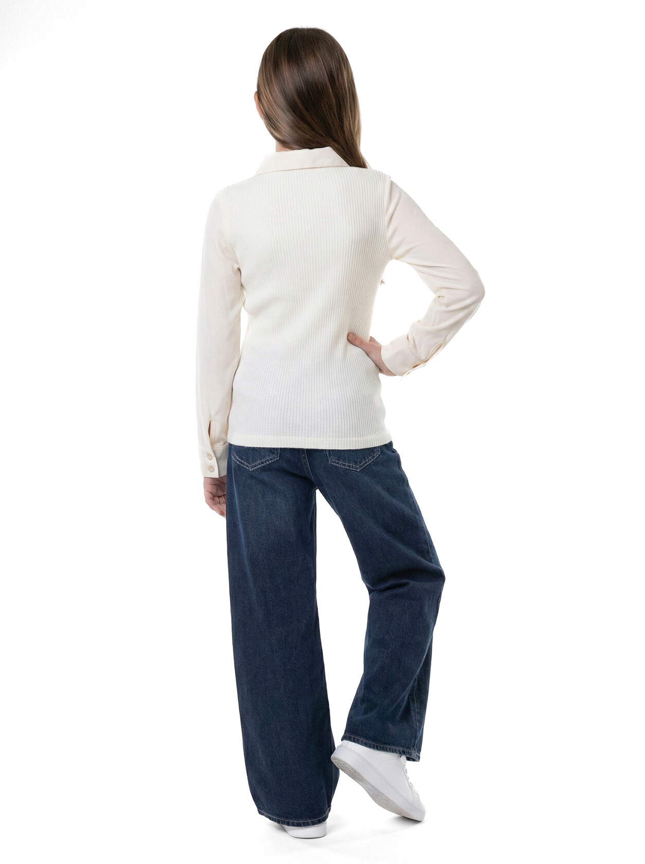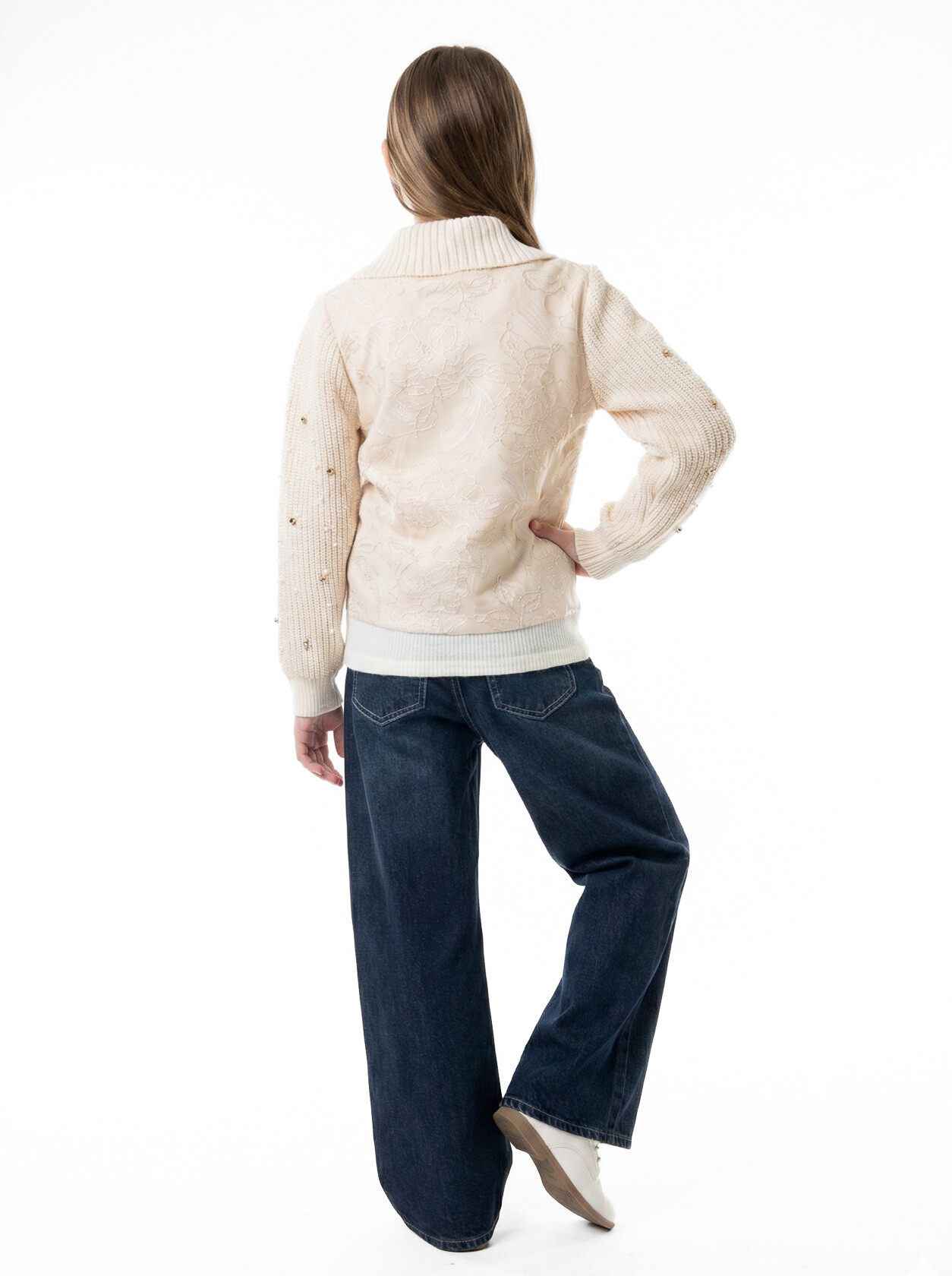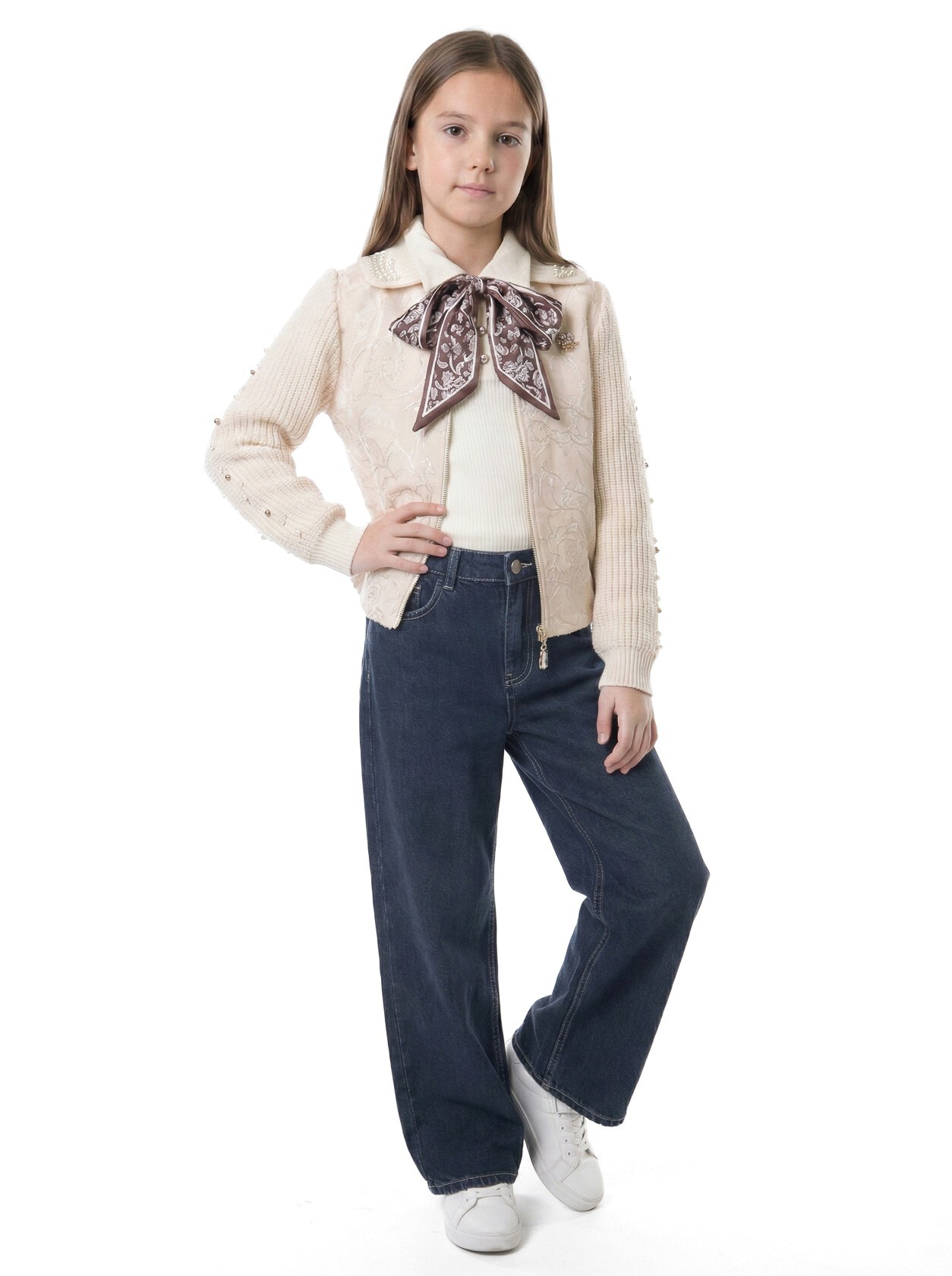 Bu şık kız çocuk alt üst takımı, bahar sezonu için mükemmel bir seçimdir. Yumuşak bej tonlarıyla, zarif detaylarıyla dikkat çeker. Üst kısmında fermuarlı kapama ve zarif bir yakaya sahip olan bu takıma, şık bir fular eklenmiştir.