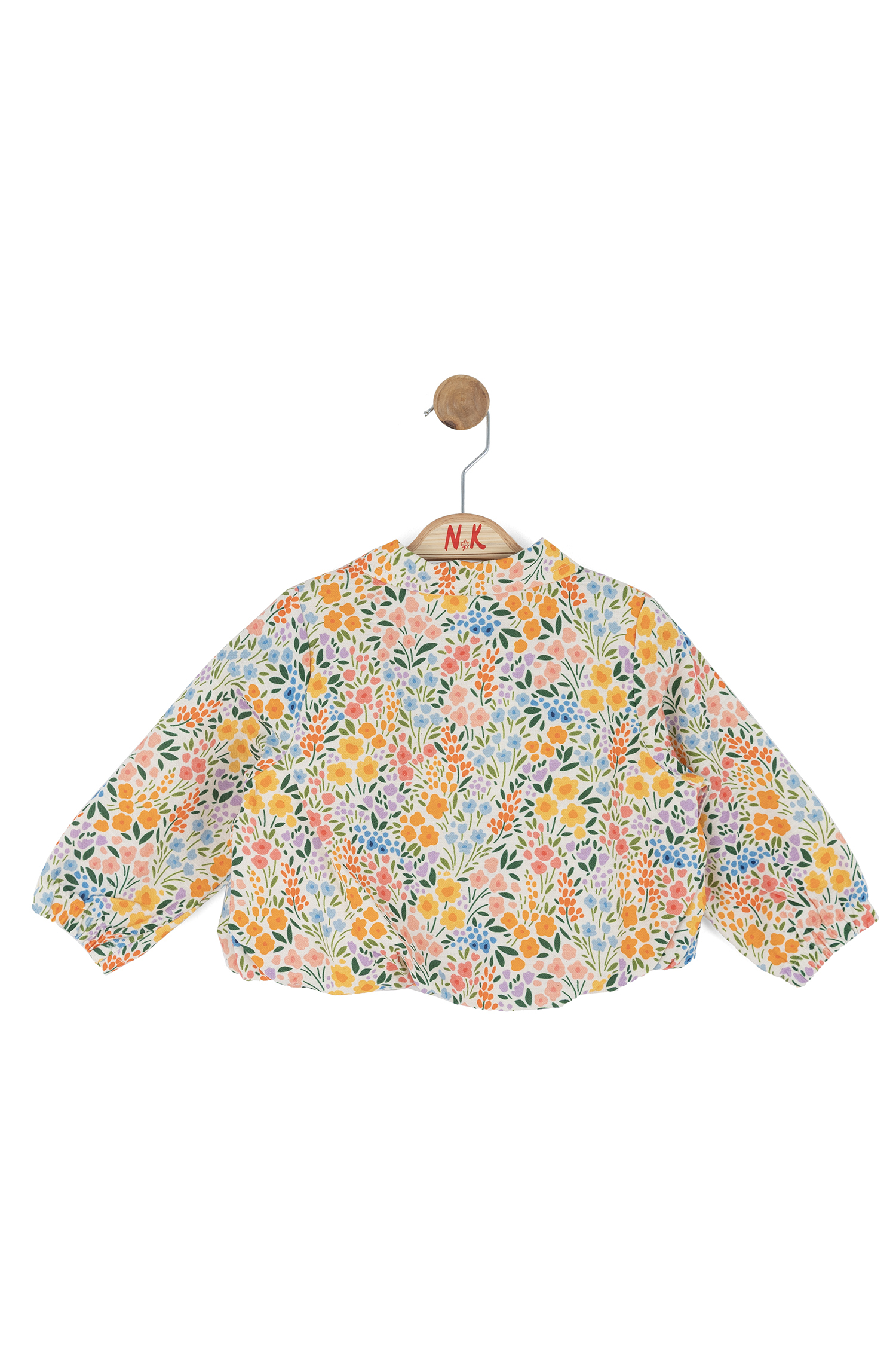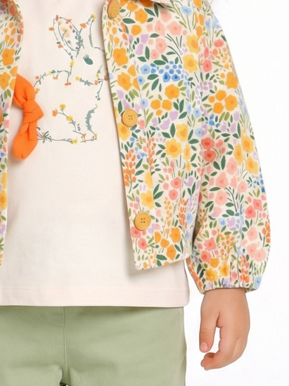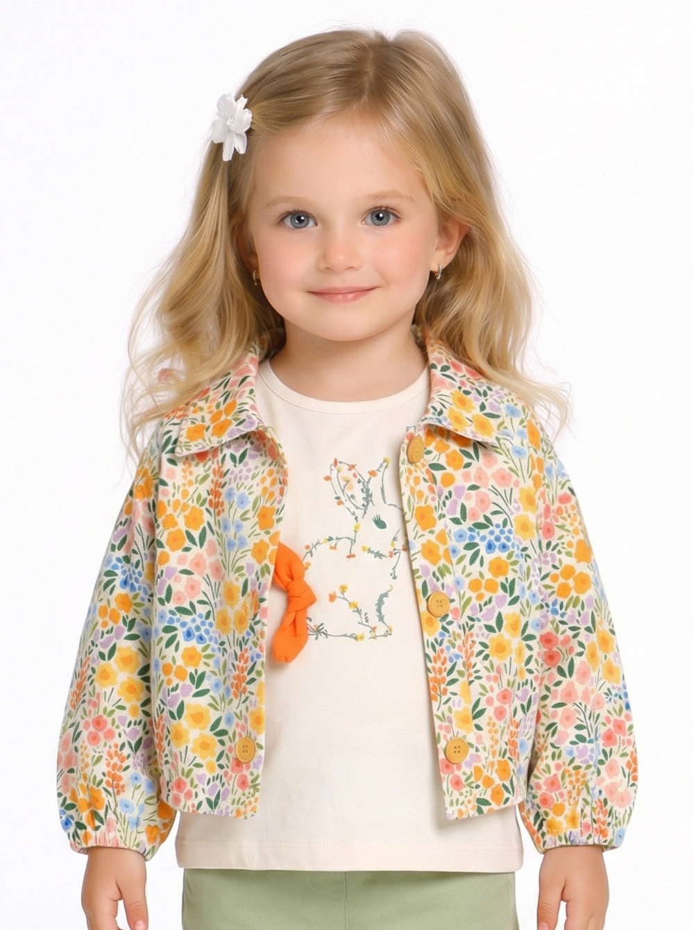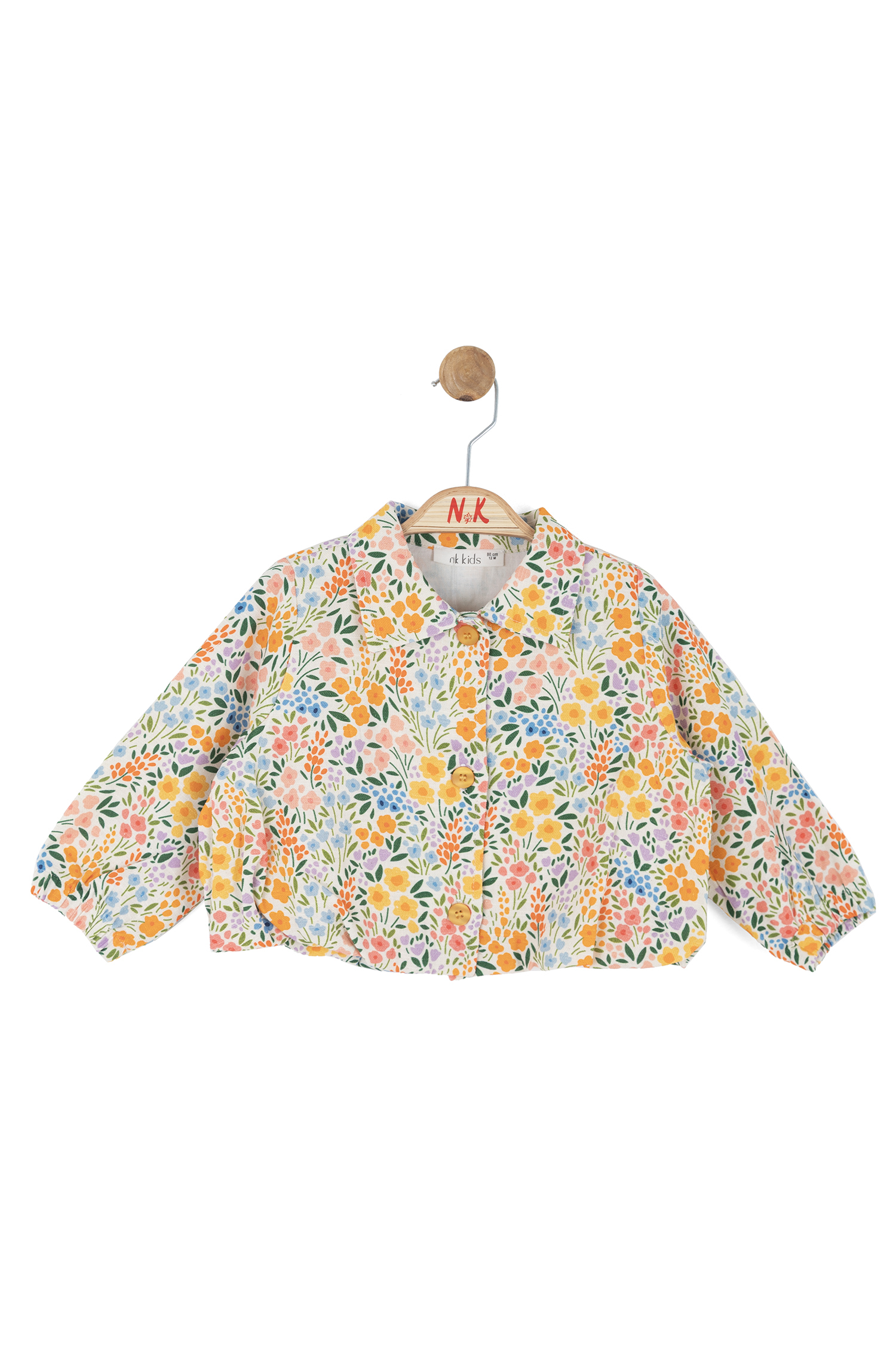 Bu kız çocuk gömleği, bahar mevsimi için ideal, canlı ve neşeli bir tasarıma sahip. Kapüşon bulunmayan gömlek, renkli çiçek desenleriyle süslenmiş ve düğmeli bir ön kapanışa sahip. Uzun kollu ve bilek kısmında hafif lastik detaylarıyla rahat bir kullanım sunar. Bisiklet yaka üzerine yakadan geniş, spor tarzda bir gömlektir. Baharın enerjisini yansıtan, günlük kullanıma uygun şık ve rahat bir parçadır.