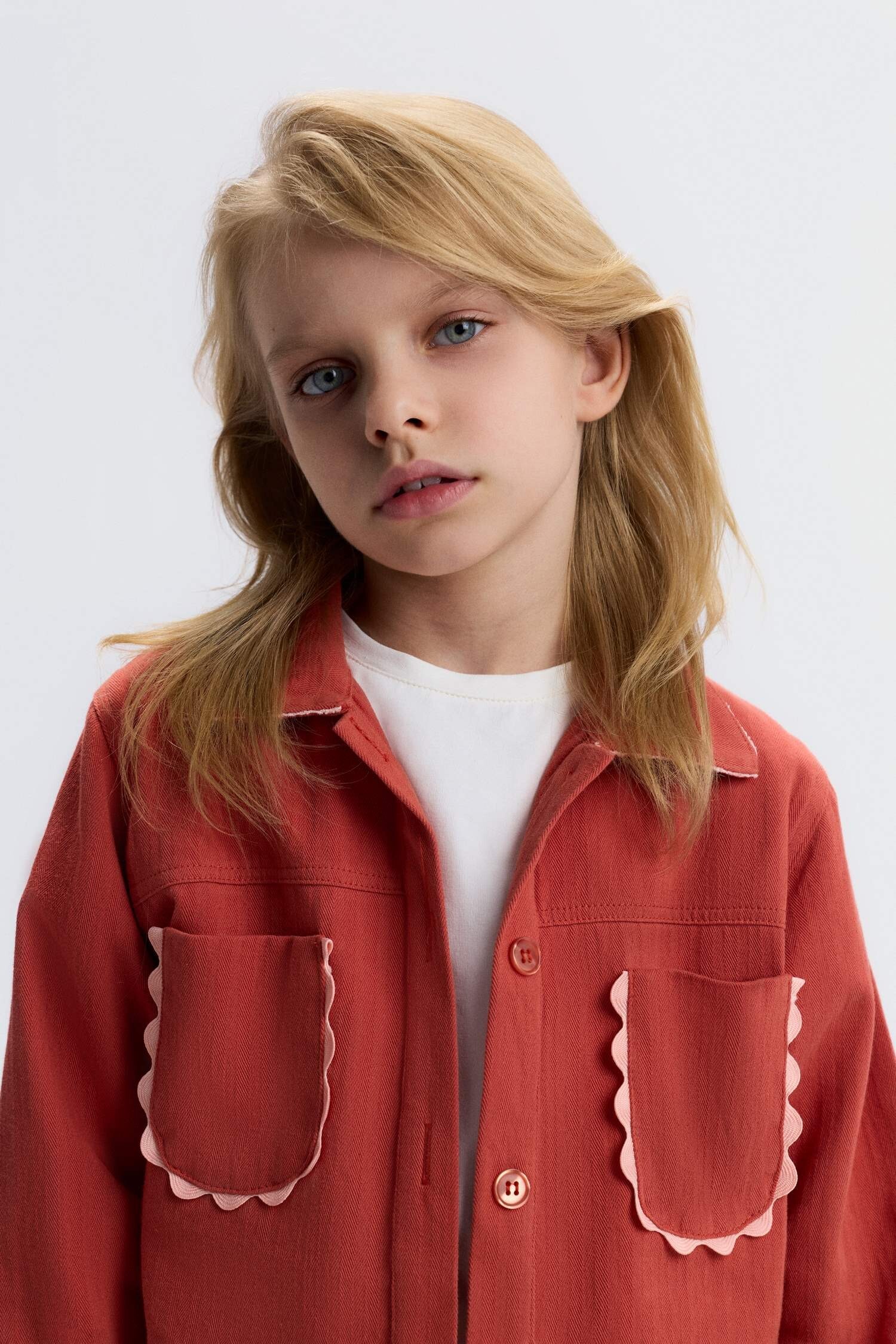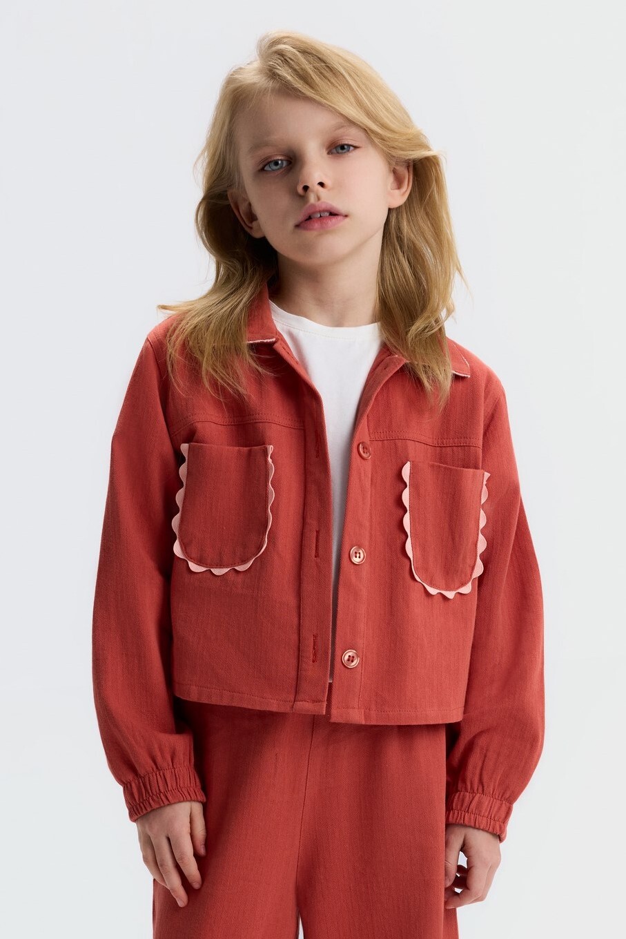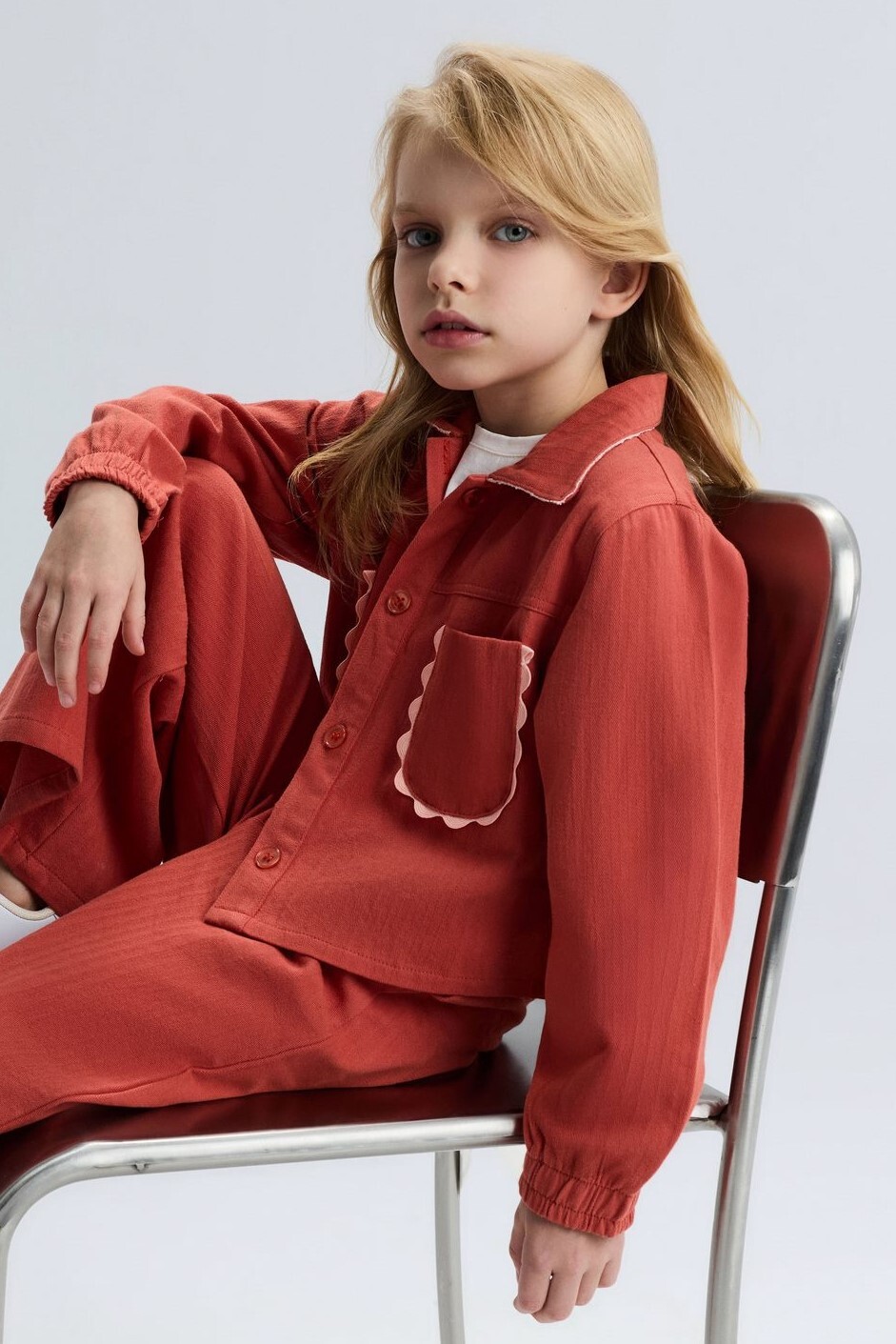 Kız çocukları için tasarlanmış bu kiremit rengi gömlek, bahar ayları için ideal bir seçenektir. Uzun kollu ve düğmeli model, rahat kesimiyle günlük kullanıma uygundur. Ön kısmındaki cepler, pembe dalgalı şerit detaylarıyla süslenmiş olup, şıklık katmaktadır. Arka omuz kısmında ise aynı dalgalı fırfır detayı yer alır. Sıfır yaka yapısı ve kısa kesimiyle modern ve sevimli bir görünüm sunar.