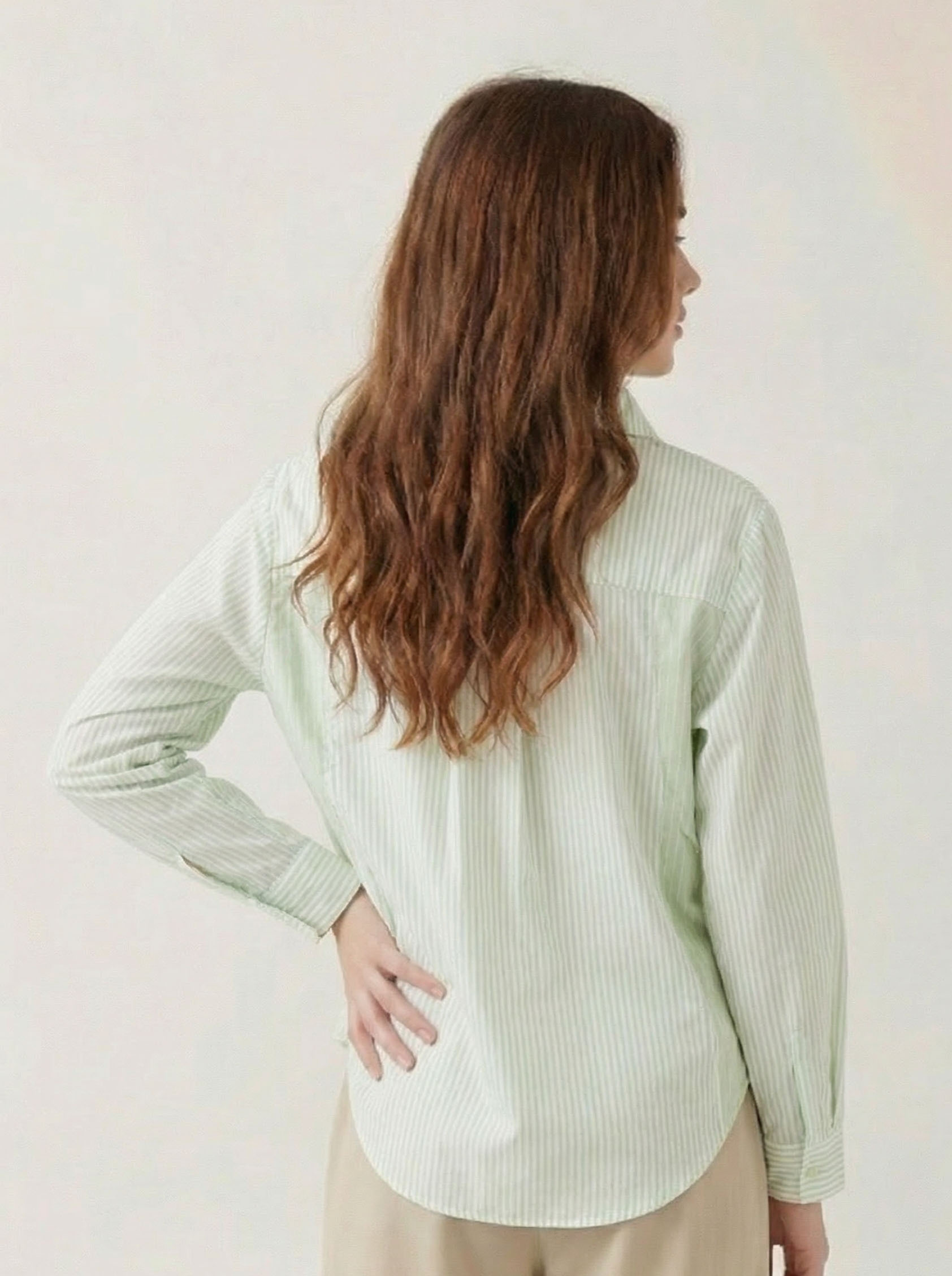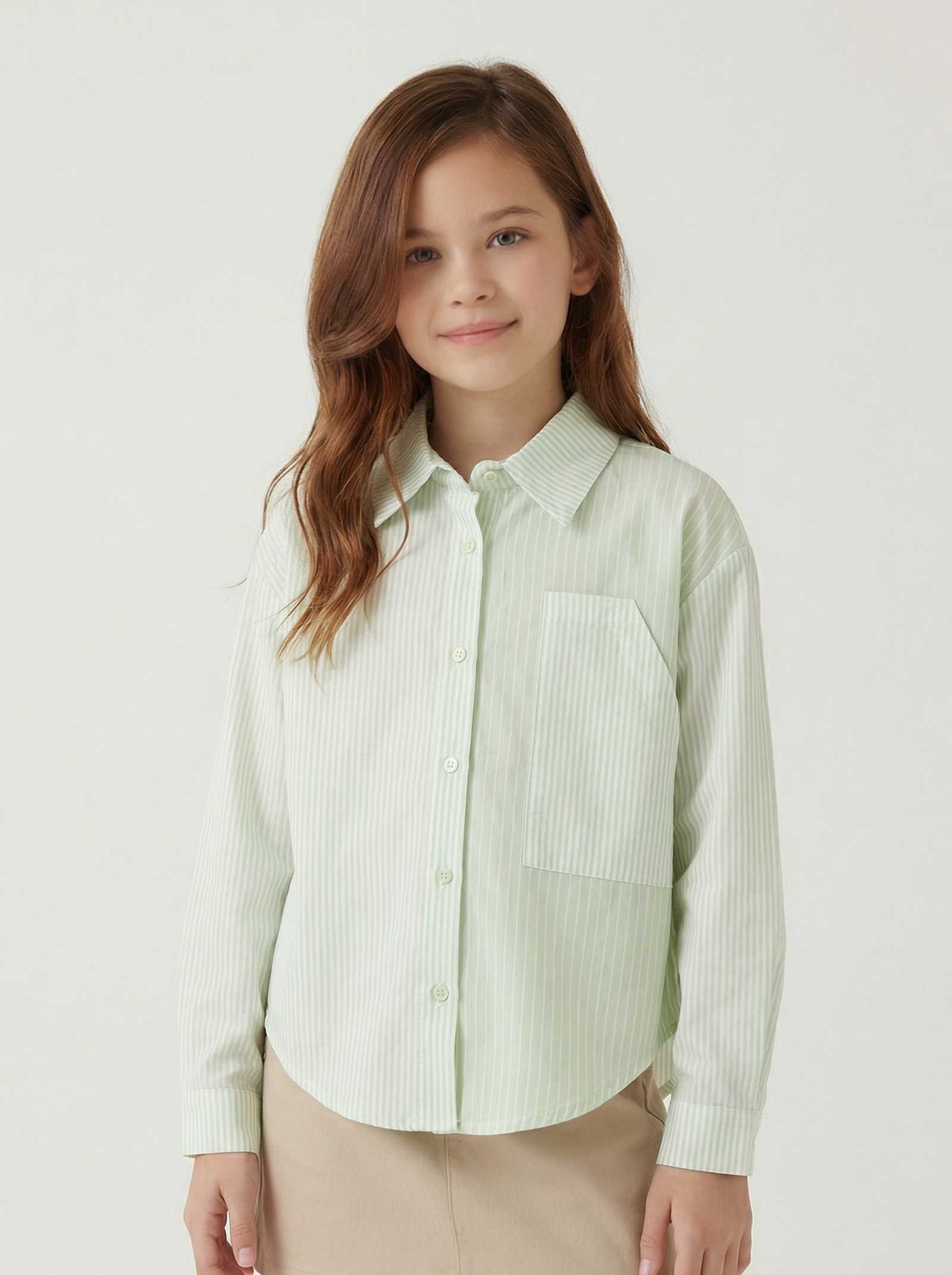 Bu kız çocuk gömleği, hafif mint yeşili ve beyaz ince çizgilerden oluşan şık ve zarif bir tasarıma sahiptir. Tam düğmeli ön kısmı ve klasik yaka detayı ile günlük kullanıma uygundur. Uzun kollu yapısı, rahat hareket imkanı sağlarken, tek cep detayı gömleğe modern bir dokunuş katmaktadır. Gömlek, hafif oval ve kısa kesim alt ucu ile hem spor hem de şık kombinlere kolayca uyum sağlar.