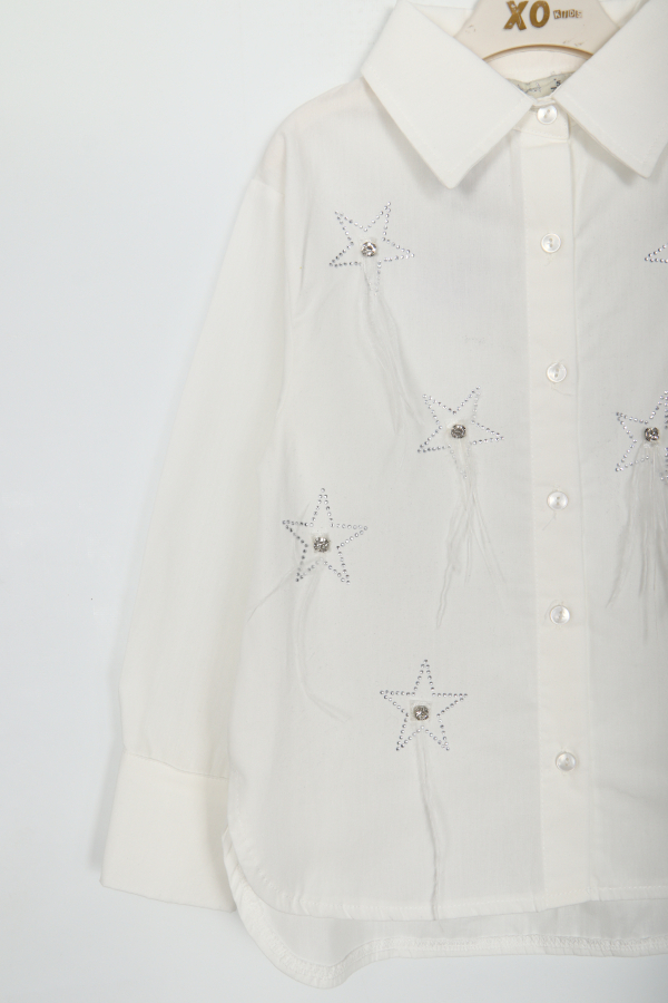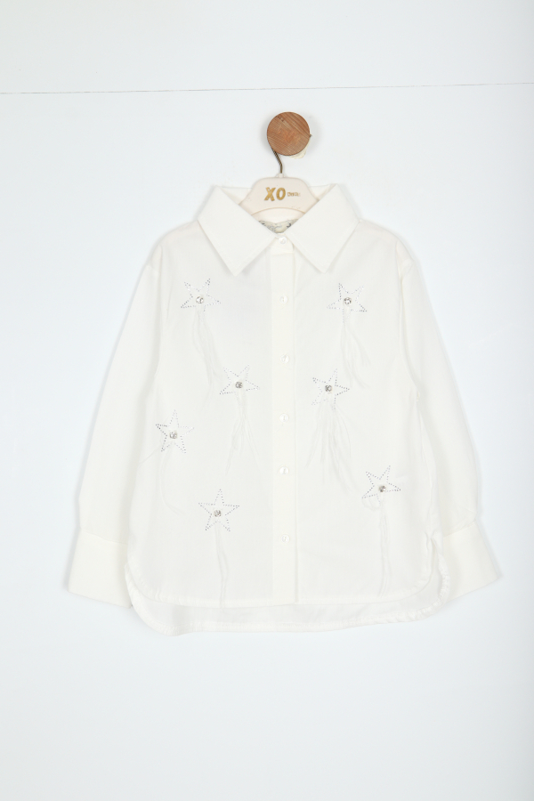 Bu şık kız çocuk gömleği, klasik beyaz renkte olup zarif ve sade bir tasarıma sahiptir. Uzun kollu ve düğmeli yapısı ile rahat bir kullanım sunar. Ön kısmında inci düğmelerle tamamlanan gömlek, yıldız şeklinde taş ve tüy detayları ile süslenmiş, böylece çocukların ilgisini çekecek eğlenceli ve sevimli bir görünüm kazanmıştır. Geniş yaka tasarımı gömleğe modern bir hava katarken, hafif salaş kesimi günlük kullanıma uygundur.