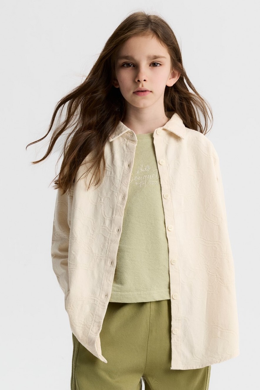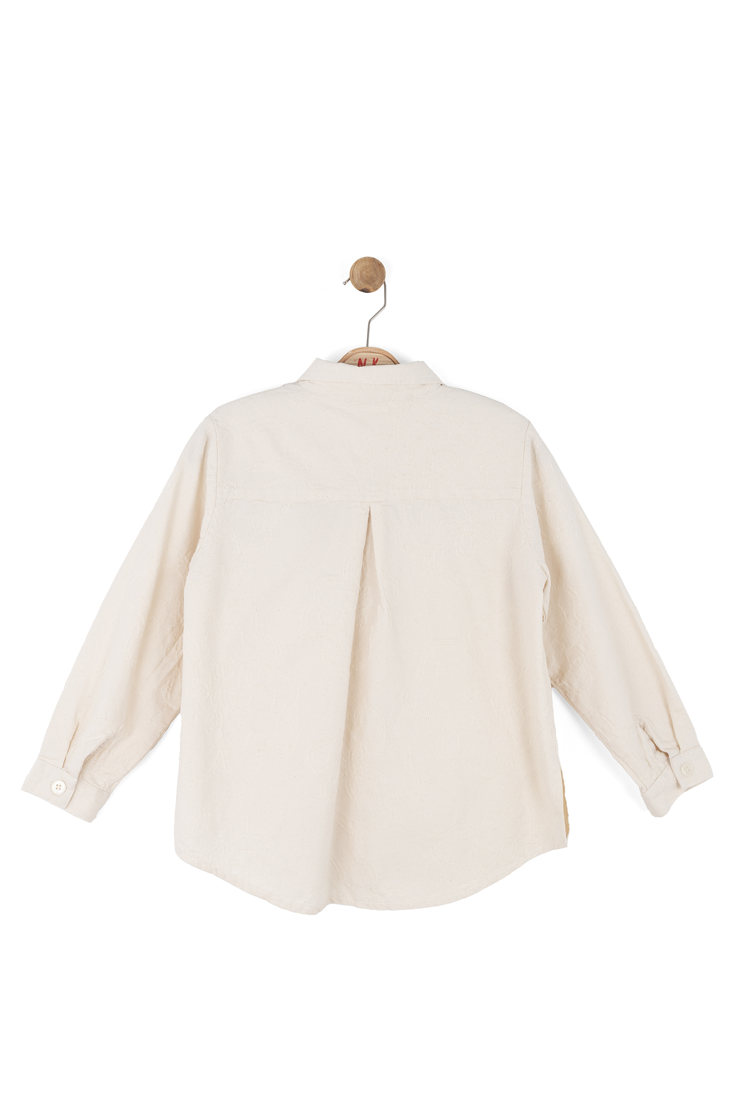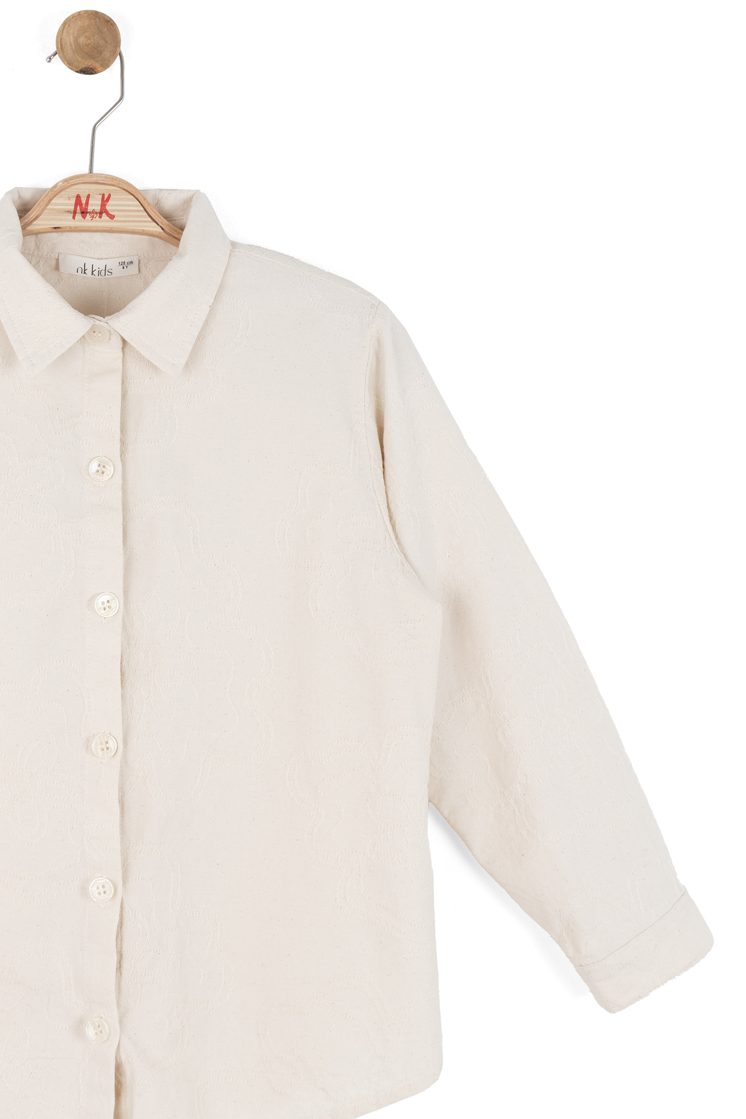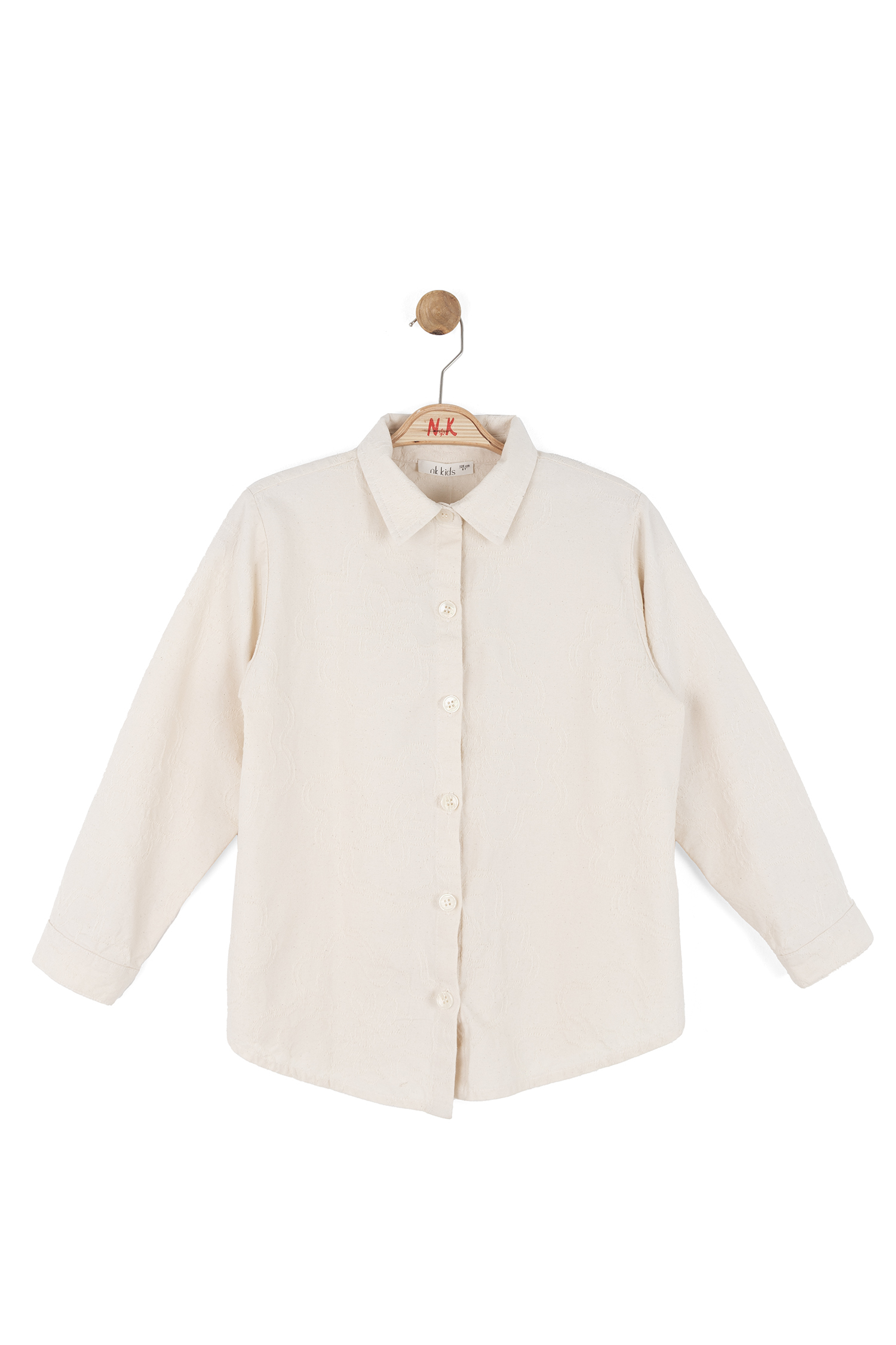 Bu kız çocuk gömleği, bahar ayları için ideal bir seçenektir. Krem renginde ve uzun kollu olan gömlek, klasik yakası ve düğmeli ön kapamasıyla şık ve rahat bir görünüm sunar. Cepli ya da kordonlu detaylar bulunmaz, sade ama zarif bir tasarıma sahiptir. Kumaşında hafif kabartmalı desenler yer alarak gömleğe özgünlük katmaktadır. Günlük kullanımda spor ve casual tarzını yansıtmak isteyen küçük kızlar için uygundur.