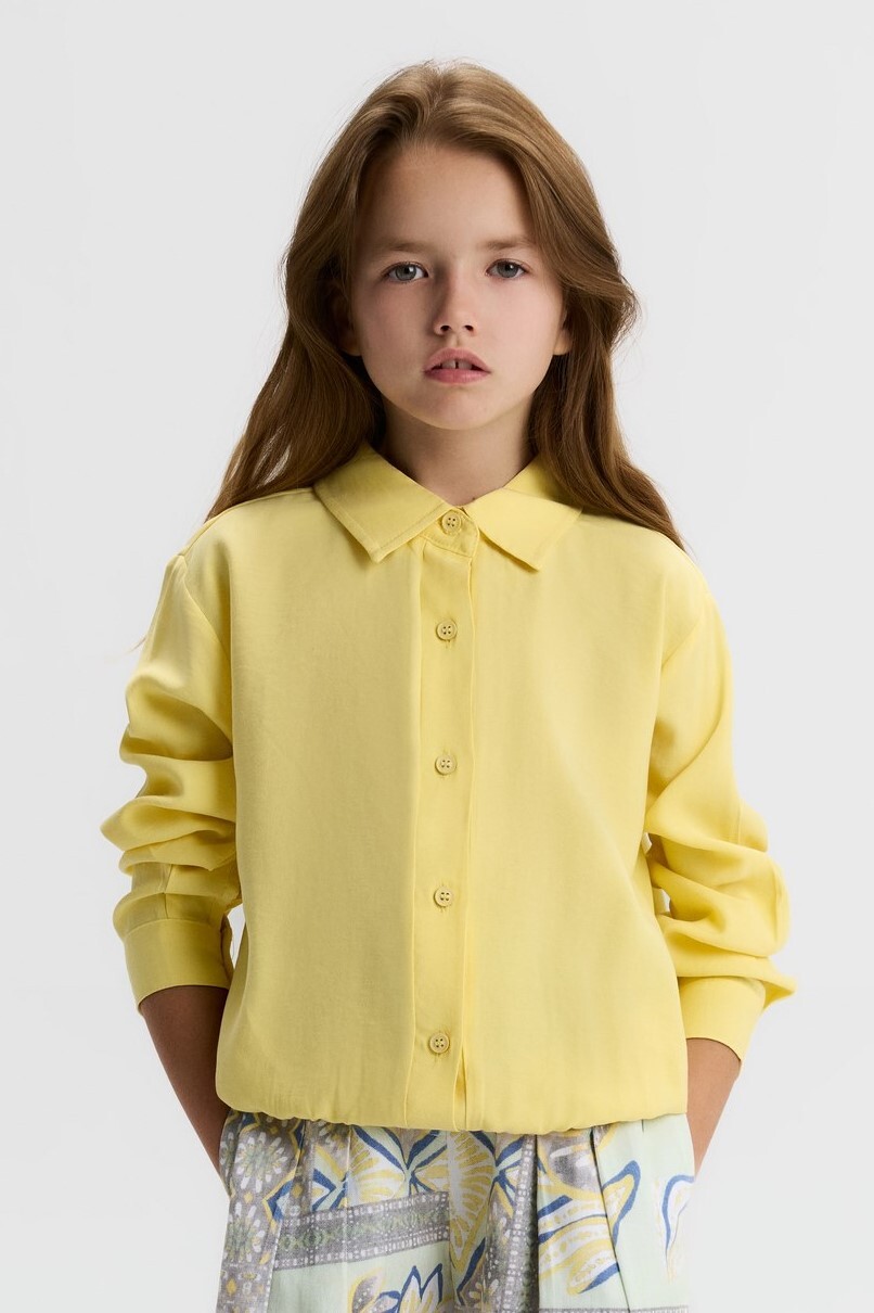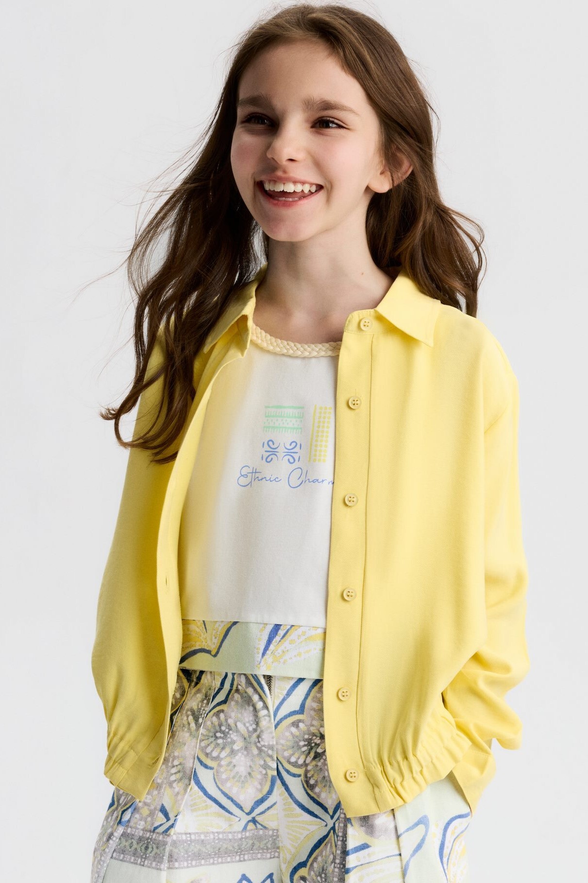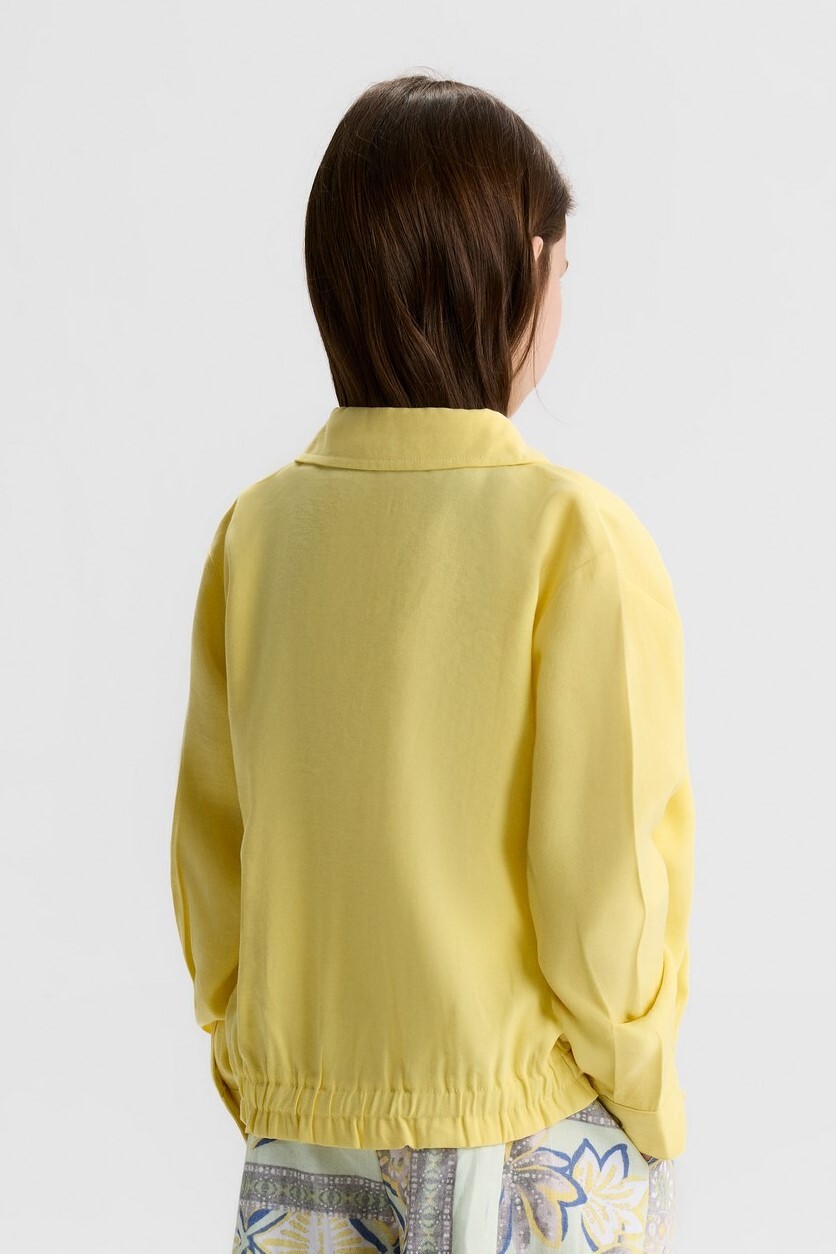 Bu kız çocuk gömleği, canlı sarı rengi ve bahar sezonuna uygun hafif dokusuyla öne çıkıyor. Kapüşonsuz ve klasik yaka tasarımına sahip gömlek, ön kısmında düğmelerle kapanıyor. Uzun kollu ve manşetlerinde düğmeler bulunan bu gömlek, rahat bir kullanım sunuyor. Bel kısmında hafif lastik detayı sayesinde şık ve modern bir görünüm sağlıyor. Günlük ve özel günlerde rahatlıkla tercih edilebilecek, sade ama şık bir parça.