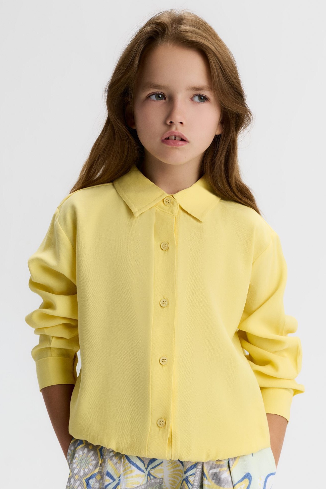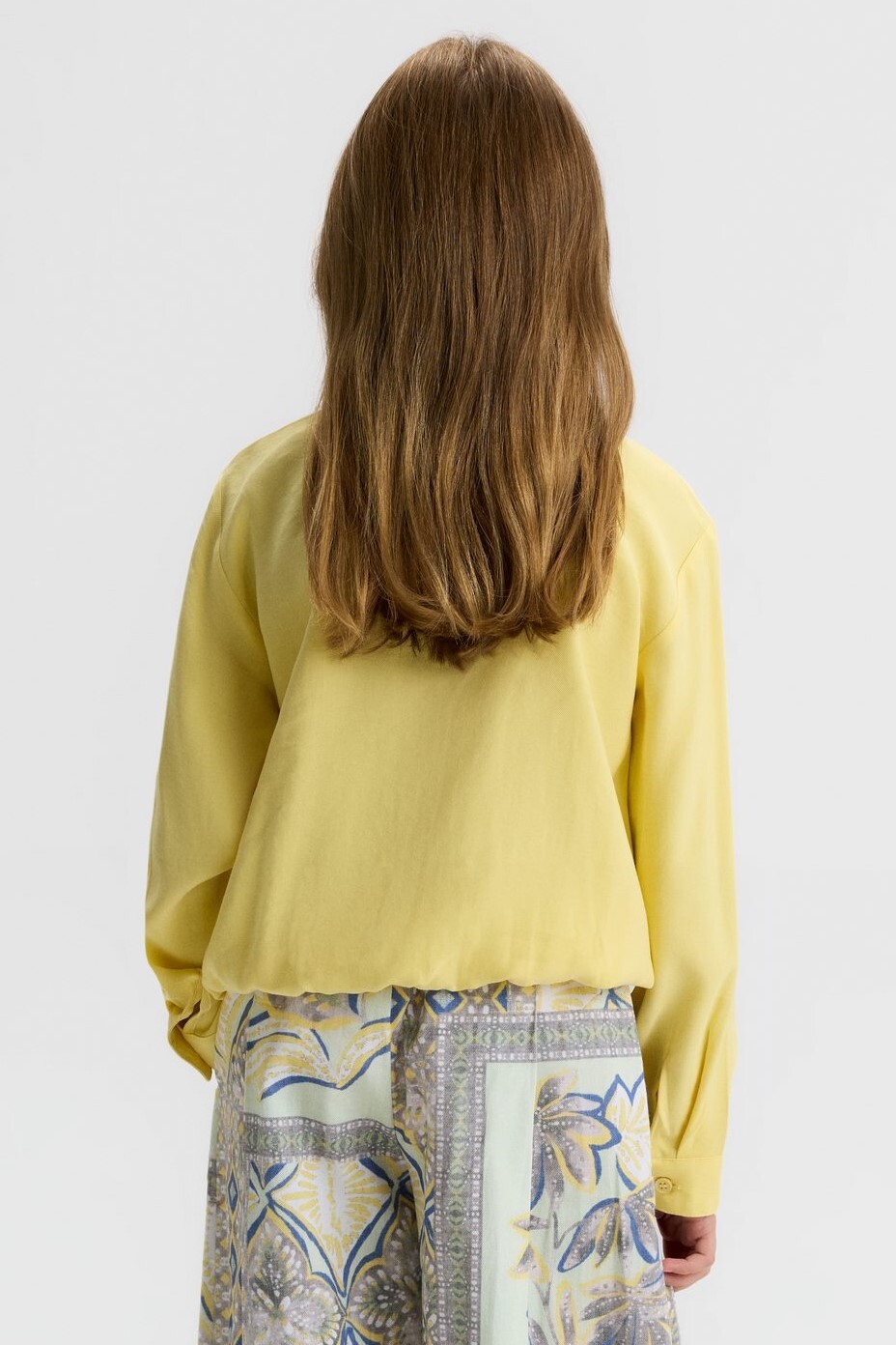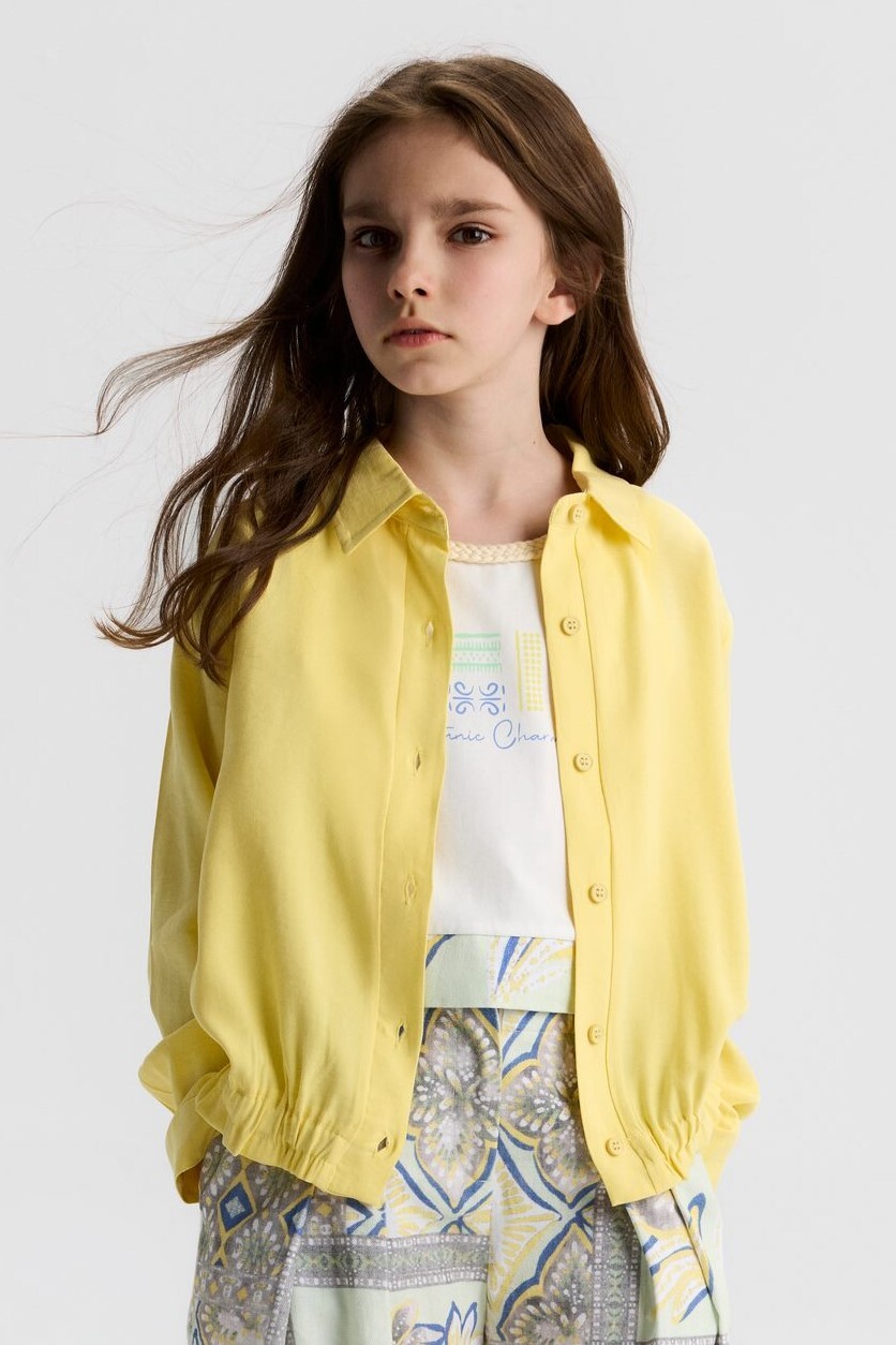 Bu kız çocuk gömleği, canlı sarı rengi ve bahar sezonuna uygun hafif dokusuyla öne çıkıyor. Kapüşonsuz ve klasik yaka tasarımına sahip gömlek, ön kısmında düğmelerle kapanıyor. Uzun kollu ve manşetlerinde düğmeler bulunan bu gömlek, rahat bir kullanım sunuyor. Bel kısmında hafif lastik detayı sayesinde şık ve modern bir görünüm sağlıyor. Günlük ve özel günlerde rahatlıkla tercih edilebilecek, sade ama şık bir parça.