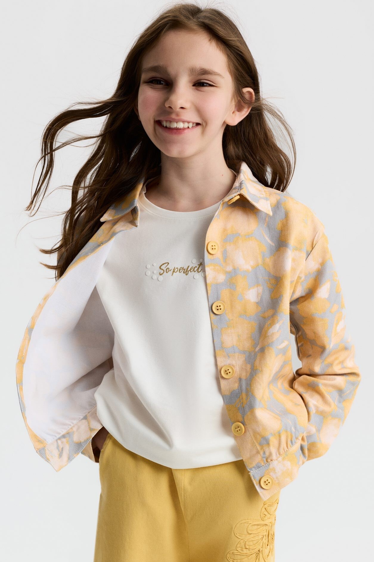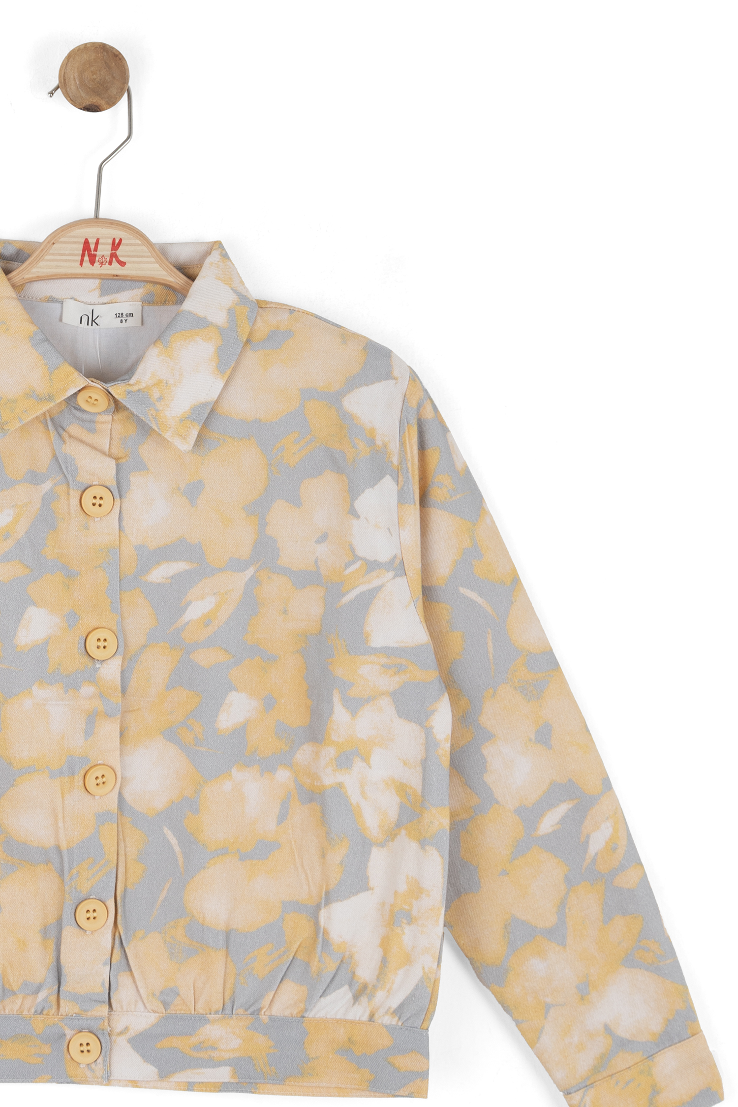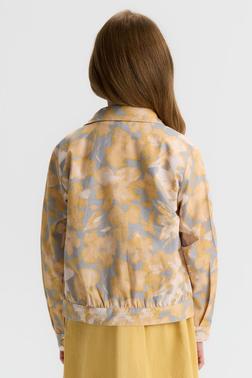 Bu kız çocuk gömleği, bahar sezonu için ideal, hafif ve rahat bir dış giyim parçasıdır. Kapüşonsuz ve uzun kollu olan gömlek, klasik yaka tasarımıyla sade ve şık bir görünüm sunar. Ön kısmında düğmelerle kapanan gömlek, sarı ve gri tonlarında soyut çiçek desenleriyle dikkat çeker. Ayrıca, gömlek yan ceplerle pratiklik sağlar ve elastik bel detayı sayesinde rahat bir kullanım sunar. Günlük ve spor kombinlere uyum sağlayacak modern bir tarza sahiptir.