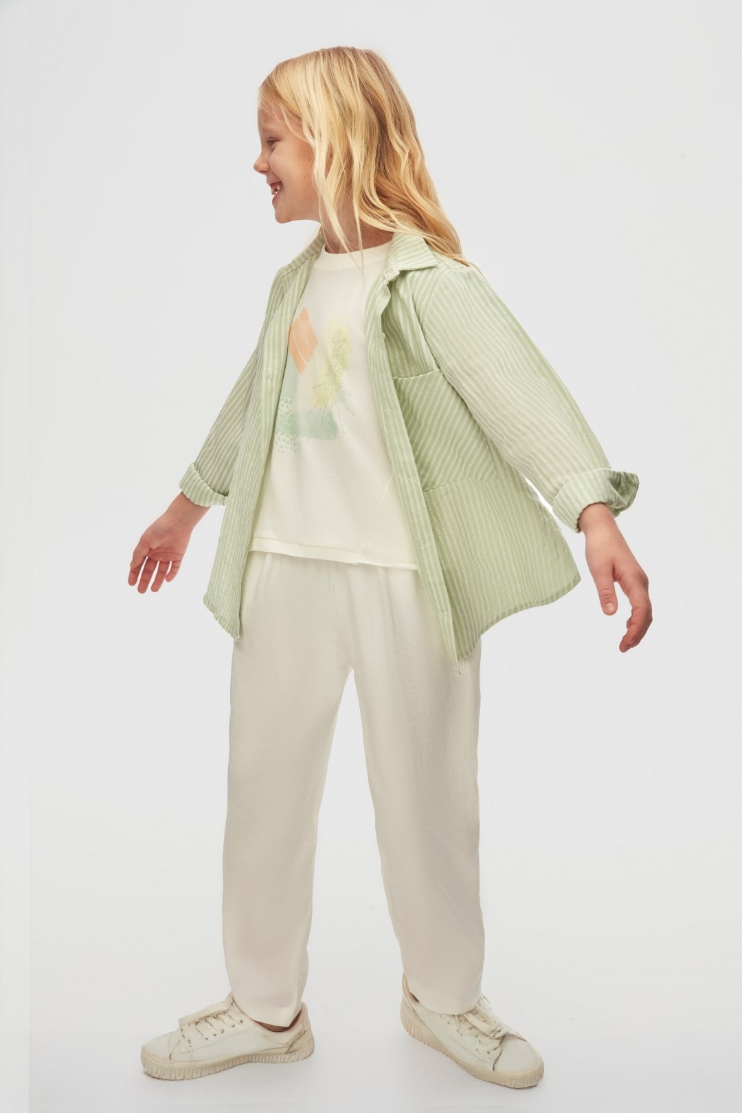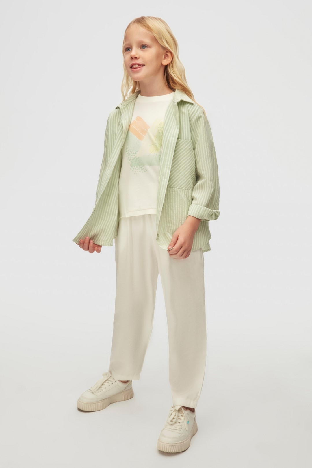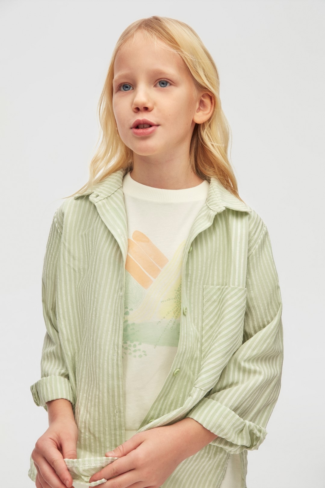 قميص للبنات بتصميم منعش وأنيق يناسب الاستخدام اليومي. يأتي بلون أخضر نعناعي فاتح مع خطوط بيضاء رفيعة، بأكمام طويلة وأزرار أمامية لراحة الاستخدام. يحتوي القميص على جيب واحد على الصدر، مما يضيف لمسة بسيطة وعملية. قماشه خفيف وناعم مناسب لجميع الفصول. يتميز بأسلوب كاجوال مريح يسمح للأطفال بحرية الحركة مع الحفاظ على الأناقة.