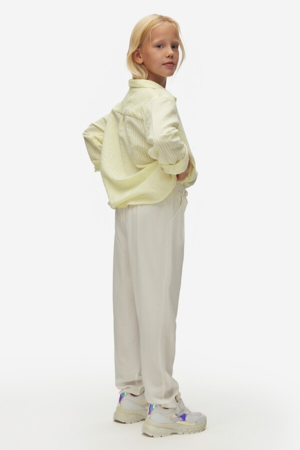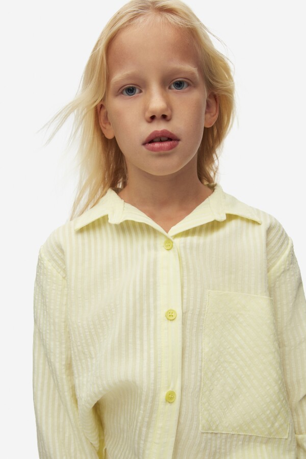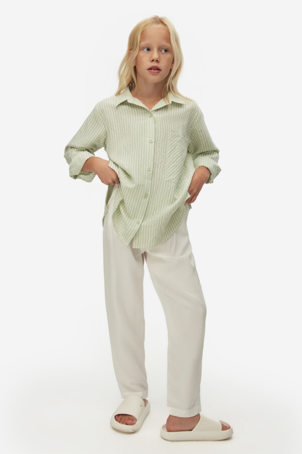 Bu kız çocuk gömleği, ferah ve şık bir tasarımla günlük kullanıma uygundur. Açık mint yeşili ve ince beyaz çizgilerle hareketlendirilmiş, uzun kollu ve düğmeli yapısıyla rahat bir kullanım sunar. Gömlek, tek cep detayıyla sade ama fonksiyonel bir görünüm sergiler. Yumuşak ve hafif kumaşı sayesinde dört mevsim tercih edilebilir. Casual ve rahat tarzıyla çocukların hareket özgürlüğünü kısıtlamadan şıklık sağlar.