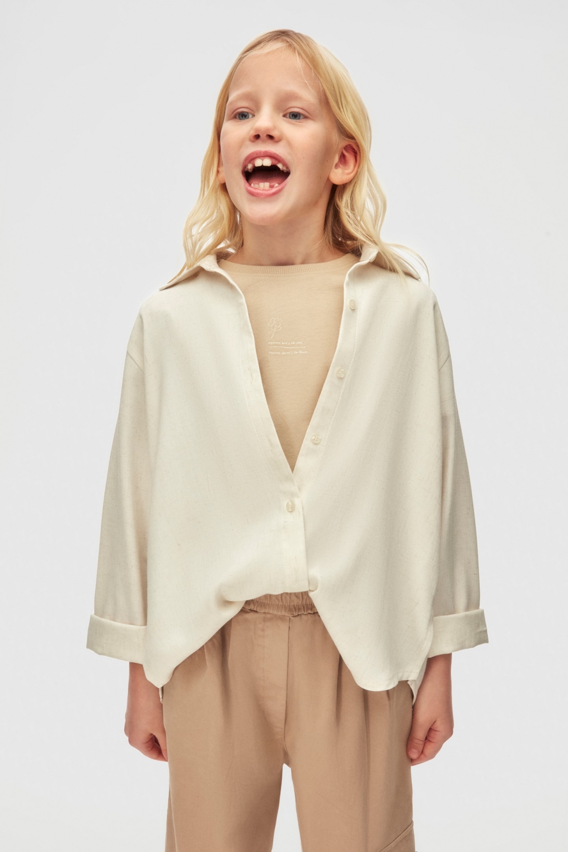 Bu krem renkli kız çocuk gömleği, rahat ve şık bir tasarıma sahiptir. Kapüşon bulunmamaktadır. Gömlek, önde düğmeli (fermuarlı değil) olup, uzun kolludur ve kolları manşetlerle hafifçe katlanmıştır. Sıfır yaka tarzında tasarlanmış olup, sade ve doğal bir görünüm sunar. Gömlek, bol kesimdir ve günlük kullanıma uygundur. Herhangi bir cep, kordon ya da ekstra aksesuar bulunmamaktadır. Minimalist ve casual tarzı ile çocukların konforunu ön planda tutar.