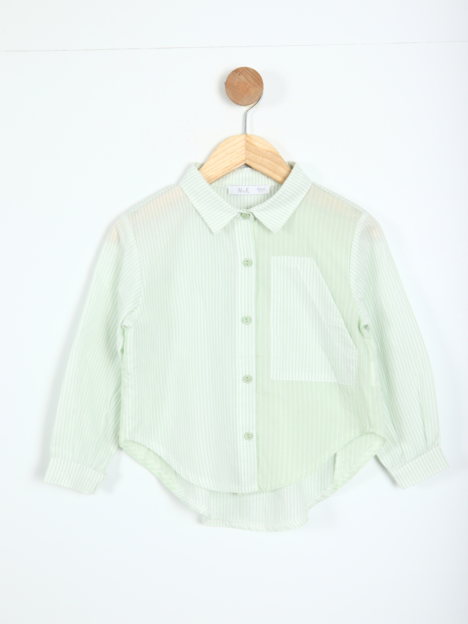 تتميز قميص الفتاة هذا بتصميم أنيق باللون الأخضر النعناعي الفاتح مع خطوط رفيعة. بأكمام طويلة وأزرار أمامية، يوفر الراحة والمظهر الكلاسيكي في آن واحد. الياقة ذات تصميم بسيط مع جيب أمامي واحد يضيف لمسة عملية. الحافة مستديرة وغير متماثلة قليلاً مما يمنح القميص مظهراً عصرياً. مصنوع من قماش خفيف وقابل للتنفس، لضمان راحة طفلتك طوال اليوم.