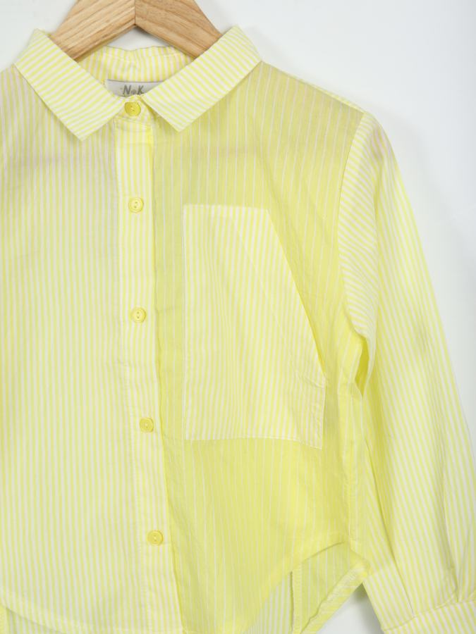 تتميز قميص الفتاة هذا بتصميم أنيق باللون الأخضر النعناعي الفاتح مع خطوط رفيعة. بأكمام طويلة وأزرار أمامية، يوفر الراحة والمظهر الكلاسيكي في آن واحد. الياقة ذات تصميم بسيط مع جيب أمامي واحد يضيف لمسة عملية. الحافة مستديرة وغير متماثلة قليلاً مما يمنح القميص مظهراً عصرياً. مصنوع من قماش خفيف وقابل للتنفس، لضمان راحة طفلتك طوال اليوم.