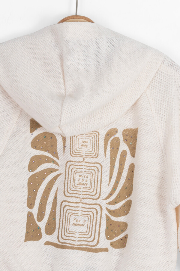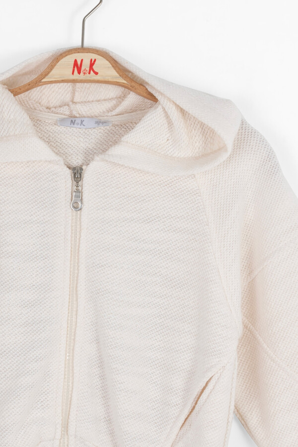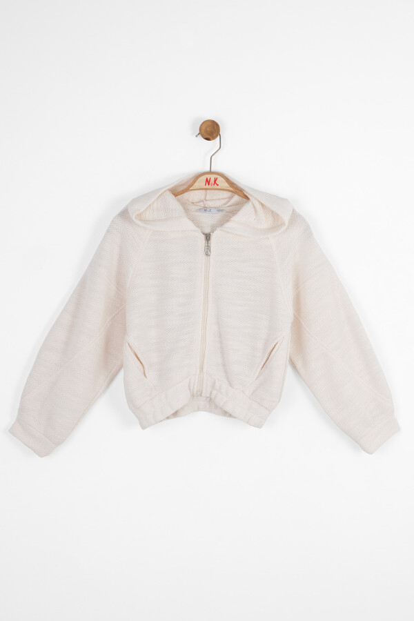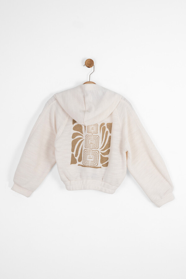 Bu krem rengi kız çocuk hırkası, soğuk kış günlerinde rahatlık ve şıklığı bir arada sunar. Kapüşonlu tasarımı sayesinde başı sıcak tutar ve pratik fermuarlı önü kolay giyilip çıkarılmasını sağlar. Uzun kollu yapısı ve elastik bel kısmı, rahat bir kullanım deneyimi sağlar. Önde cepleri vardır ve sırt kısmında modern desenlerle hareketlendirilmiş şık bir görünüm sunar. Hafif dokulu kumaşı, hem sıcak tutar hem de nefes alabilir özellikte olup çocukların hareket özgürlüğünü kısıtlamaz.