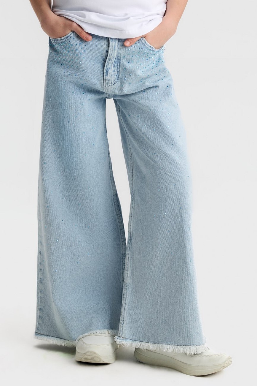 Bu kız çocuk pantolonu, bahar ayları için ideal hafif ve rahat bir seçimdir. Açık mavi renkteki geniş paça jean pantolon, modern ve şık bir görünüm sunar. Paça kısmında ve cep çevresinde yer alan küçük mavi boncuk detayları, ürüne zarif ve özgün bir hava katmaktadır. Pantolonun paça uçları salaş ve püsküllü olup, hareket özgürlüğü sağlar. Bel kısmında klasik fermuar detayı bulunmaktadır ve cepleri sayesinde kullanışlıdır. Rahat kesimi ve şık detayları ile hem günlük kullanıma hem de özel anlara uygundur.