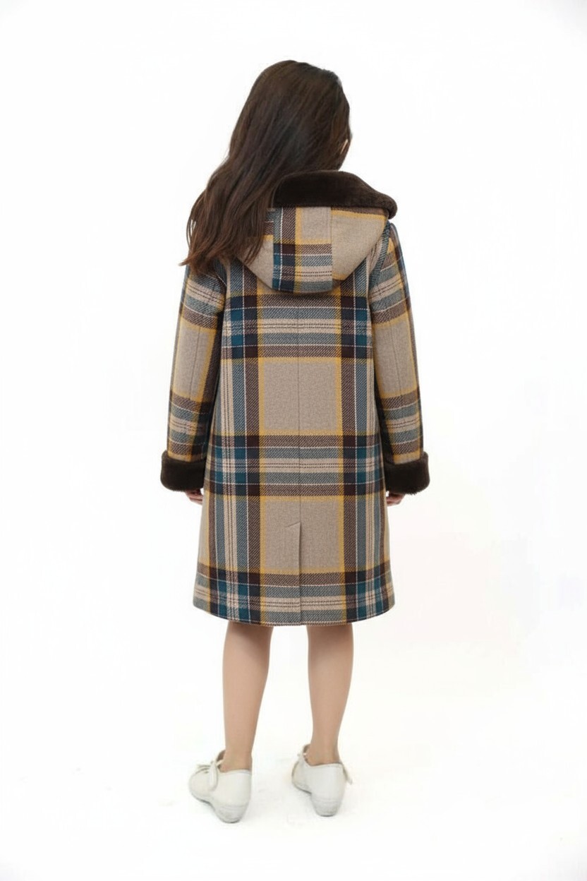 Bu kız çocuk kabanı, soğuk kış günleri için hem şık hem de sıcak tutan ideal bir seçenektir. Kapüşonlu yapısı ve büyük düğmeleriyle kullanımı kolaydır. Uzun kollu olan kaban, kol ve kapüşon kısmındaki kahverengi peluş detaylarıyla ekstra konfor sağlar. Bej zemin üzerine mavi, sarı ve kahverengi tonlarında büyük ekose desenleriyle dikkat çeker. Diz hizasında uzunluğu ve hafif genişleyen formu sayesinde rahat hareket imkanı sunar.