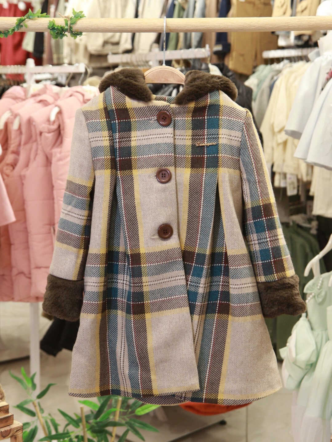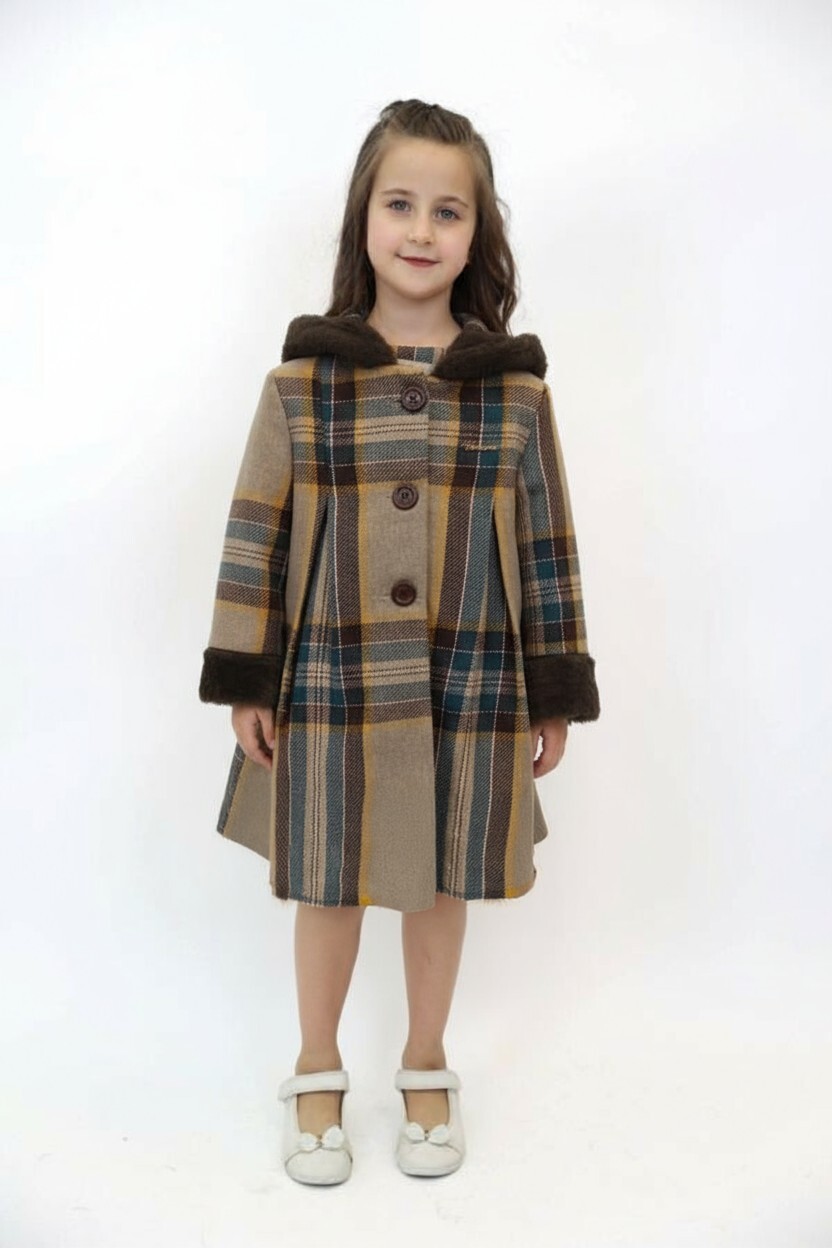 يعتبر هذا المعطف للفتيات خيارًا مثاليًا لأيام الشتاء الباردة، حيث يجمع بين الأناقة والدفء. يحتوي على قبعة وأزرار كبيرة لسهولة الاستخدام. الأكمام الطويلة مزينة بتفاصيل من الفرو الصناعي البني الناعم على الأساور والقبعة، مما يضيف راحة إضافية. يتميز المعطف بلون بيج مع نقوش مربعات كبيرة بألوان الأزرق والأصفر والبني. طوله يصل إلى الركبة وتصميمه الواسع قليلاً يوفر حرية الحركة وملاءمة مريحة.