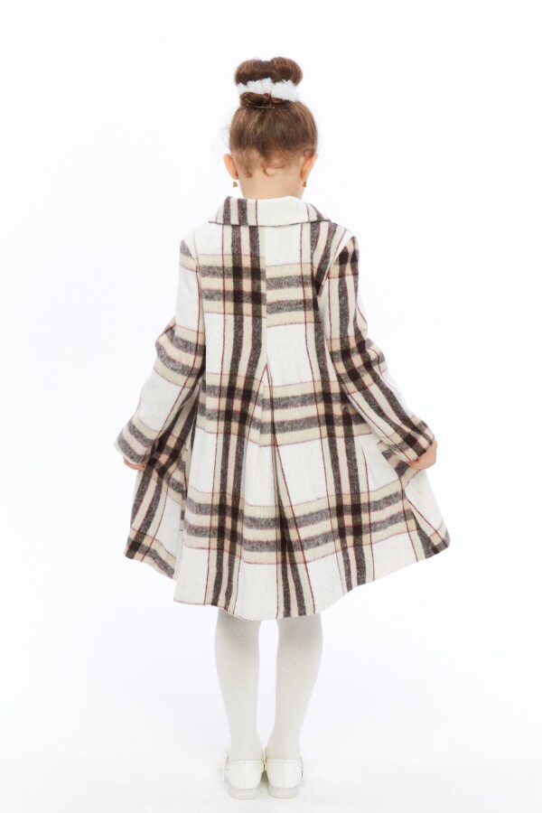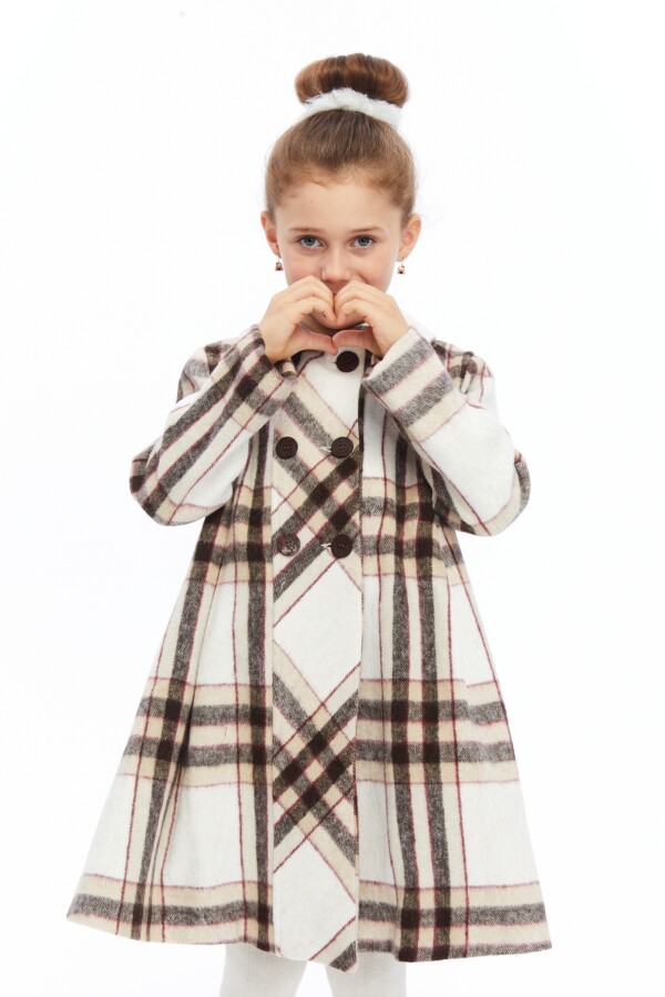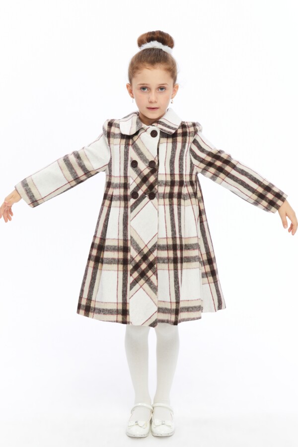 Bu kız çocuk kabanı, şıklığı ve konforu bir araya getiriyor. Kapüşonsuz, klasik yaka tasarımıyla zarif bir görünüm sunar. Ön kısmında çift sıra büyük düğmelerle kapatılan kaban, sıcak tutan kalın kumaşıyla kış ayları için idealdir. Uzun kollu ve diz hizasında midi boyu ile hem hareket özgürlüğü hem de sıcaklık sağlar. Beyaz zemin üzerinde bej ve koyu kahverengi tonlarında kareli desenleriyle dikkat çeker. Kabanın geniş kesimi ve pile detayları hareketli ve rahat bir kullanım sunar.