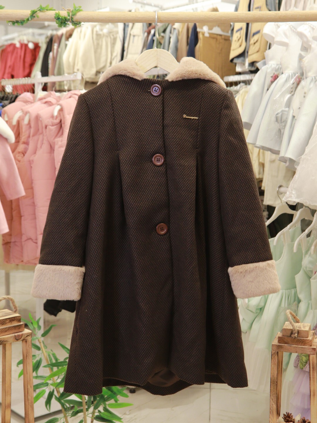 هذا المعطف للبنات يوفر خيارًا أنيقًا ودافئًا لفصل الشتاء. يأتي بلون بني دافئ وطول متوسط يضفي مظهرًا أنيقًا. يحتوي على غطاء للرأس (هود) للحماية الإضافية، مع تفاصيل من الفرو على الياقة وأطراف الأكمام لإحساس مريح. يغلق المعطف بزرار كبيرة في الأمام، مما يمنحه طابعًا كلاسيكيًا ومريحًا. تصميمه بأكمام طويلة وبدون جيوب، مما يجعله مثاليًا للاستخدام اليومي والمناسبات الخاصة.