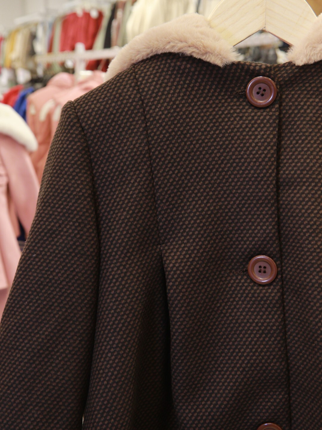 - لون بني مع تفاصيل فرو على الياقة والأكمام