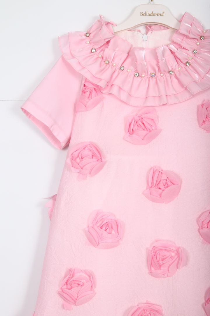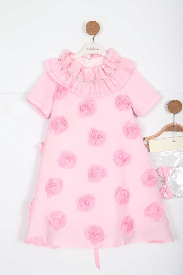 Gelince Haber VerBu şık ve zarif kız çocuk elbisesi, özel günler ve davetler için mükemmel bir tercih sunar. Pembe renkte tasarlanan elbise, kısa kollu ve midi boydadır. Farklılık yaratan en dikkat çekici özelliği ise elbisenin tamamını kaplayan üç boyutlu çiçek süslemeleri. Ayrıca, yakasında inci ve parlak taş detaylarıyla hareketlendirilmiş kat kat fırfırlar bulunur. Elbise sırtında gizli fermuar ile kolayca giyilip çıkarılabilir. Yanında aynı renkte bir saç bandı aksesuarı da hediye olarak sunulmaktadır.