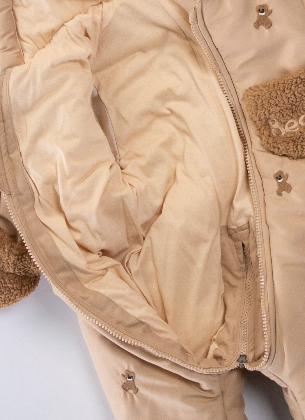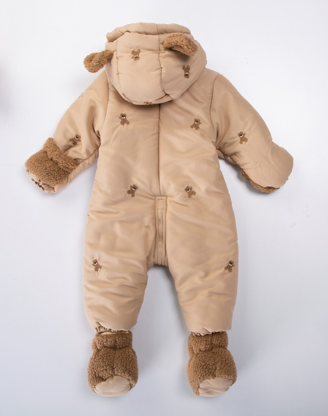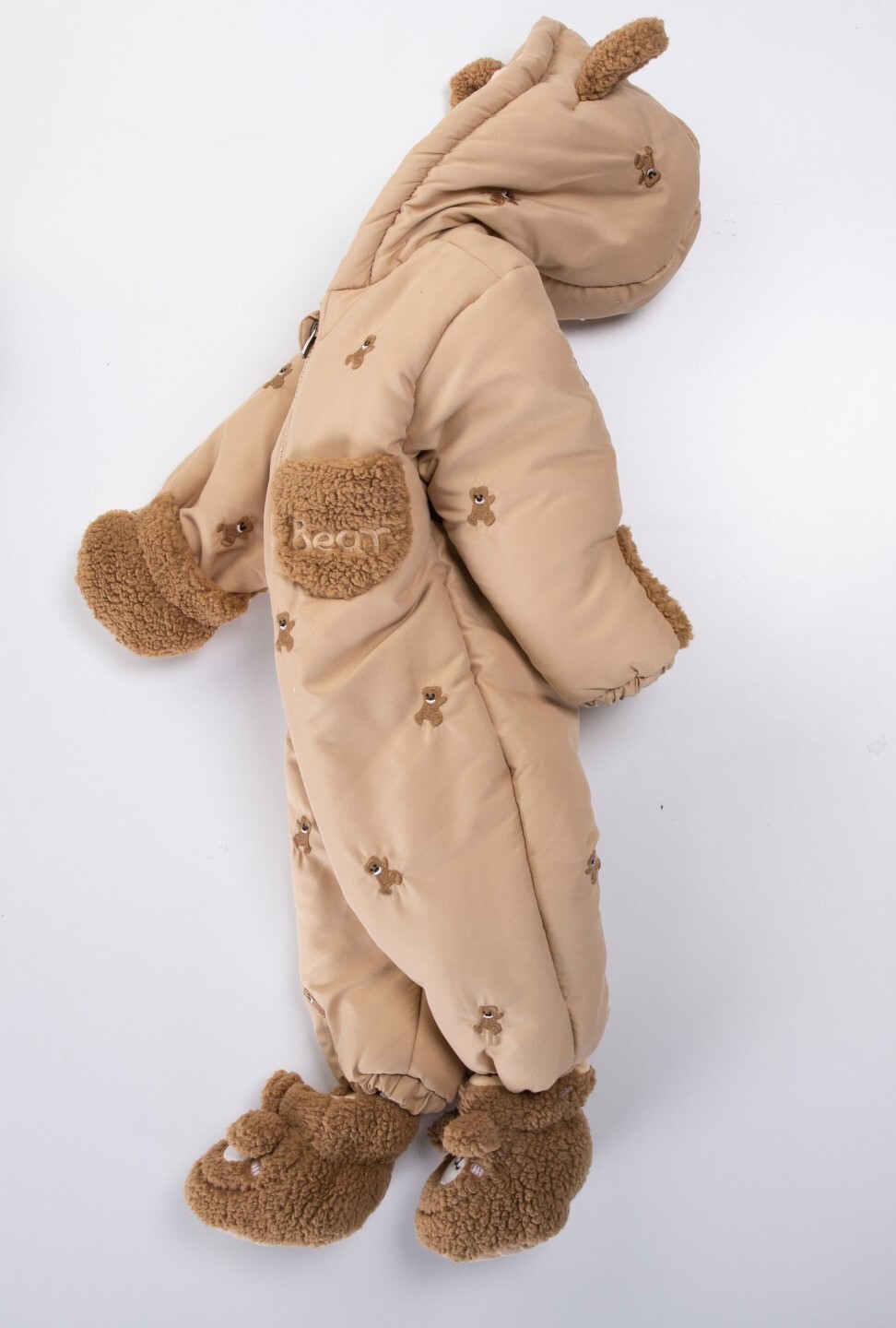 Bu kız çocuk tulumu, soğuk kış günlerinde miniklerin rahatlığı ve sıcaklığı için özel olarak tasarlanmıştır. Bej rengindeki tulum, kapüşonlu yapısı ve sevimli ayıcık kulak detaylarıyla dikkat çeker. Fermuarlı ön kapama kolay giydirme sağlar. Kol ve ayak bileklerinde yumuşak tüylü detaylar, ayrıca göğüste "bear" yazılı pelüş cep şıklık katmaktadır. Tam uzun kollu ve tam boy tasarımıyla vücut ısısını koruyarak kış ayları için ideal bir seçimdir.