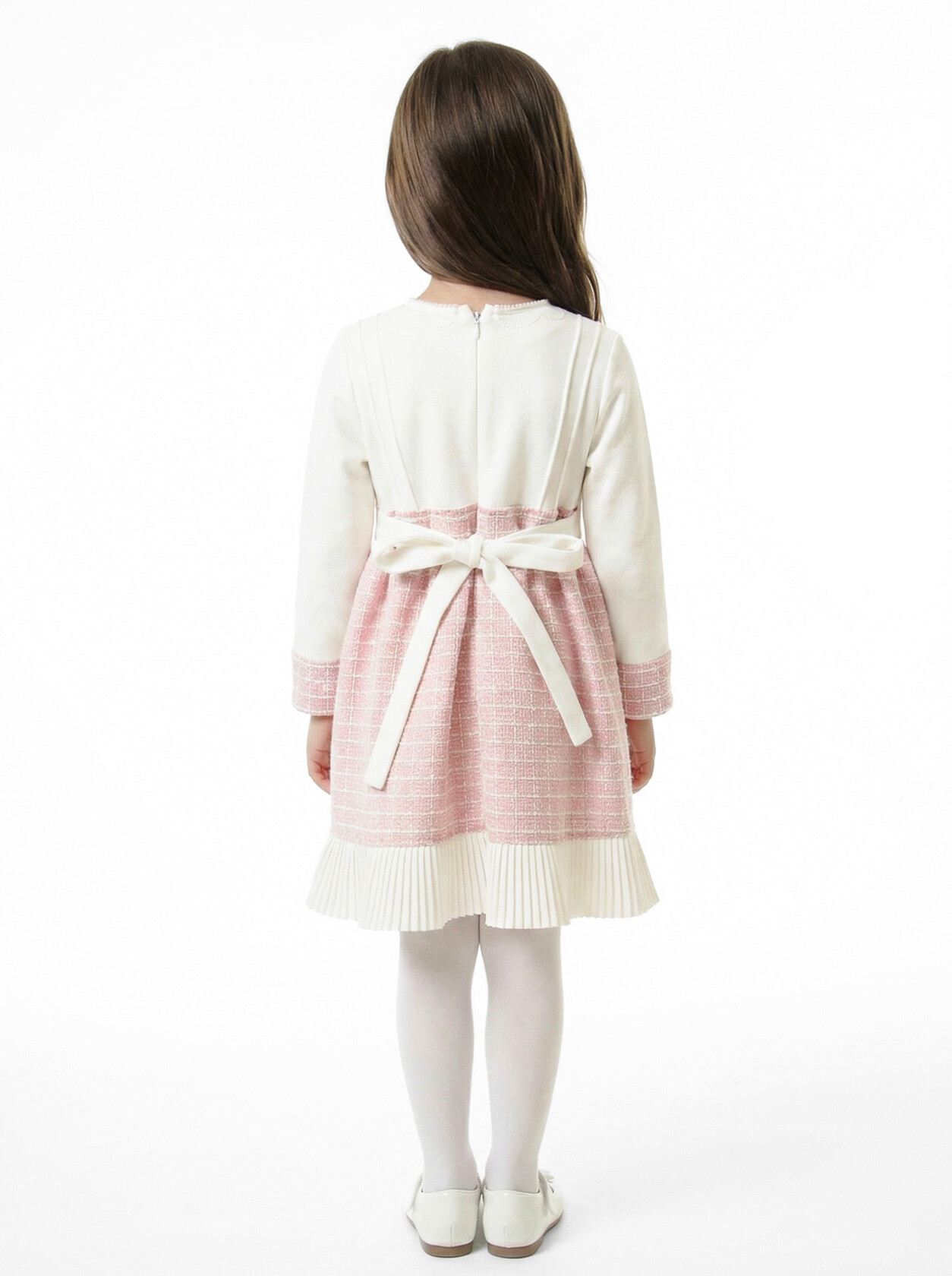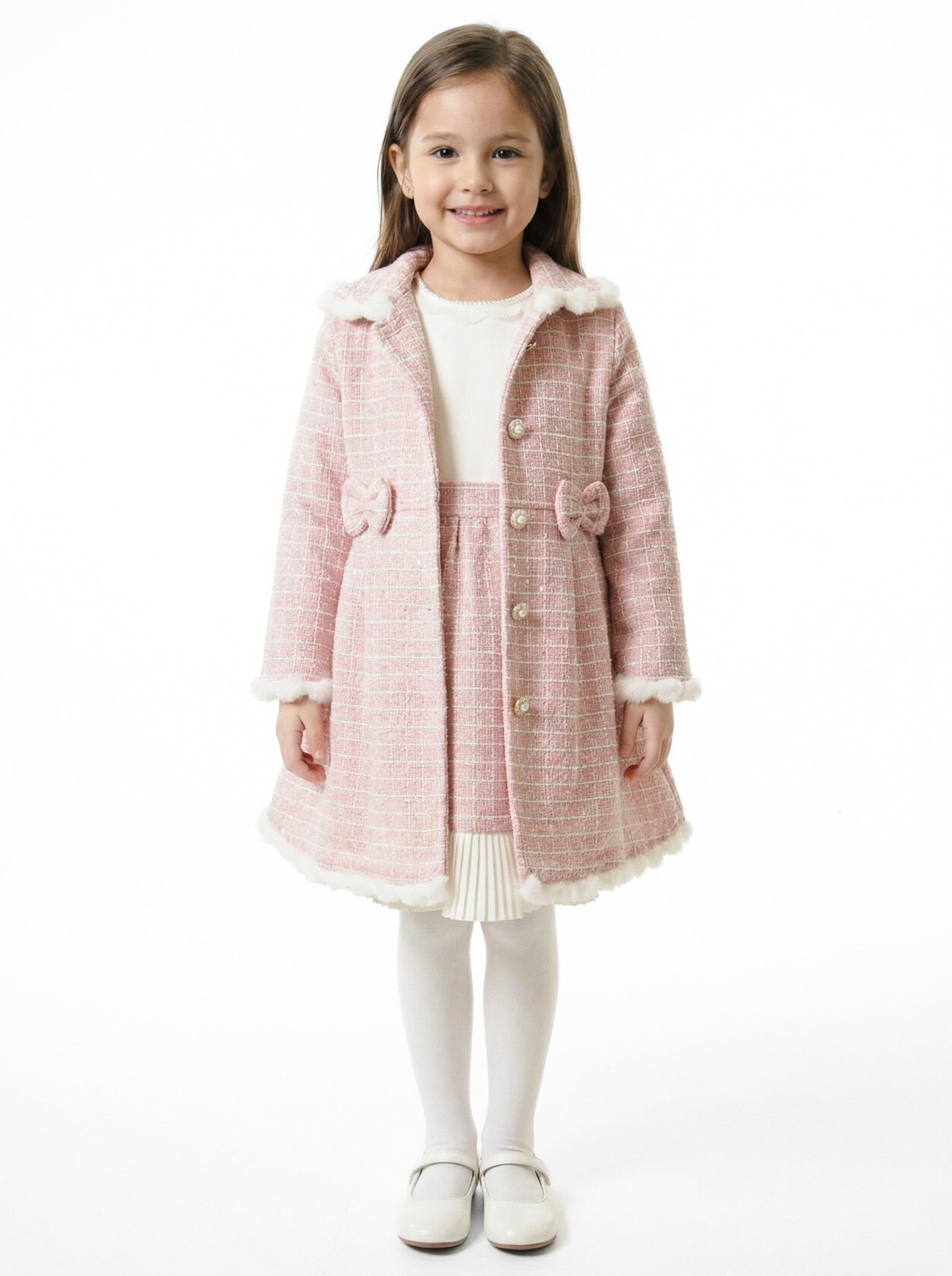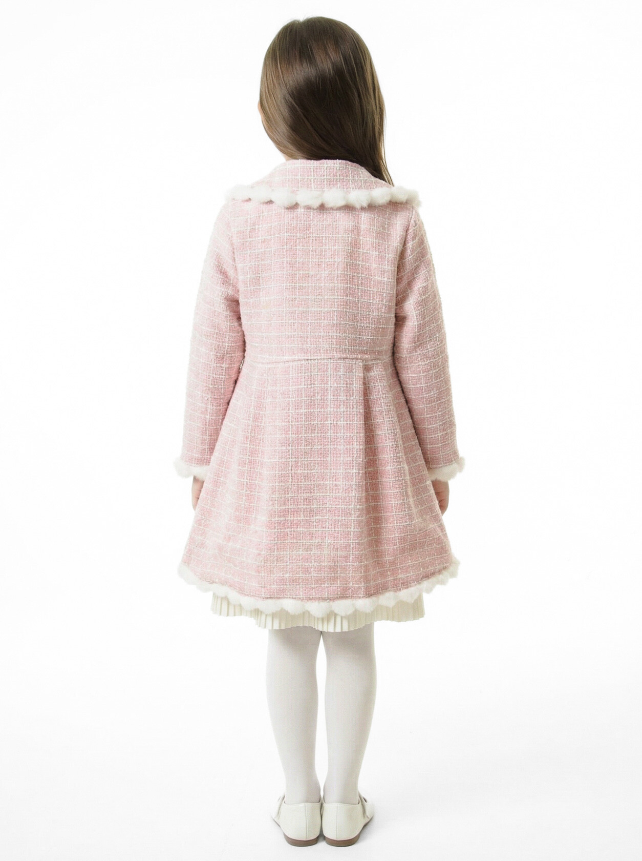 Kız Çocuk Kurdele Detaylı Parlak Kumaşlı 2'li Elbise ve Kaban Takmı 1-6 Yaş 4417 Pudra - 5
