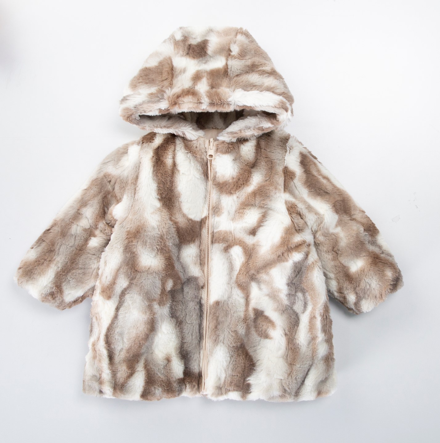 Bu kız çocuk montu, soğuk kış günlerinde miniklerinizi sıcacık tutmak için tasarlanmıştır. Bej renkte olan montun dış yüzeyi yumuşak ve pofuduk bir yapıya sahiptir. Kapüşon kısmı, kahverengi ve beyaz tonlarında peluş kumaşla kaplanmış olup ekstra sıcaklık sağlar. Mont fermuarlı olup, uzun kolludur ve rahatça giyilip çıkarılabilir. Astarı da aynı yumuşak peluş kumaştan yapılmıştır. Cepli ve kordonsuz sade tasarımı, şık ve rahat bir görünüm sunar. Midi boy uzunluğu sayesinde hareket özgürlüğü sağlar ve günlük kullanıma uygundur.