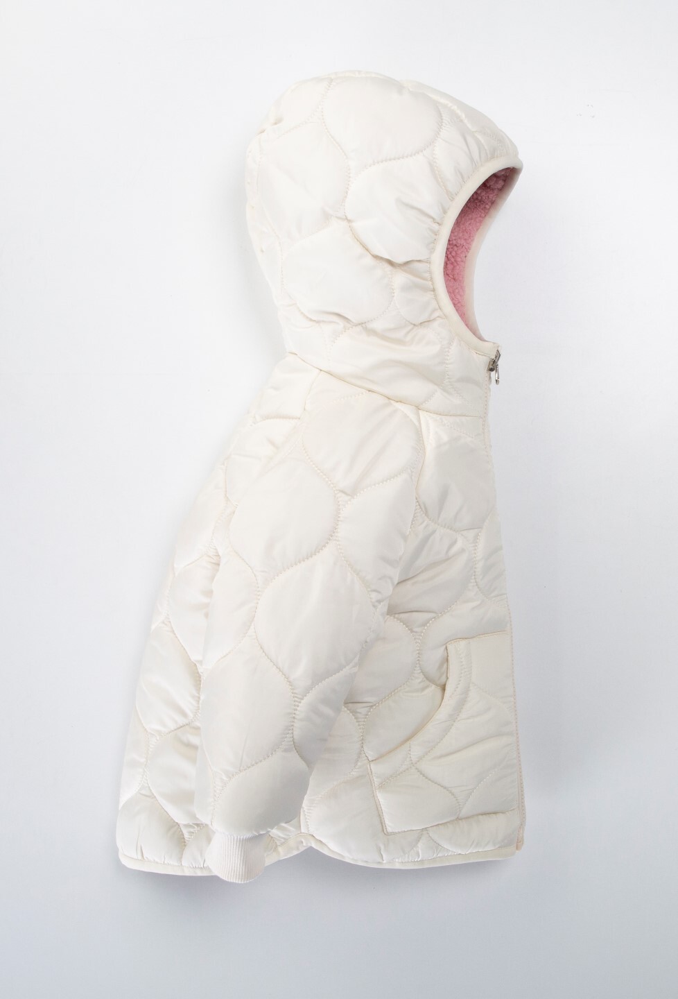 Bu kız çocuk mont, kış ayları için ideal sıcaklığı ve konforu sunar. Kapüşonlu tasarımı sayesinde baş kısmı da korunur. Ön kısmında fermuarlı kapanışı ve iki adet cepli detayı bulunur. Mont, ekru renginde olup, dış yüzeyi dalgalı dikişlerle şık bir desen oluşturur. İç kısmı ise yumuşak pembe peluş kumaşla kaplanmıştır. Uzun kollu yapısı ve bileklerde lastikli manşetleri sayesinde soğuk hava geçirmez. Rahat ve günlük kullanıma uygun, sade ve zarif bir kışlık monttur.