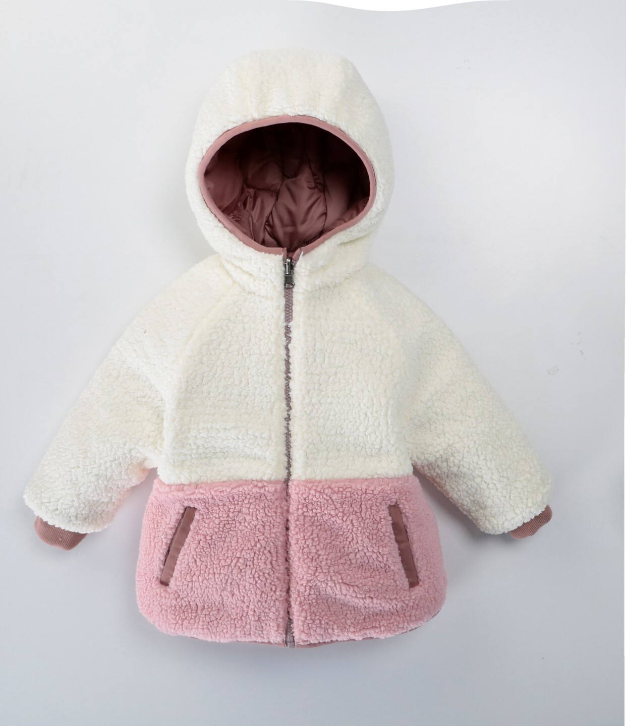 Bu kız çocuk mont, kış ayları için ideal sıcaklığı ve konforu sunar. Kapüşonlu tasarımı sayesinde baş kısmı da korunur. Ön kısmında fermuarlı kapanışı ve iki adet cepli detayı bulunur. Mont, ekru renginde olup, dış yüzeyi dalgalı dikişlerle şık bir desen oluşturur. İç kısmı ise yumuşak pembe peluş kumaşla kaplanmıştır. Uzun kollu yapısı ve bileklerde lastikli manşetleri sayesinde soğuk hava geçirmez. Rahat ve günlük kullanıma uygun, sade ve zarif bir kışlık monttur.