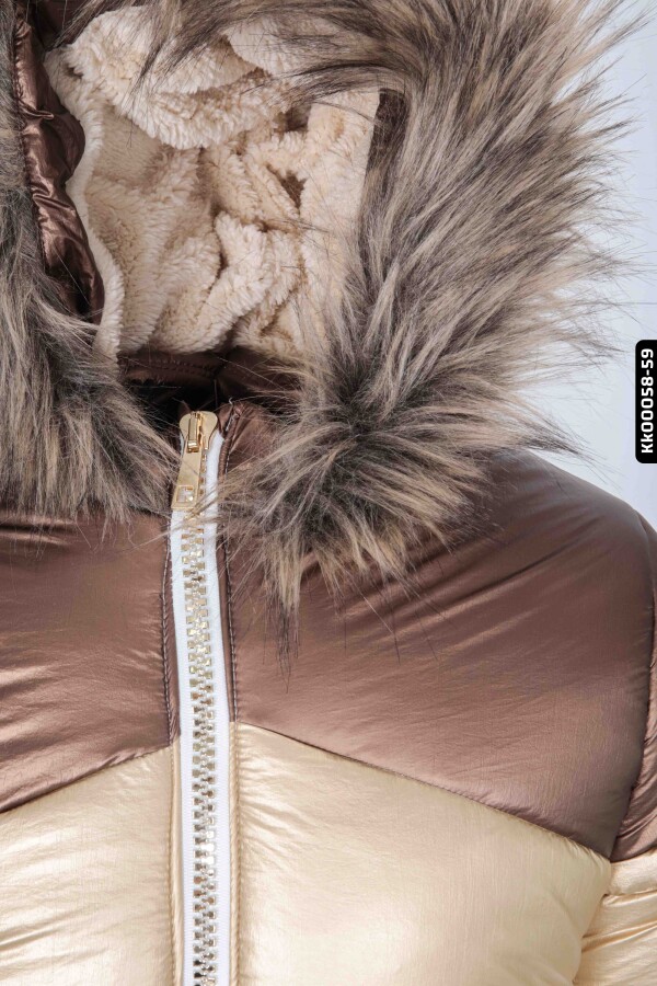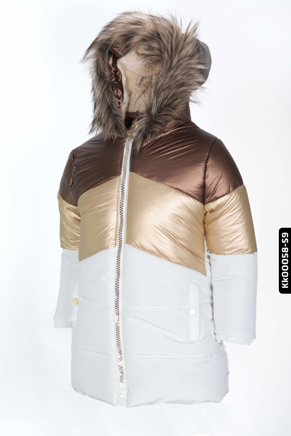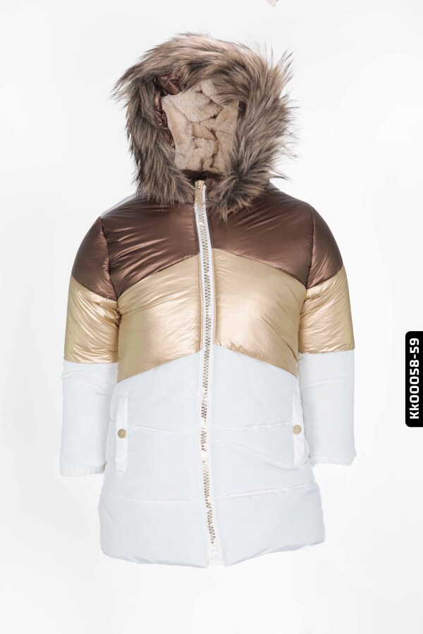 Bu kız çocuk montu, soğuk kış günlerinde miniklerinizi sıcacık tutmak için tasarlanmıştır. Kapüşonlu yapısı ve içi peluş astarı ile ekstra koruma sağlar. Mont, fermuarlı kapanışa sahip olup, kullanımı oldukça pratik ve hızlıdır. Altın, bronz ve beyaz renklerin şık bir kombinasyonu ile modern ve dikkat çekici bir görünüm sunar. Uzun kollu ve midi boy tasarımı sayesinde hem rahat hem de koruyucudur. Cepleri düğmeli detaylarla süslenmiş, böylece küçük eşyalar güvenle taşınabilir. Kapüşonun etrafındaki yumuşak ve doğal görünümlü tüy detayları montun estetik değerini artırmaktadır.