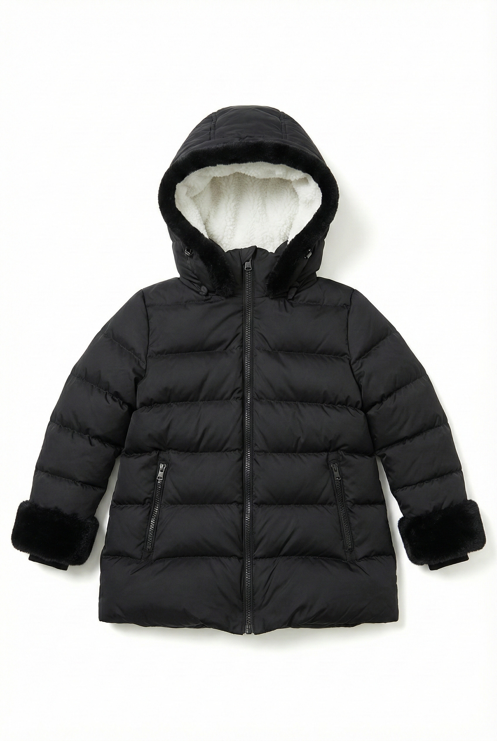 Bu kız çocuk montu, kış aylarında sıcak ve konforlu kalmasını sağlayan şık ve fonksiyonel bir üründür. Kapüşonlu tasarımı sayesinde baş ve boyun bölgesi ekstra korunur. Montun dış yüzeyi suya dayanıklı kumaştan yapılmıştır ve önünde fermuarlı kapama sistemi bulunmaktadır. İki yan cep fermuarla kapanır ve pratik kullanım sunar. İç kısmı yumuşak, peluş astarlı olup, kol manşetlerinde de peluş detaylar vardır. Uzun kollu ve diz üstü uzunluğunda olan bu mont, spor ve günlük kullanıma uygun, sade ve şık bir görünüme sahiptir.