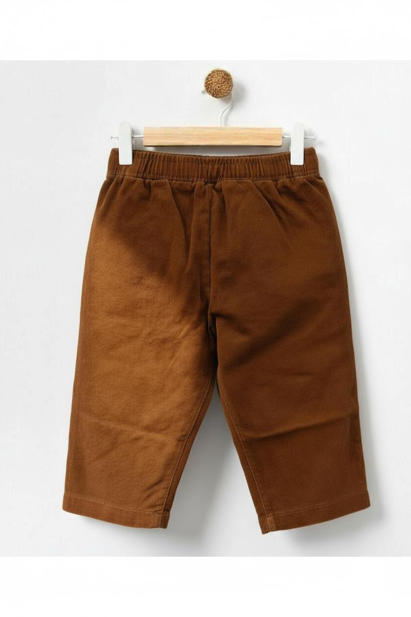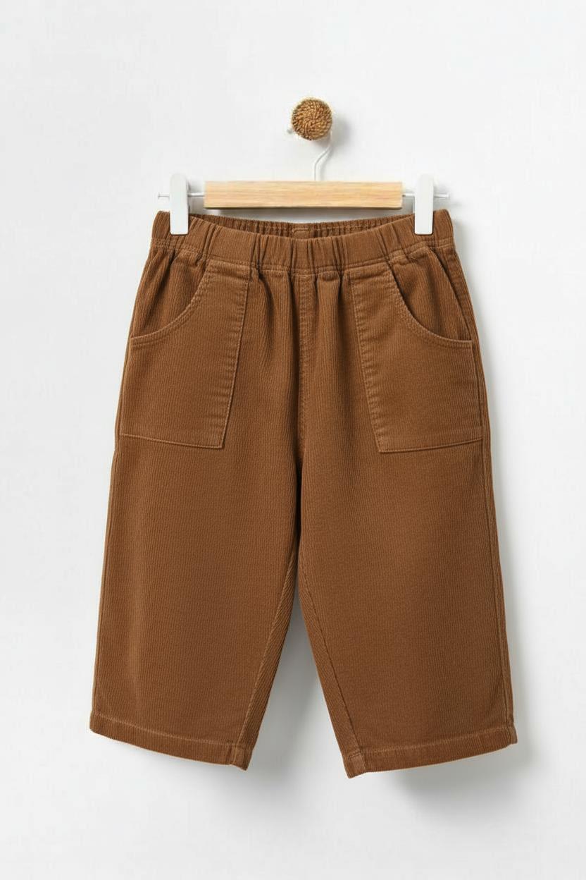 Bu kız çocuk pantolonu, kış sezonu için ideal olan sıcak ve konforlu bir seçenek sunar. Kahverengi renkte, kadife kumaştan üretilmiş olan pantolon, rahat bir elastik bel bandına sahiptir. Ön kısmında kullanışlı ve şık iki adet büyük cepleri bulunur. Diz hizasında biten midi uzunlukta ve düz kesim olan bu pantolon, günlük kullanıma uygundur ve çocukların hareket özgürlüğünü kısıtlamaz.
