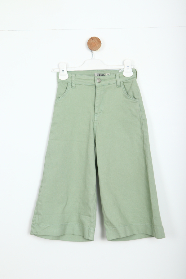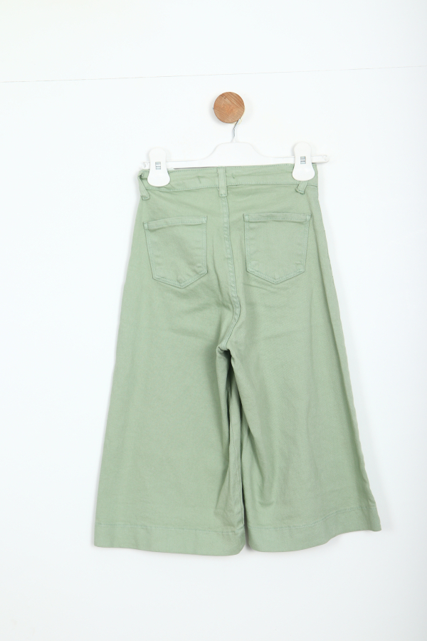Gelince Haber VerBu kız çocuk pantolonu, rahatlığı ve şıklığı bir arada sunan geniş paça tasarımıyla öne çıkıyor. Yumuşak dokusu ve hafif yeşil rengiyle günlük kullanım için ideal bir seçenek. Ön kısmında fermuar ve düğme kapama sistemi bulunurken, iki cep detayı pratiklik katıyor. Bel kısmındaki kemer halkaları sayesinde kemerle tamamlanabilir. Midi boy uzunluğu sayesinde hareket özgürlüğü sağlar ve yaz-kış kullanılabilir.