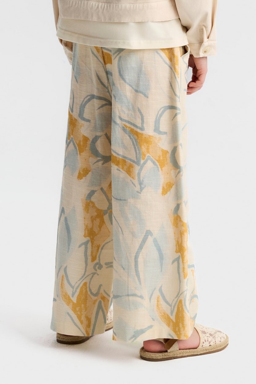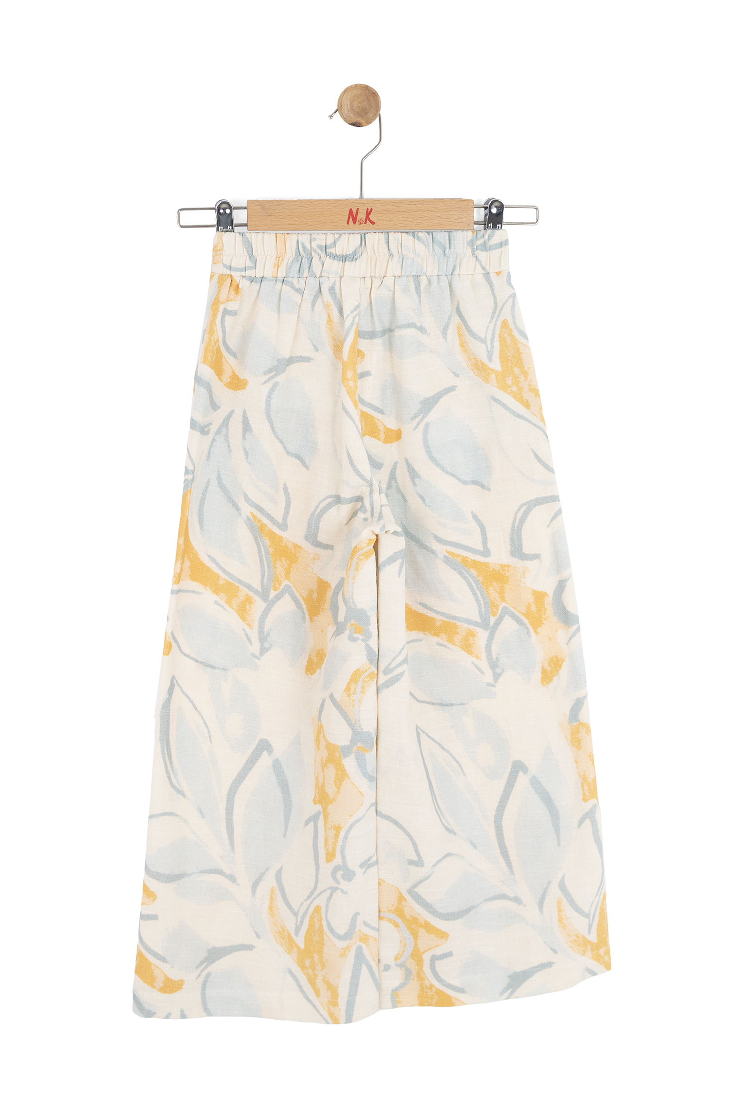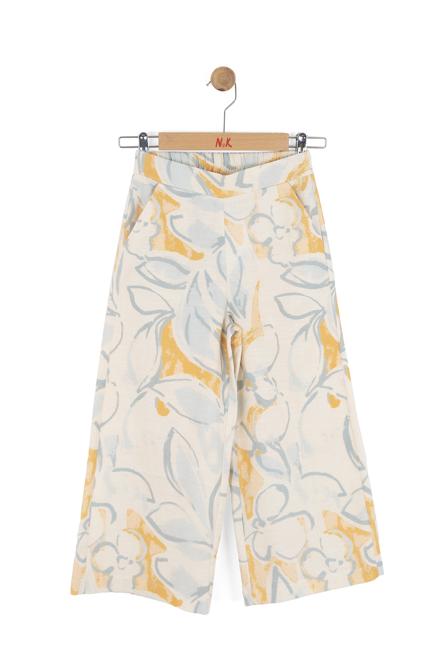 Bu kız çocuk pantolonu, bahar ayları için mükemmel bir seçimdir. Krem zemin üzerine pastel sarı ve mavi tonlarında soyut çiçek desenleriyle süslenmiş, geniş paçalı ve rahat bir tasarıma sahiptir. Bel kısmı arkadan lastiklidir, böylece hareket özgürlüğü sağlar ve rahat bir kullanım sunar. Cepleri sayesinde pratiklik kazanan bu pantolon, şıklığı ve konforu bir arada sunar.