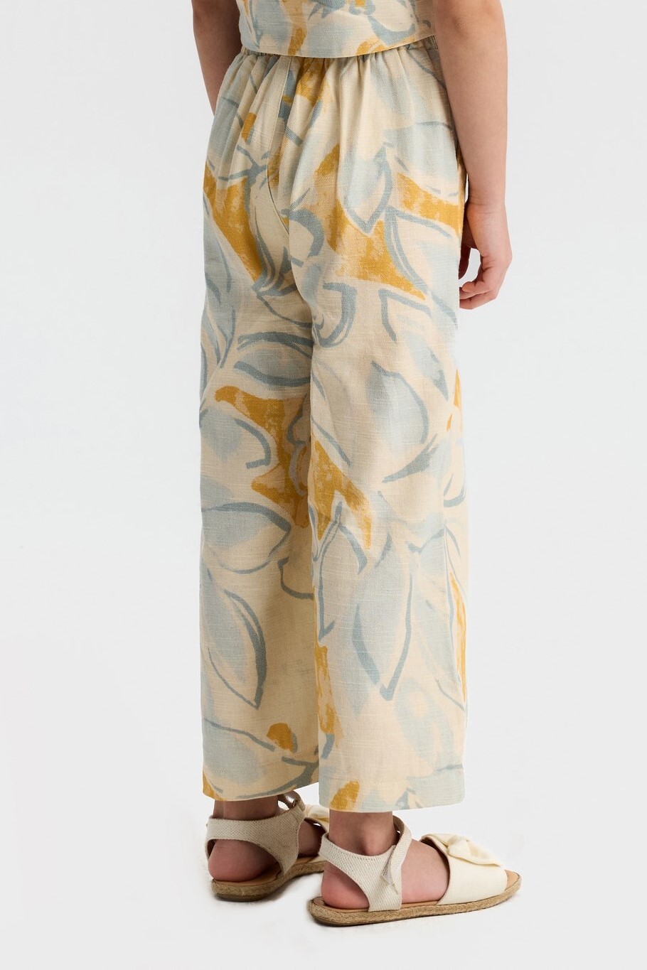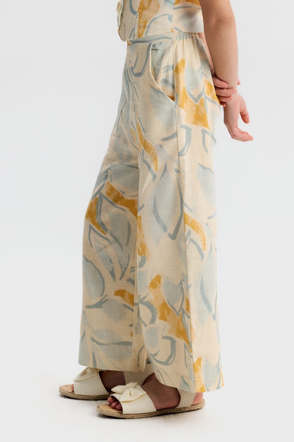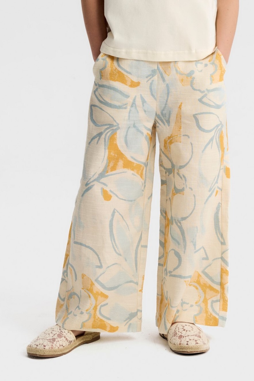 Bu kız çocuk pantolonu, bahar ayları için mükemmel bir seçimdir. Krem zemin üzerine pastel sarı ve mavi tonlarında soyut çiçek desenleriyle süslenmiş, geniş paçalı ve rahat bir tasarıma sahiptir. Bel kısmı arkadan lastiklidir, böylece hareket özgürlüğü sağlar ve rahat bir kullanım sunar. Cepleri sayesinde pratiklik kazanan bu pantolon, şıklığı ve konforu bir arada sunar.