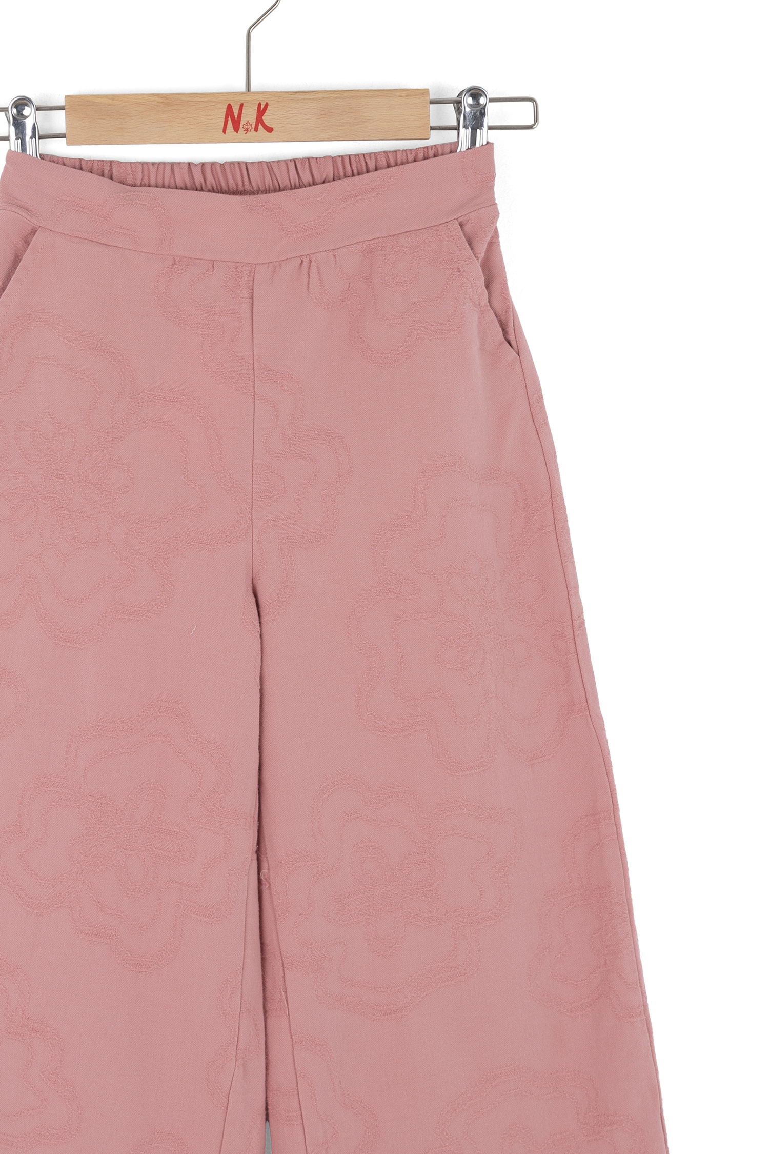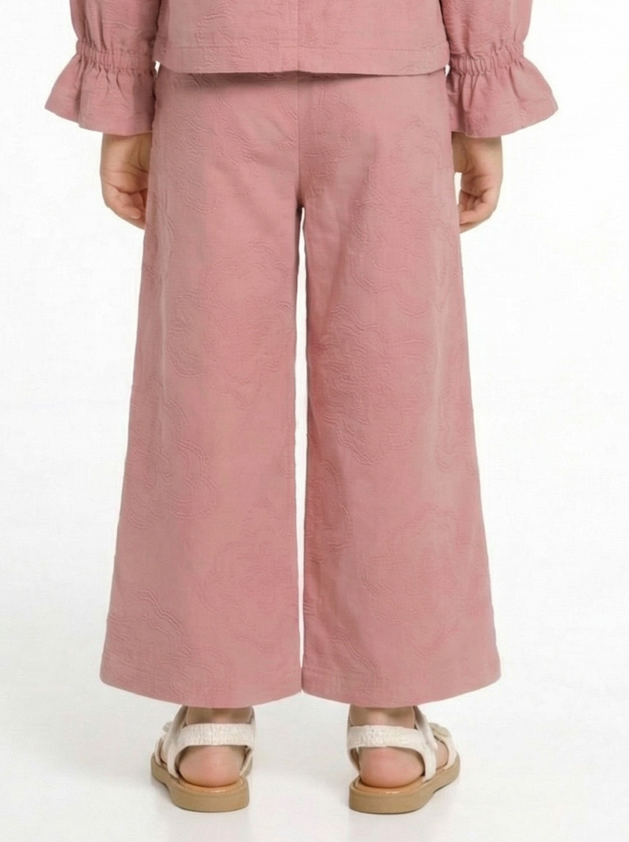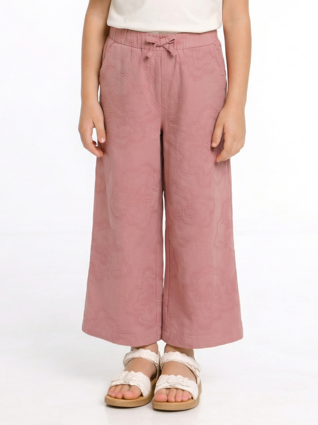Bu kız çocuk pantolonu, bahar sezonu için ideal, rahat ve şık bir seçenektir. Geniş paça kesimi sayesinde hareket özgürlüğü sunar ve modern bir görünüm kazandırır. Hafif dokulu kumaşı üzerinde zarif, kabartmalı çiçek desenleri bulunur. Yan cepleriyle pratik kullanım sağlar, bel kısmı ise lastik detaylıdır, böylece konforlu bir oturuş sunar. Nötr yeşil tonuyla kolay kombinlenebilir.