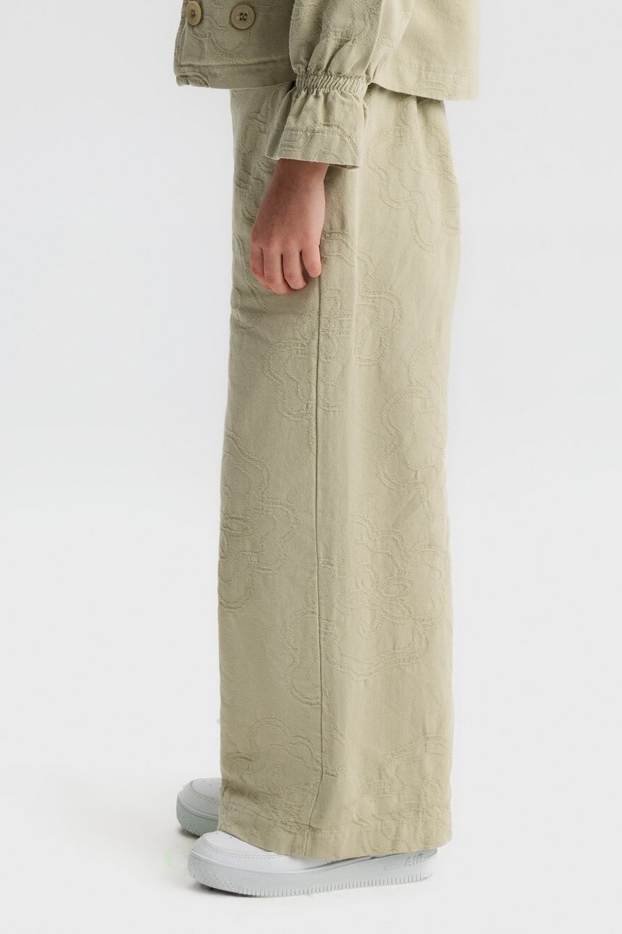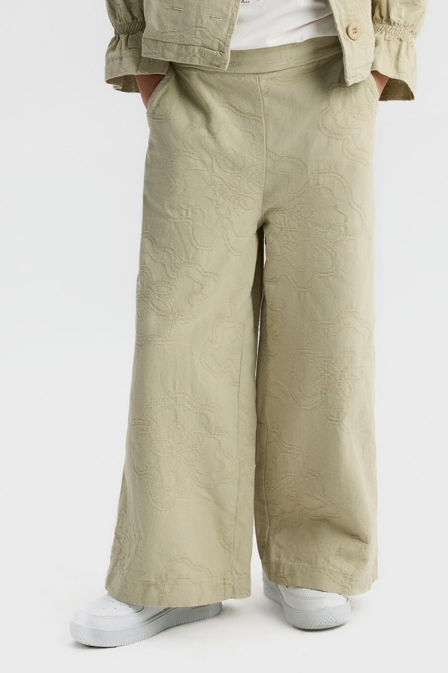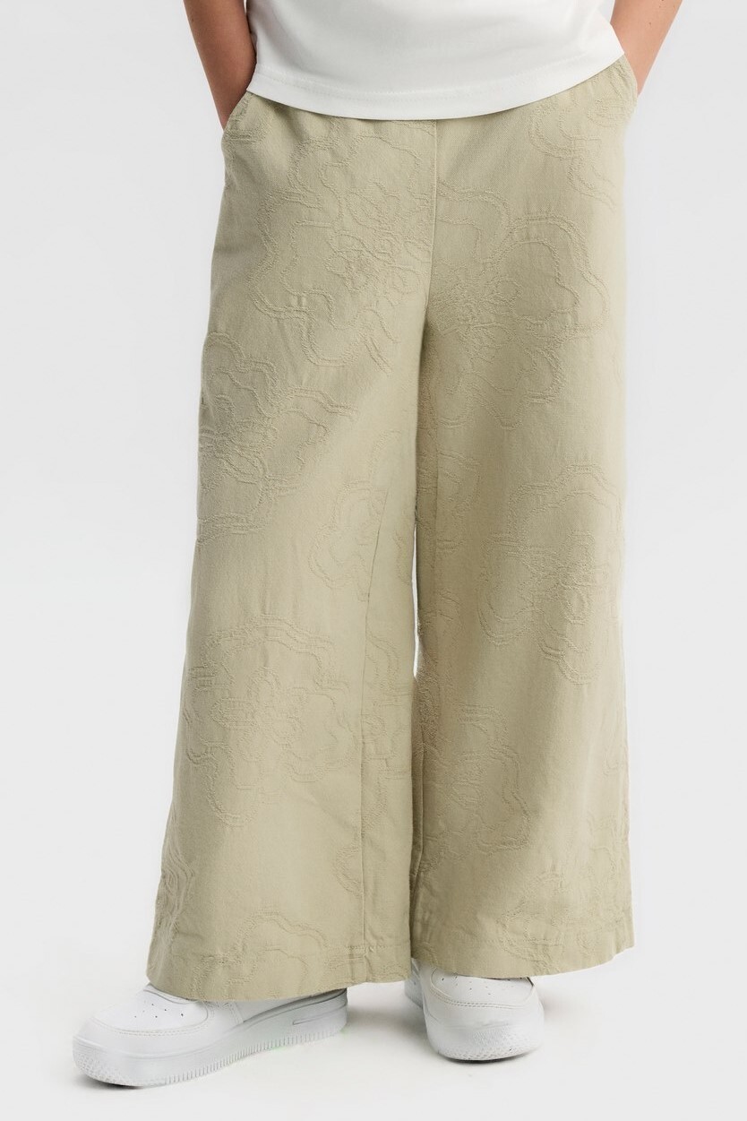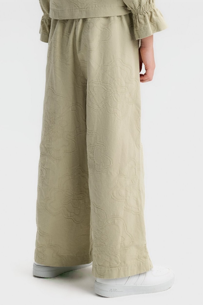 Bu kız çocuk pantolonu, bahar sezonu için ideal, rahat ve şık bir seçenektir. Geniş paça kesimi sayesinde hareket özgürlüğü sunar ve modern bir görünüm kazandırır. Hafif dokulu kumaşı üzerinde zarif, kabartmalı çiçek desenleri bulunur. Yan cepleriyle pratik kullanım sağlar, bel kısmı ise lastik detaylıdır, böylece konforlu bir oturuş sunar. Nötr yeşil tonuyla kolay kombinlenebilir.