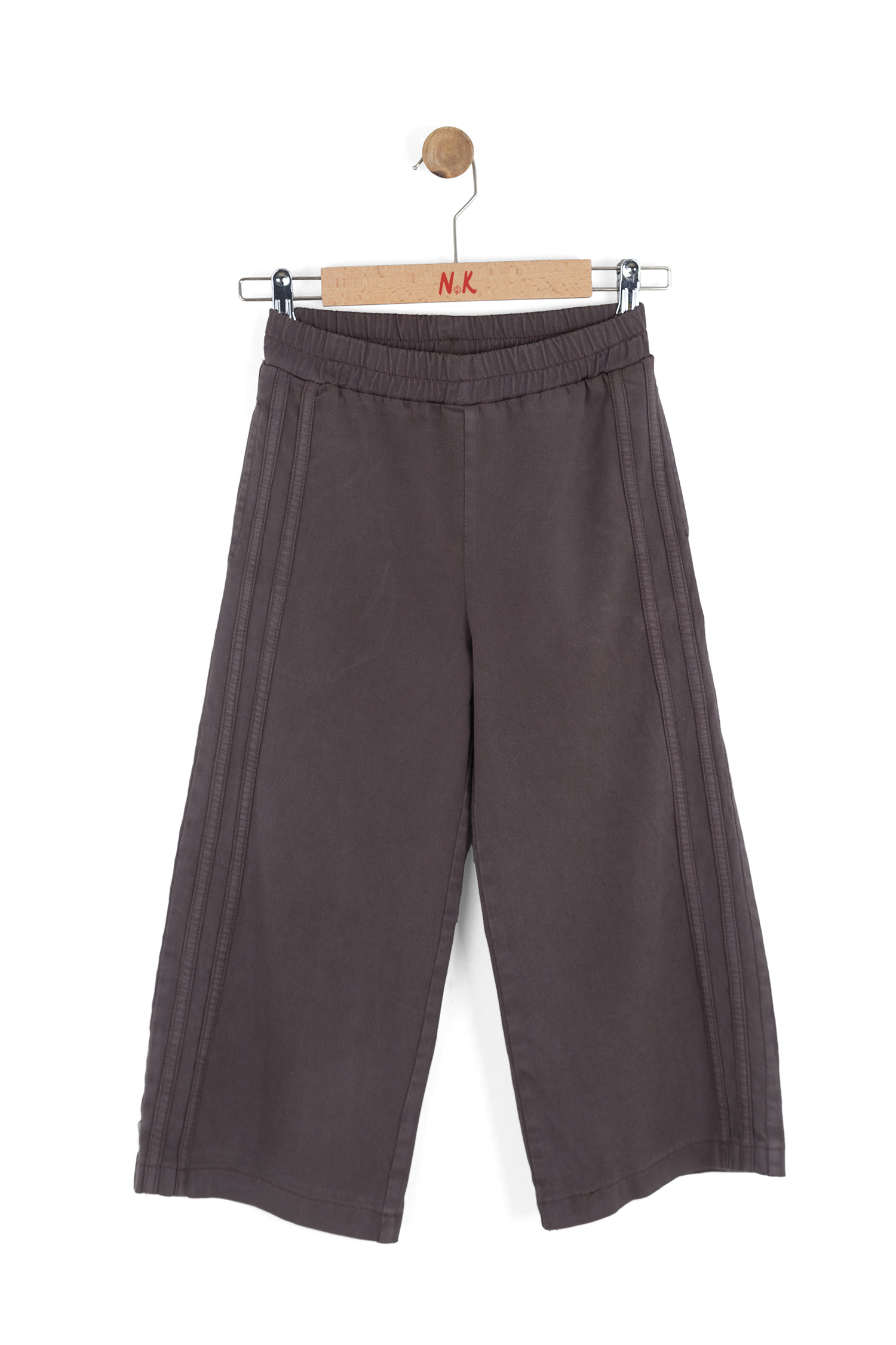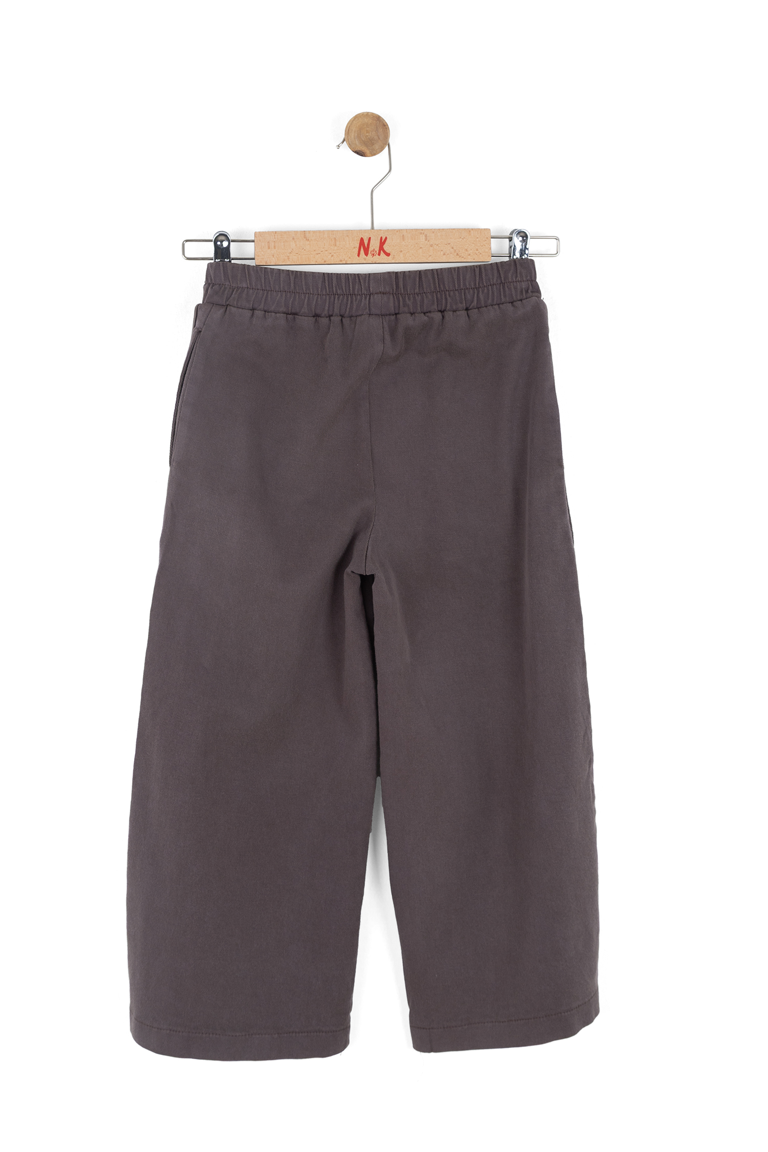 Bu kız çocuk pantolonu, rahat ve şık tasarımı ile bahar aylarında kullanım için idealdir. Kahverengi renkte olan pantolon, geniş paçalı ve bol kesimdir. Bel kısmında esnek lastik bulunmaktadır, böylece çocukların hareket özgürlüğü kısıtlanmaz. Yanlarda belirgin dikiş detayları vardır ve pantolon ceplidir. Fermuar veya düğme bulunmamaktadır, kolayca giyilip çıkarılabilir. Kısa veya uzun tişörtlerle rahatlıkla kombinlenebilecek sade ve spor bir modeldir.