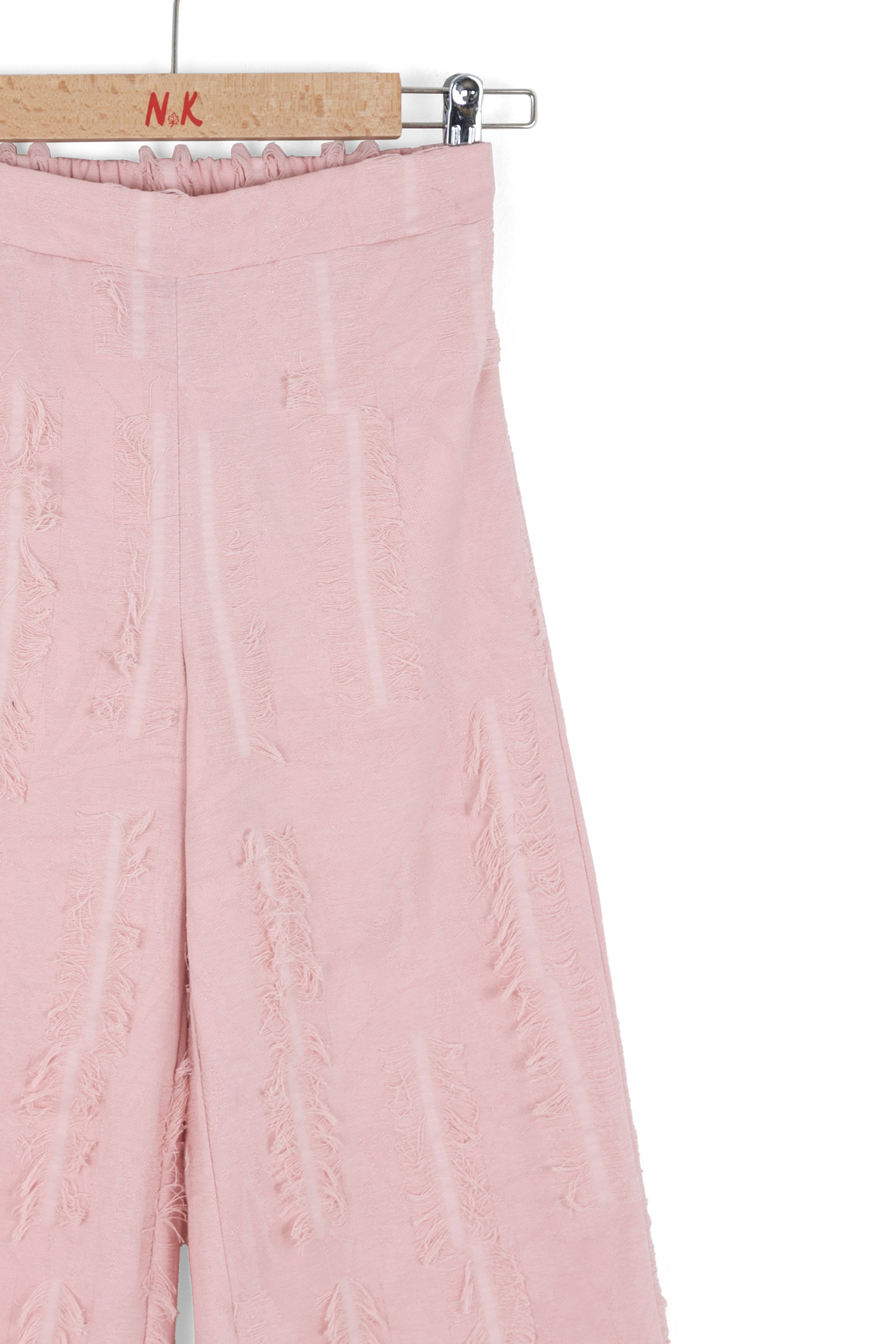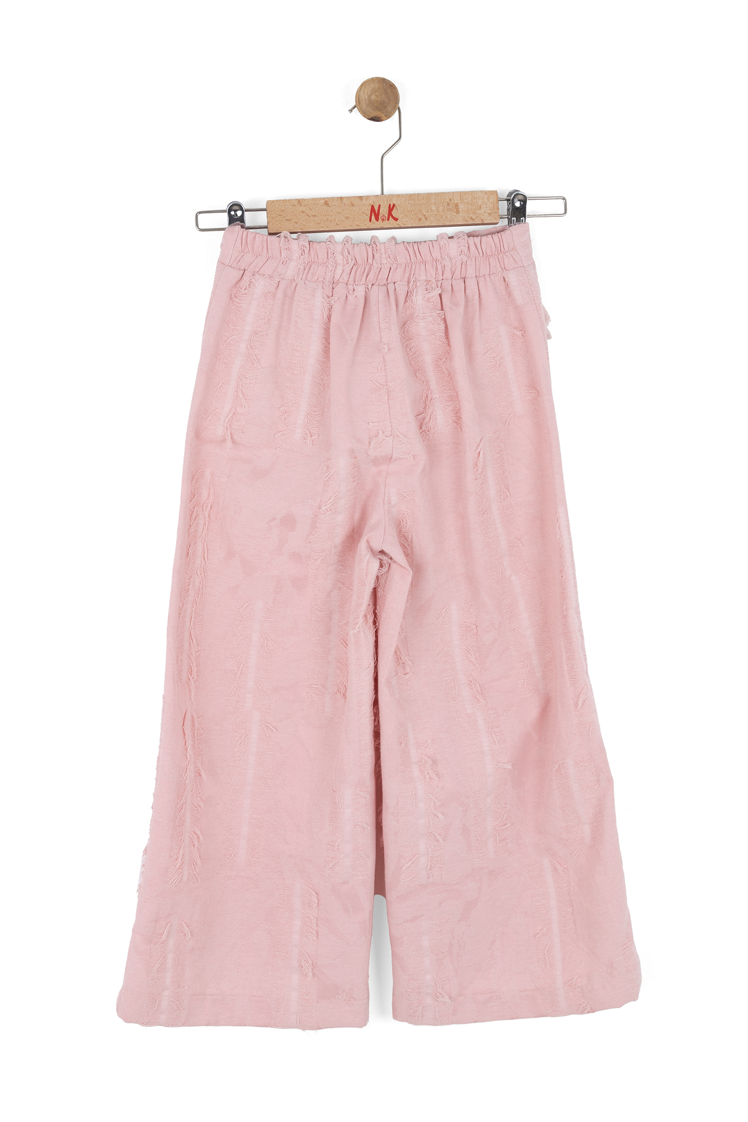 Bu kız çocuk pantolonu, bahar sezonu için ideal olan hafif ve rahat bir tasarıma sahiptir. Pudra renginde, geniş paça kesimiyle hareket özgürlüğü sunar. Pantolonun dikkat çeken özelliği, yüzeyindeki dikey yırtık detaylarıdır; bu detaylar hem modern hem de şık bir görünüm sağlar. Bel kısmı elastik olup, çocukların kolayca giyip çıkarmasına olanak tanır. Günlük kullanımda spor ayakkabılarla mükemmel uyum sağlar.